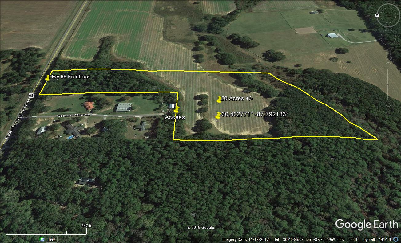 This property has access from highway 98 frontage and also second access along Pleasant View Lane. The property offers an estimated 5 acres of beautiful matures oaks and pines located on the north side of the property fronting highway 98 that would be a wonderful place for horses or building a nice residential home. The center of the property offers an estimated 8 acres of agriculture cleared ground that would be great for pasture area, residential home location, dove hunting or continued agriculture ground. The south backside of the property offers and estimated 7 acres of additional wooded area that would be another special location for a residential home site with its beautiful matures oaks and pines continued. It’s a must-see if you’ve been looking to own that country style acreage while being conveniently located to the beautiful Alabama Gulf Coast and other Baldwin southern charm areas. Call today for more information about this property or to schedule your private land tour.