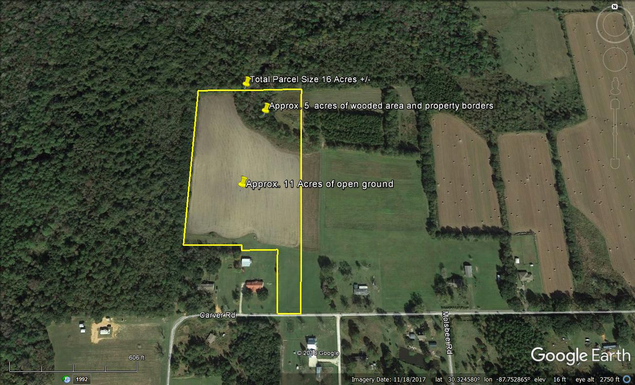 Looking for some nice acreage for a residential home, horse farm or agriculture potential, check out this tract of land located within close proximity of the Alabama Gulf Coast and other nearby coastal cities. This property is nestled close to the quaint neighborhood of Bon Secour and offers approximately 11 acres of open ground and 5 acres of wooded area and border areas on the west side of the property. Currently being farmed for agriculture, this property has nice paved road frontage along Carver Road, with power running along the road as well. Take advantage of the frontage along Carver Road or settle in on a spot that is tucked away a little on the acreage. Providing a quieter neighborhood feel, this property would offer some great opportunities for building a residential home while working your horses in a country-style setting.