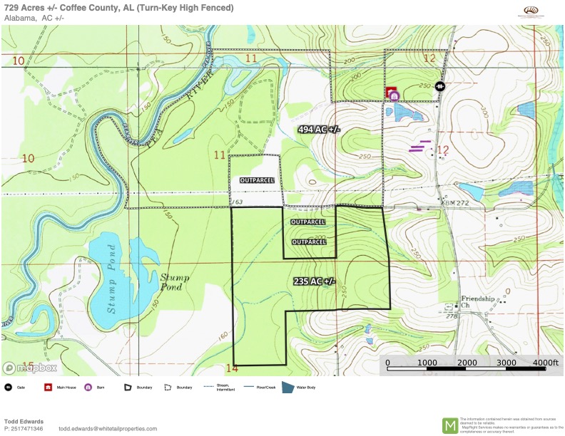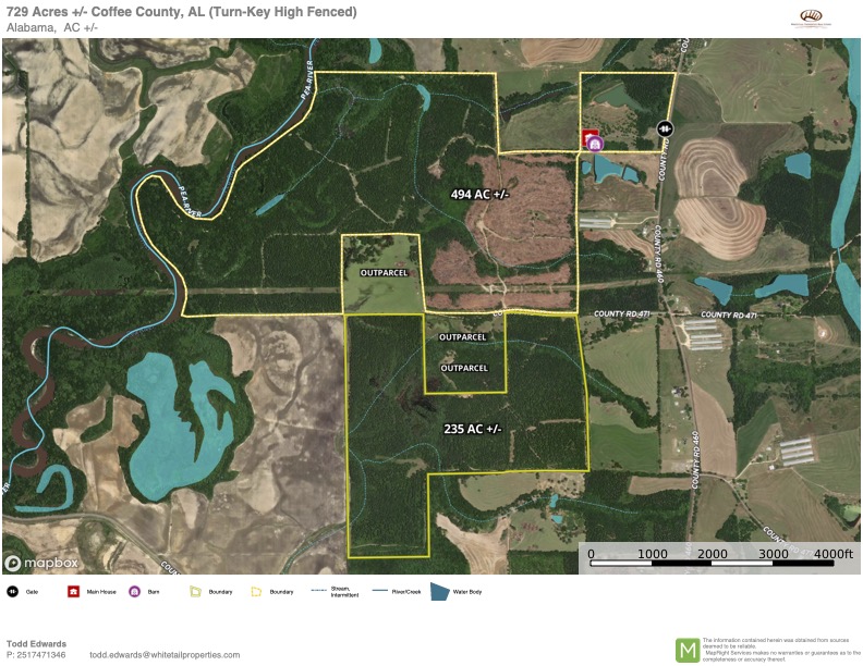 This turn-key retreat is nestled along the Pea River. A superb high-fenced Whitetail and Turkey Hunting property that is turn-key and move-in ready. Starting with the spacious lodge facilities that consist of a 5000 square foot barndominium that has all the conveniences of home, along with a large shop area. The living quarters offers six bedrooms and five bathrooms and is very well laid out for private and guest enjoyment. The bardominium will come furnished with the exception of a few personal items. The shop area has plenty of space for friendly gatherings and offers room for your bad boy buggies, utility vehicles, game cleaning area, walk-in cooler and much more. The equipment barn for this property offers covered space for all your equipment and deer feed storage, along with covered overhangs for keeping your equipment out of the weather. The equipment package is well planned and fits your needs for maintenance and upkeep. The fishing lake is estimated at three and one-half acres and is 29 feet deep at the dam, stocked with tiger bass and shell cracker bream, making for some very nice family or guest enjoyment. The screened dock house and floating dock area allows for special mornings and evening while enjoying the lakeside setting. The land is made up of upland pine timber areas, along with hardwood bottoms along the river. With a nice range of diversity, this property has been timber managed for the game. Recently having a portion of the pines cut and replanted in longleaf pines, helping to provide some nice bedding and habitat for the whitetail deer for future years. The stand of mature loblolly pines and remaining hardwood acreage provide plenty of cover and travel corridors for the game. With the way you access this property, the private entry, lodge and lake area sits on approximately 44 acres on the northeast side of the property and allows for complete seclusion for the remaining 685 acres of high-fenced property. The high fence is separated into two sections and is divided by a county road for very nice access. The north section along the river is estimated at 450 acres under a high fence and the south section is estimated at 235 acres under a high fence. This allows for hunting the farm in two sections and also controlling your deer herd when you have guests or hunters in camp. The local genetics are just superb on this farm and the owners have kept the deer on an extensive high protein feeding plan with quality ADM feeds year-round. Plenty of food plots with custom box stands, along with gravity feeders throughout the property that will remain. Call today to learn about this amazing hunting property.