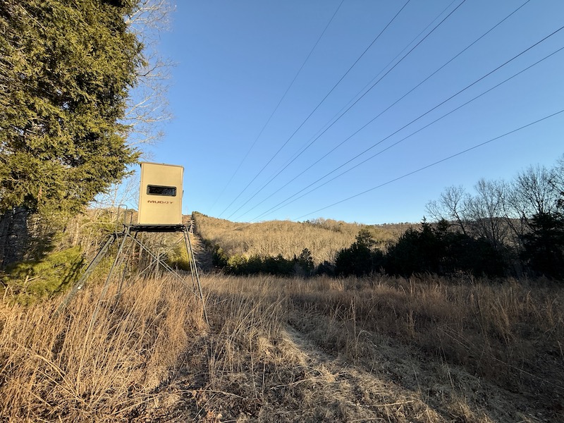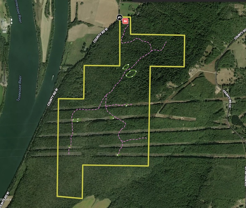 The property includes distributed food plot areas that allow for multiple hunting setups across the tract. The ridge serves as a travel corridor between agricultural areas in the river bottom, which supports deer and turkey populations in the region. The layout of the property allows for multiple hunters to utilize different areas simultaneously.