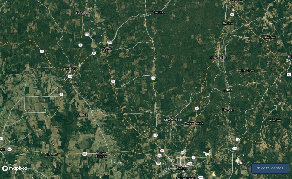 - Roughly 20 minutes northwest of Selma & east of Marion