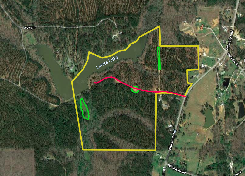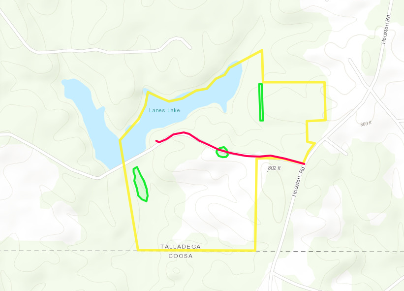 If you have had dreams of building a home or cabin overlooking water this is an outstanding property featuring a 23 +/- AC lake. Accessed from Houston Road, you’ll have a flat gravel driveway leading through a forest of mature pines back to the edge of the lake. There are over 2500’ feet of shoreline that you will own and many natural building sites that would take advantage of the views out over the water. The lake is well stocked with bass and bluegill and you have access to fish the entire lake. Canoeing and paddle boarding would also be fun activities for your family. The timber is a mix of mature pines on the upland areas and big mature hardwoods in the bottoms, and streamside management zones, making an excellent variety for wildlife habitat and timber investment. Three food plots are established and I saw 6 hens and 2 deer in the same food plot when I was photographing this property. The hunting is very good in this area. There are roads and open rows through the pines that would make excellent walking trails gaining you access throughout the interior of the forest. This tract could be ideal for developers with numbers of home/cabin sites that could be divided and take advantage of all the waterfront. A family could also consider it as a multiple home property that would be a private oasis in a gorgeous setting. The sunrises and sunsets over the lake are spectacular and so peaceful out on your own private side of the lake. Located only a few minutes from Hwy 280, the drive to Birmingham, Auburn or Montgomery is convenient. Please let us know when you would like to schedule a private showing of this gem of a property, home and additional acreage adjacent to this property is also available.