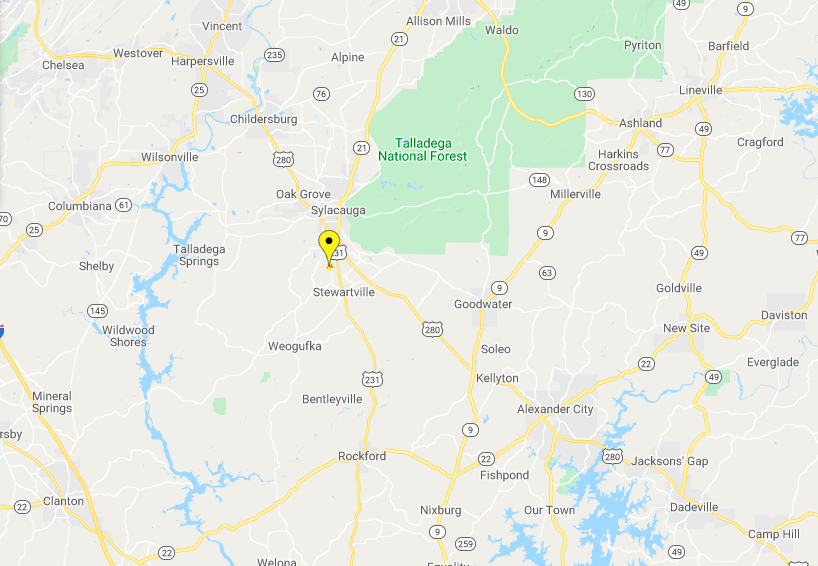 - Driving distance approximate minutes: Birmingham 0:50, Auburn 1:00, Montgomery 1:10, Sylacauga 0:08