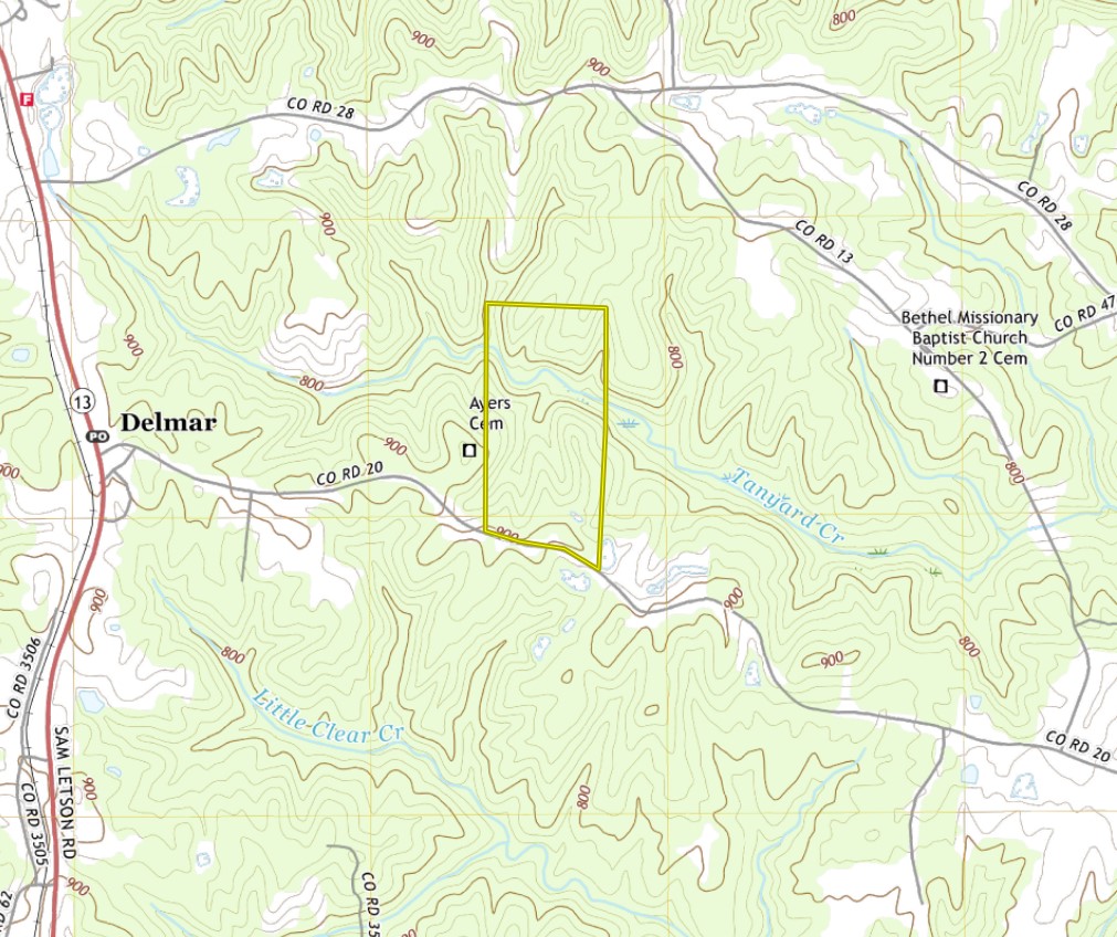 The outstanding views and wildlife on this tract make it perfect for someone that is interested in hunting, hiking, or just being in nature. It is easily accessible by paved county road frontage with city water and electricity available, and it is only 5 miles away from amenities in Haleyville. There is a trail system that provides access for hunting and to all of the improvements on the property, including a small pond that could be easily expanded to create a private fishing lake. There are already two food plots, the largest being a quarter acre. They could be easily expanded and there is room to add more. This area of Alabama is known for its deer hunting due to re-stocking of northern deer in the early 1900s. The result is excellent hunting and a relatively early rut. Along with deer, we also found where turkeys have been scratching for acorns under the mature oaks in the northern end of the property. This part of the property features Tanyard Creek, which winds from west to east through the property. Here you will find why Winston County is considered an undiscovered gem. Streams flow between the ridges and create 2 separate waterfalls after a steady rain. Underneath the waterfalls are rock formations that create cave-like overhangs where the temperature drops dramatically during the summer and provides a place to cool off. Massive rock walls along the creek provide absolutely outstanding views that must be seen to appreciate. Walk along this creek and you will feel like you are in the Bankhead National Forest, which is only a few miles away from this property. Building a remote cabin back here would be any outdoor enthusiast's dream! On the north side of the creek is 25 acres of mature hardwoods which provide hard mast for wildlife in the fall, and the ridges are covered in deer sign. The views, water features, wildlife, and improvements make this tract truly unique. There is additional acreage available directly across the road. Please contact Spenser Bradley or Jake Pinholster if you are interested, we would be happy to take you on a private tour to show you all that it has to offer!