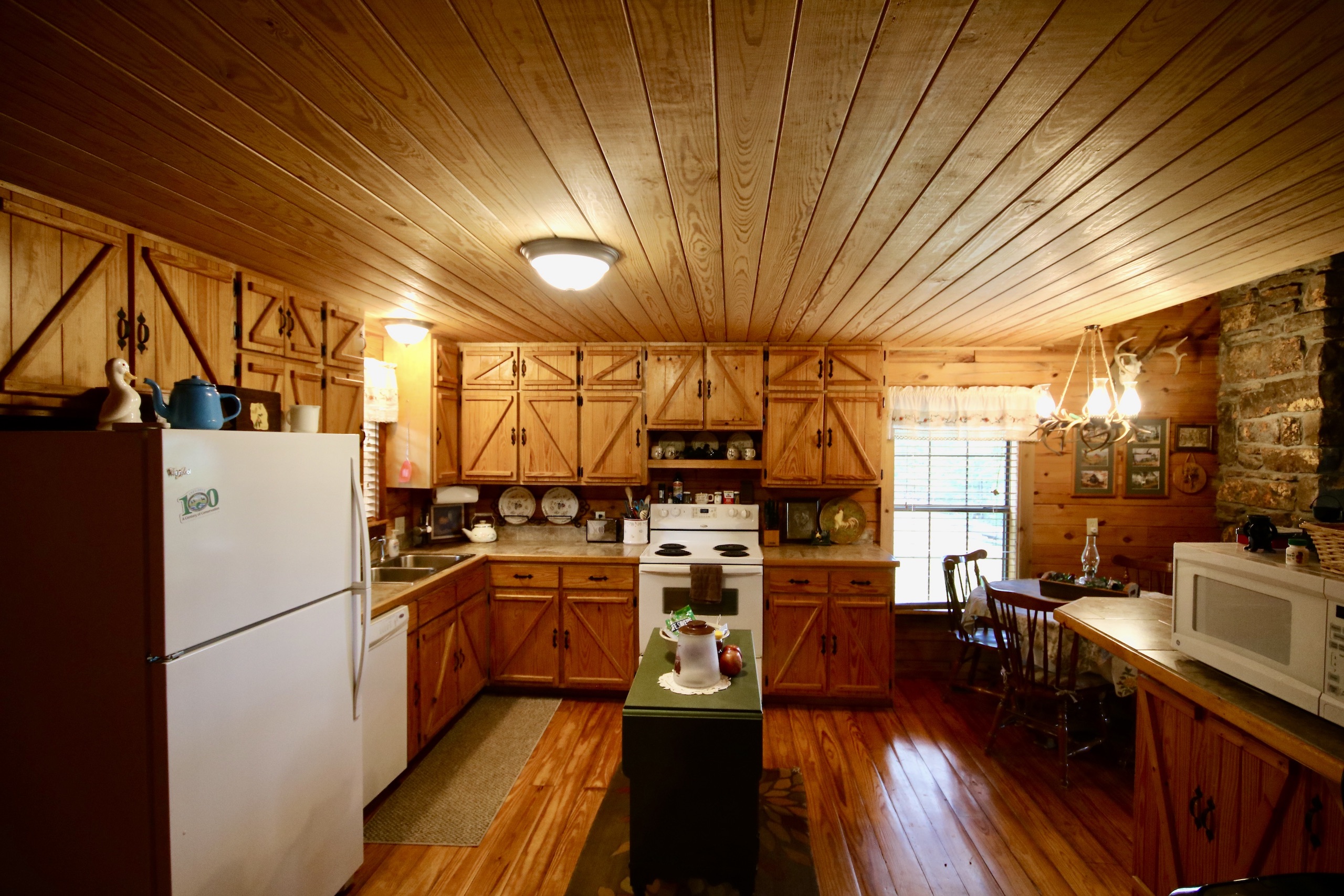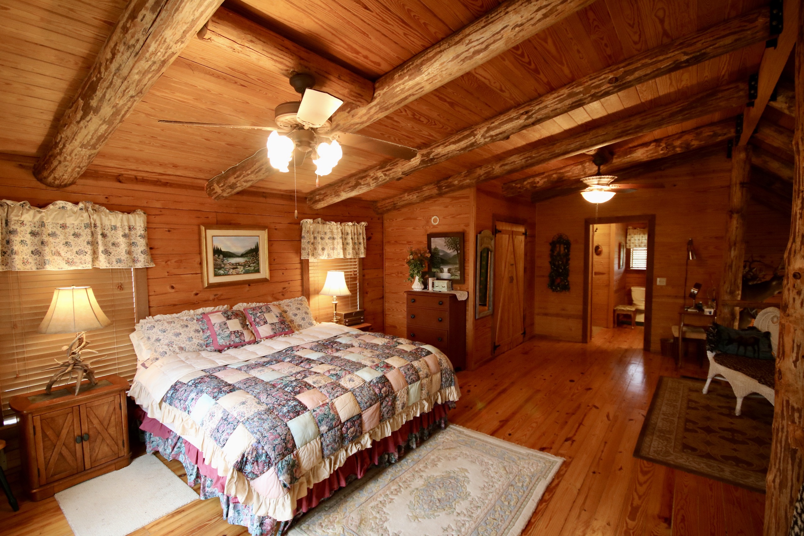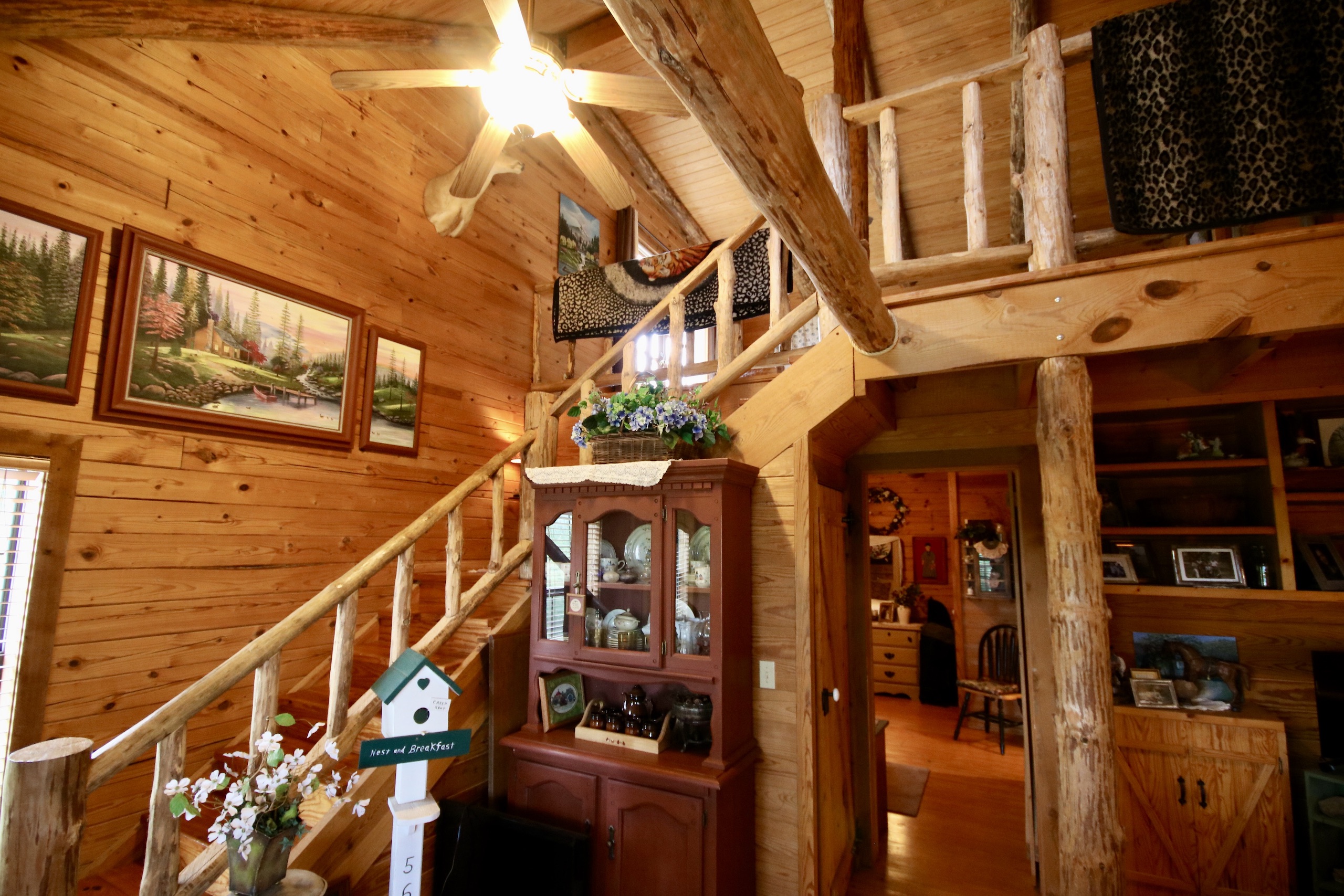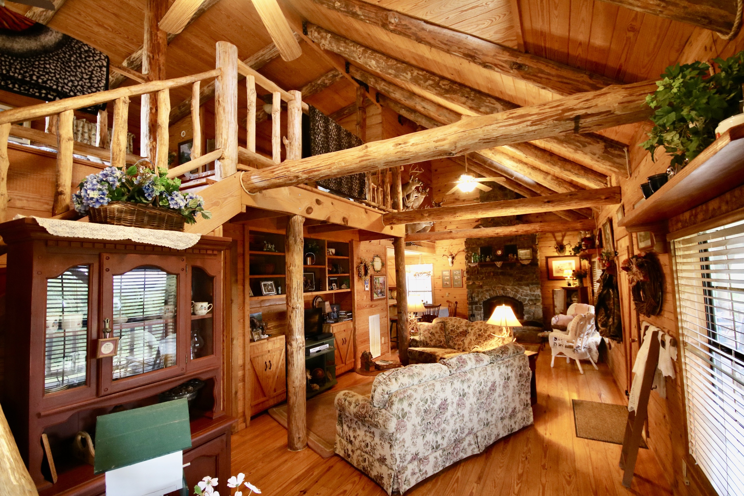 - Cabin offers a large open floor plan, custom-built rock fireplace, amazing woodwork, one bedroom with additional sleeping upstairs and two full baths