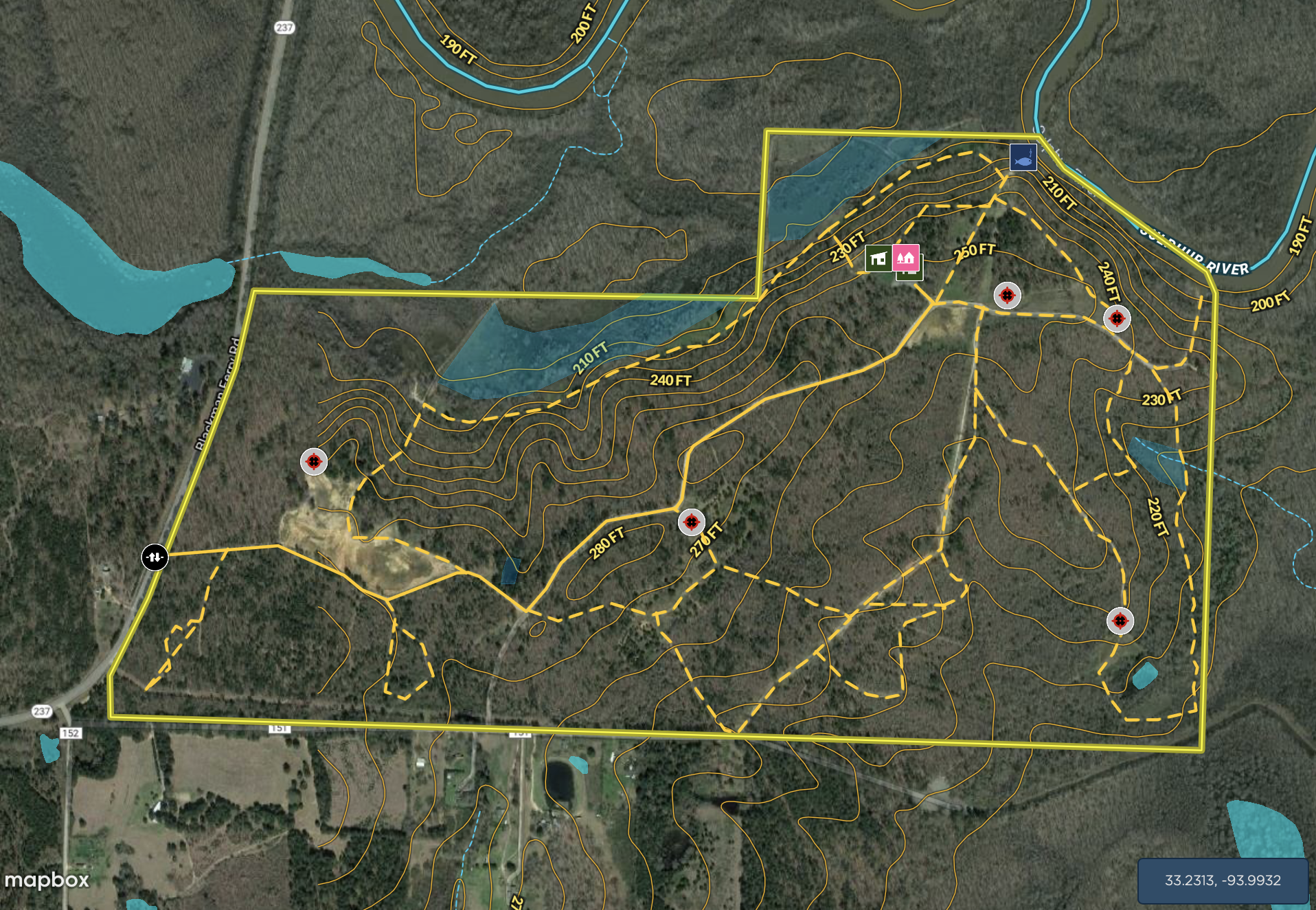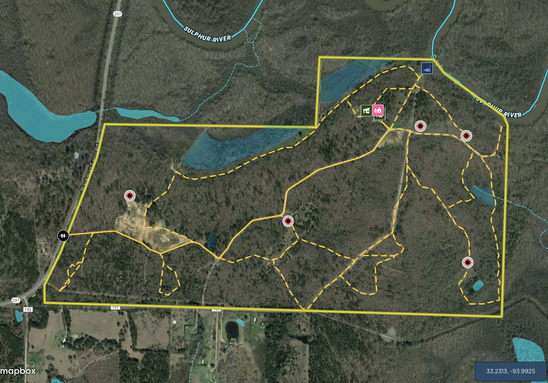 Water: Over a ¼ Mile of Sulphur River frontage, complete with a custom fishing pier and a private concrete boat ramp. Sulphur river provides some phenomenal fishing opportunities and flooded timber duck hunting. Sulphur river is known for its great catfishing! The water-controlled duck hunting impoundments provide excellent duck hunting, with a way to plant and move water on and off.