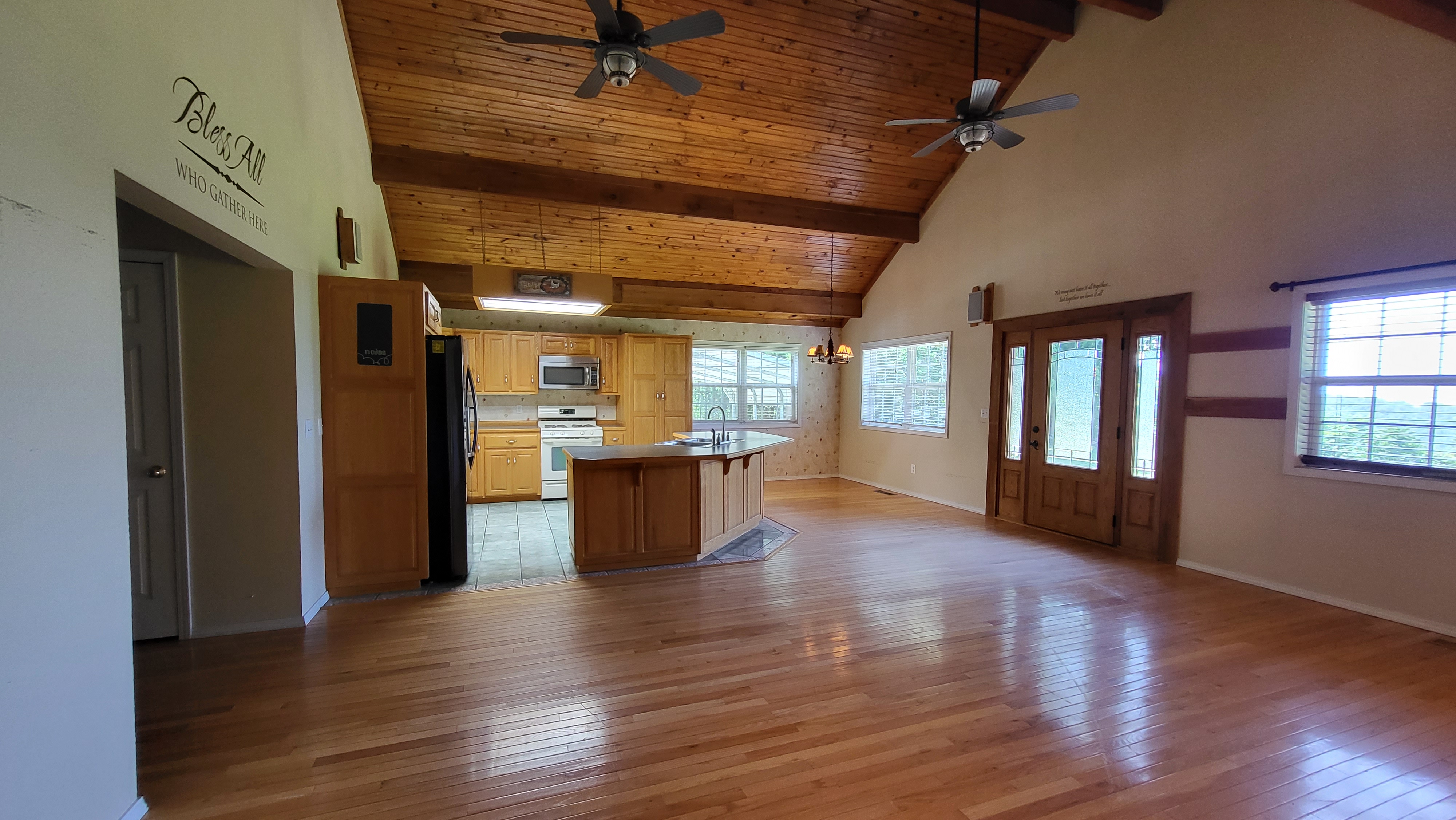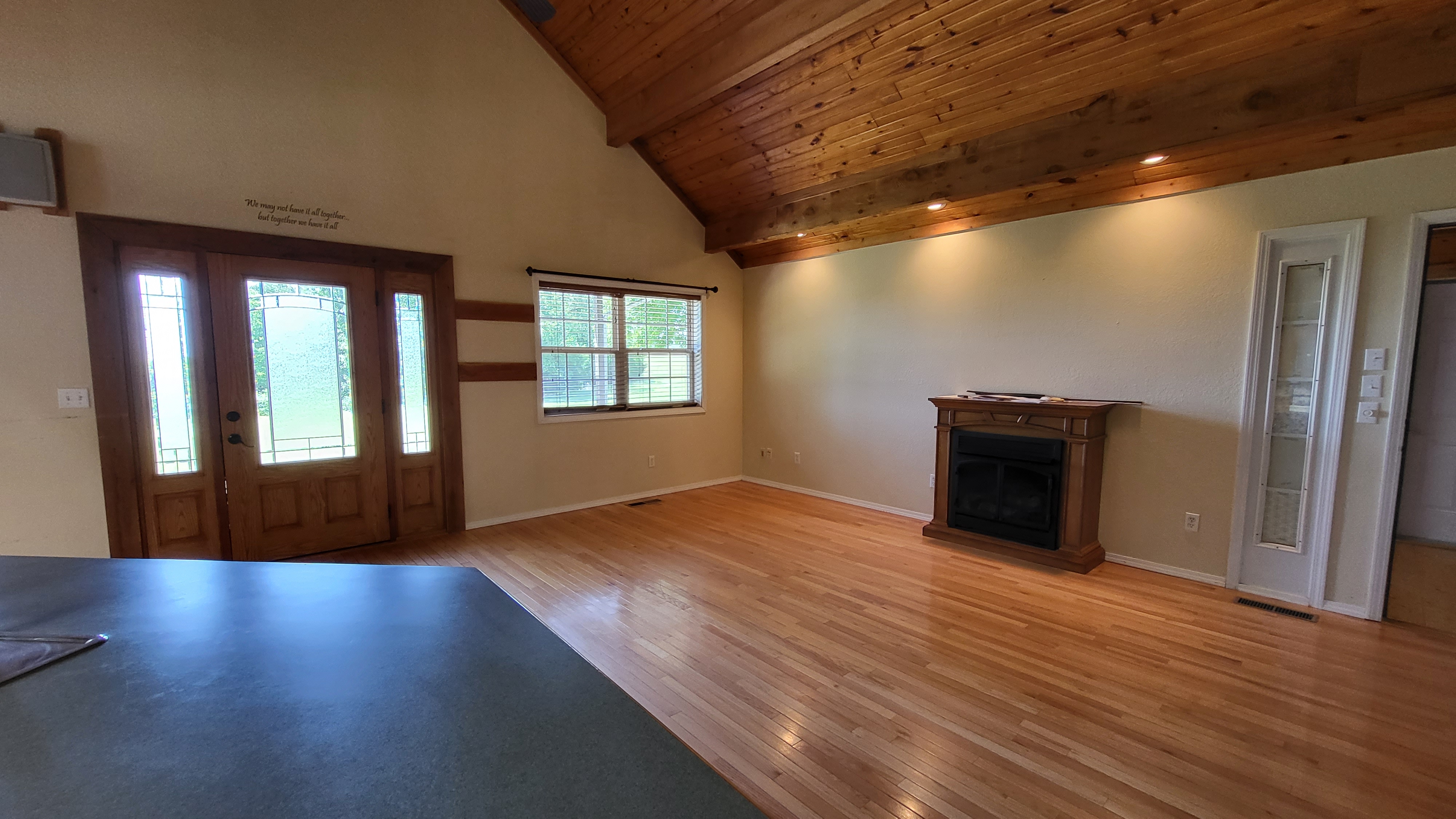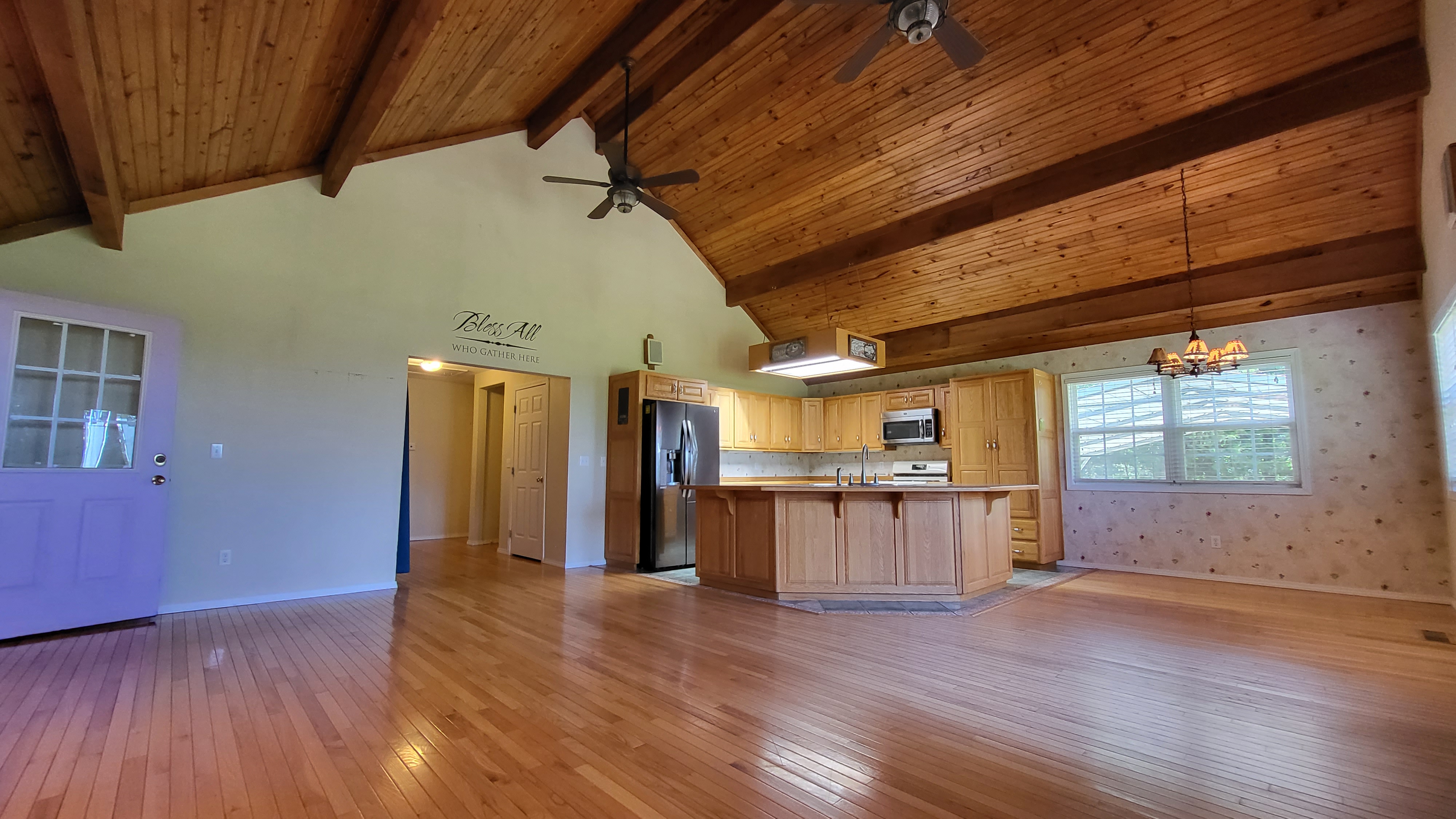 - Vaulted ceiling and wood accents