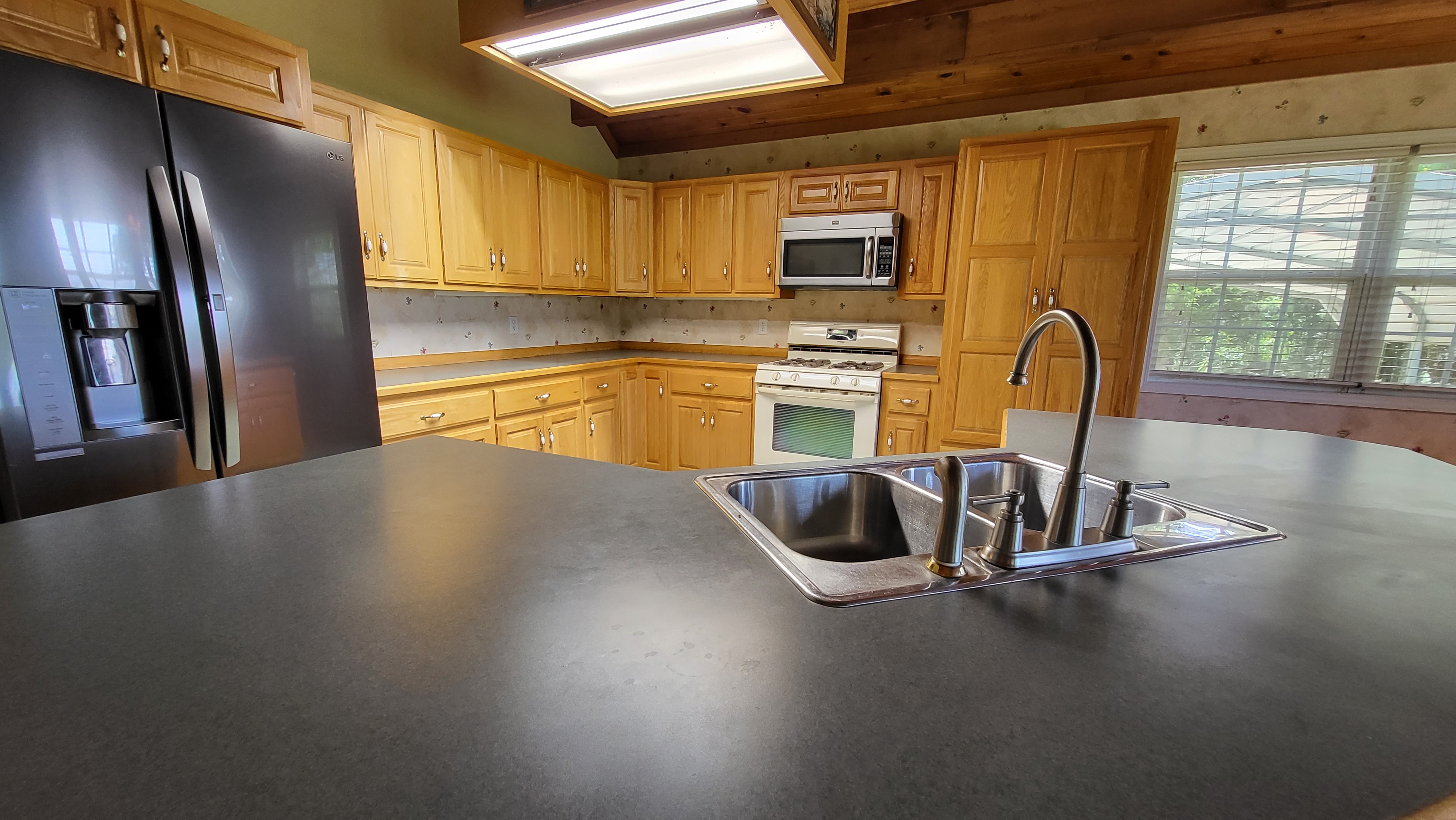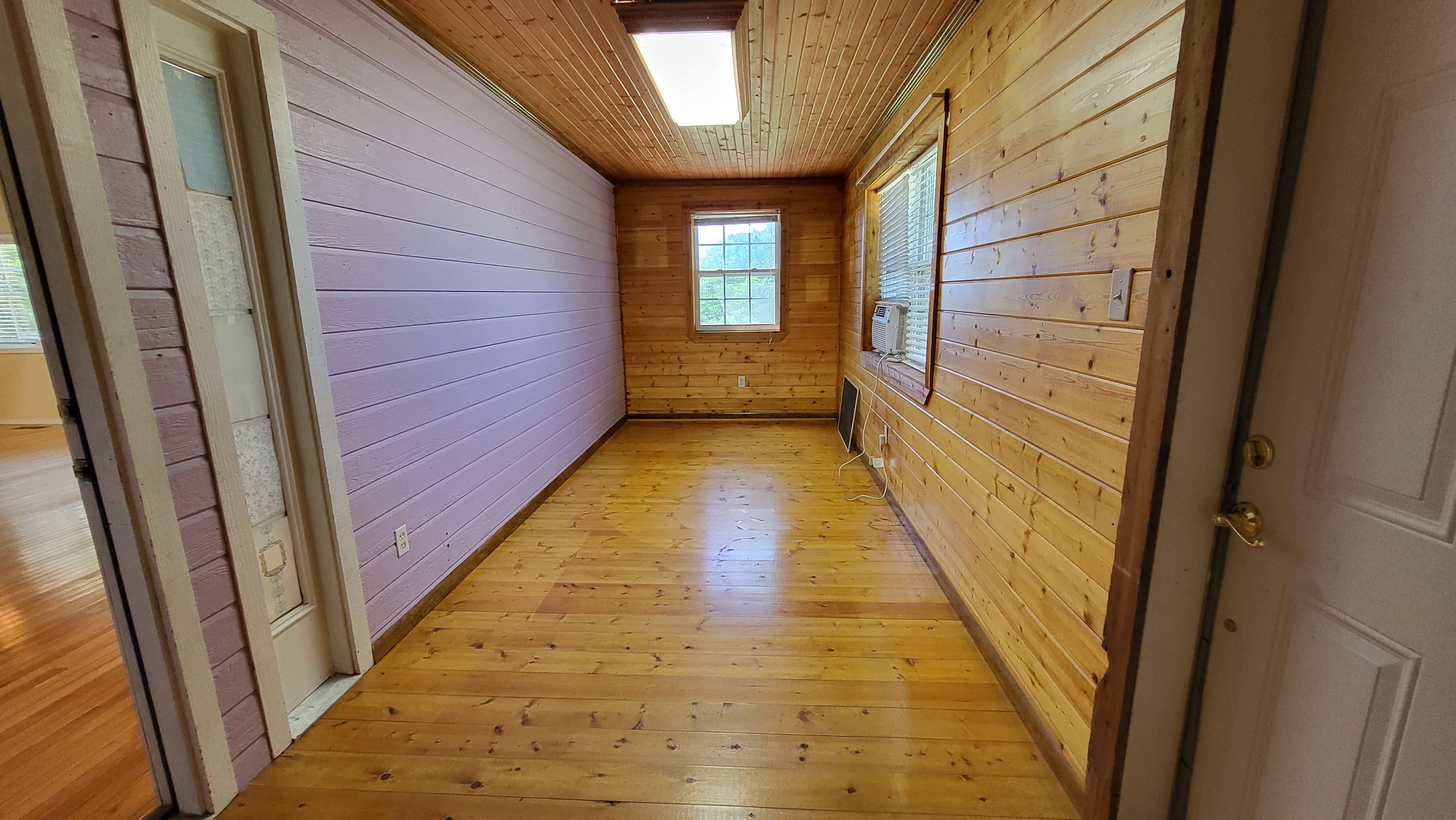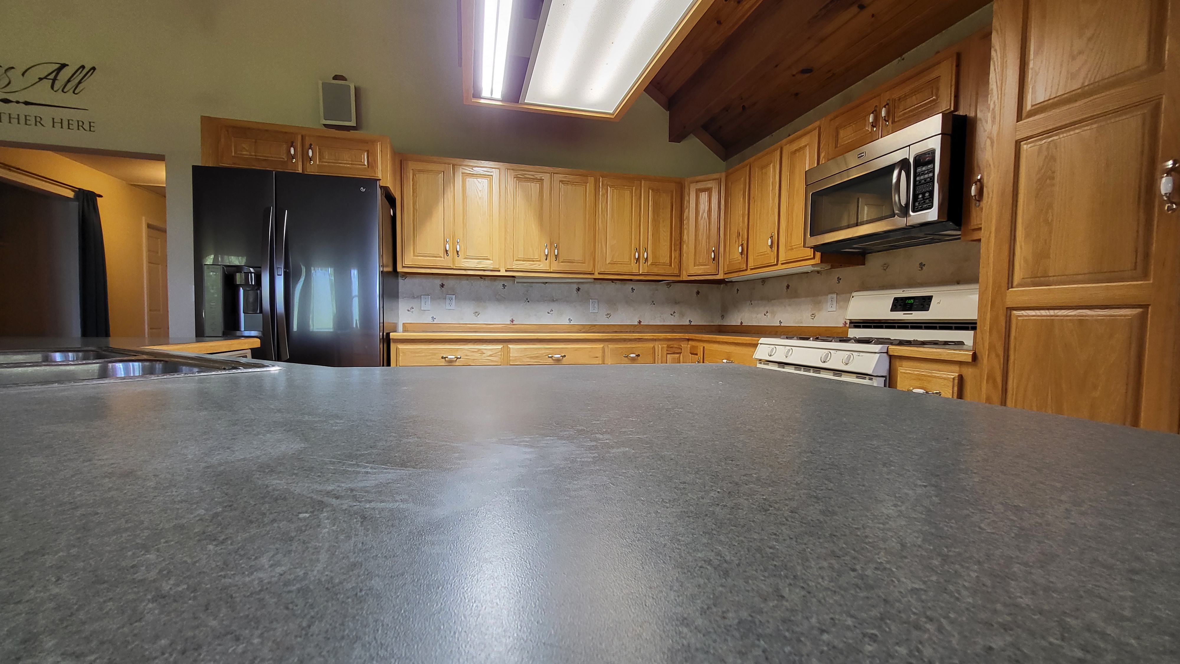 - Vaulted ceiling and wood accents