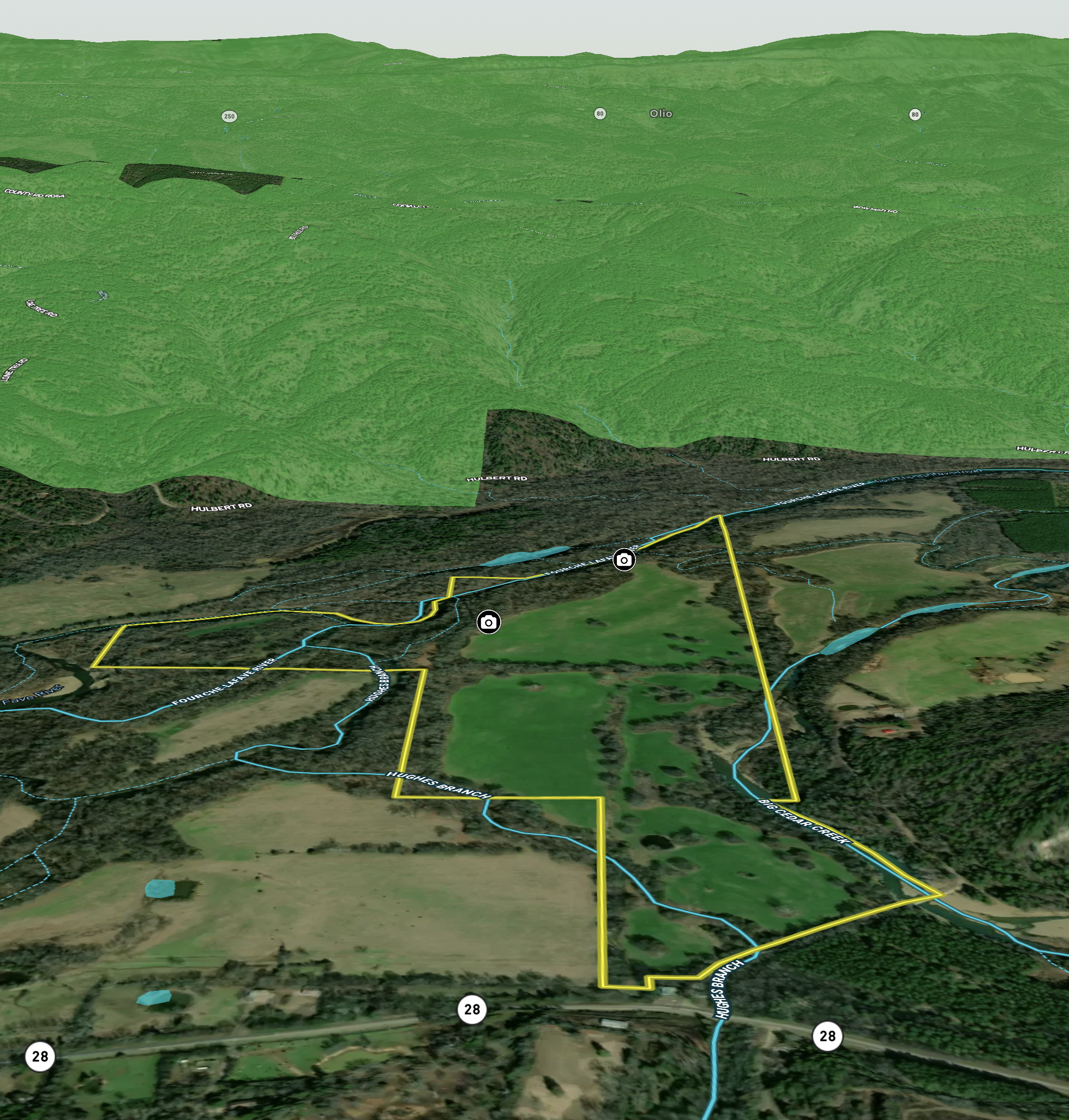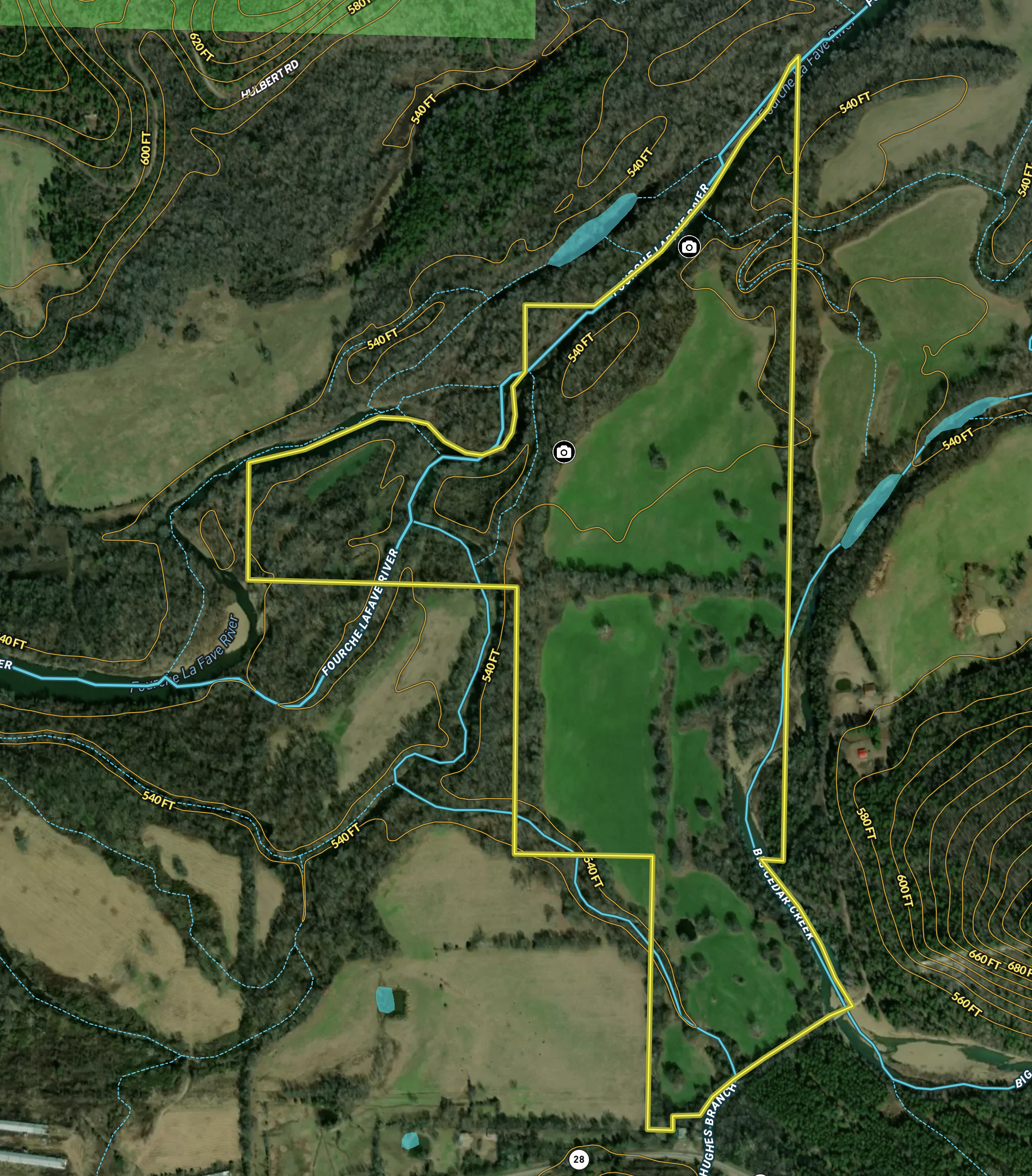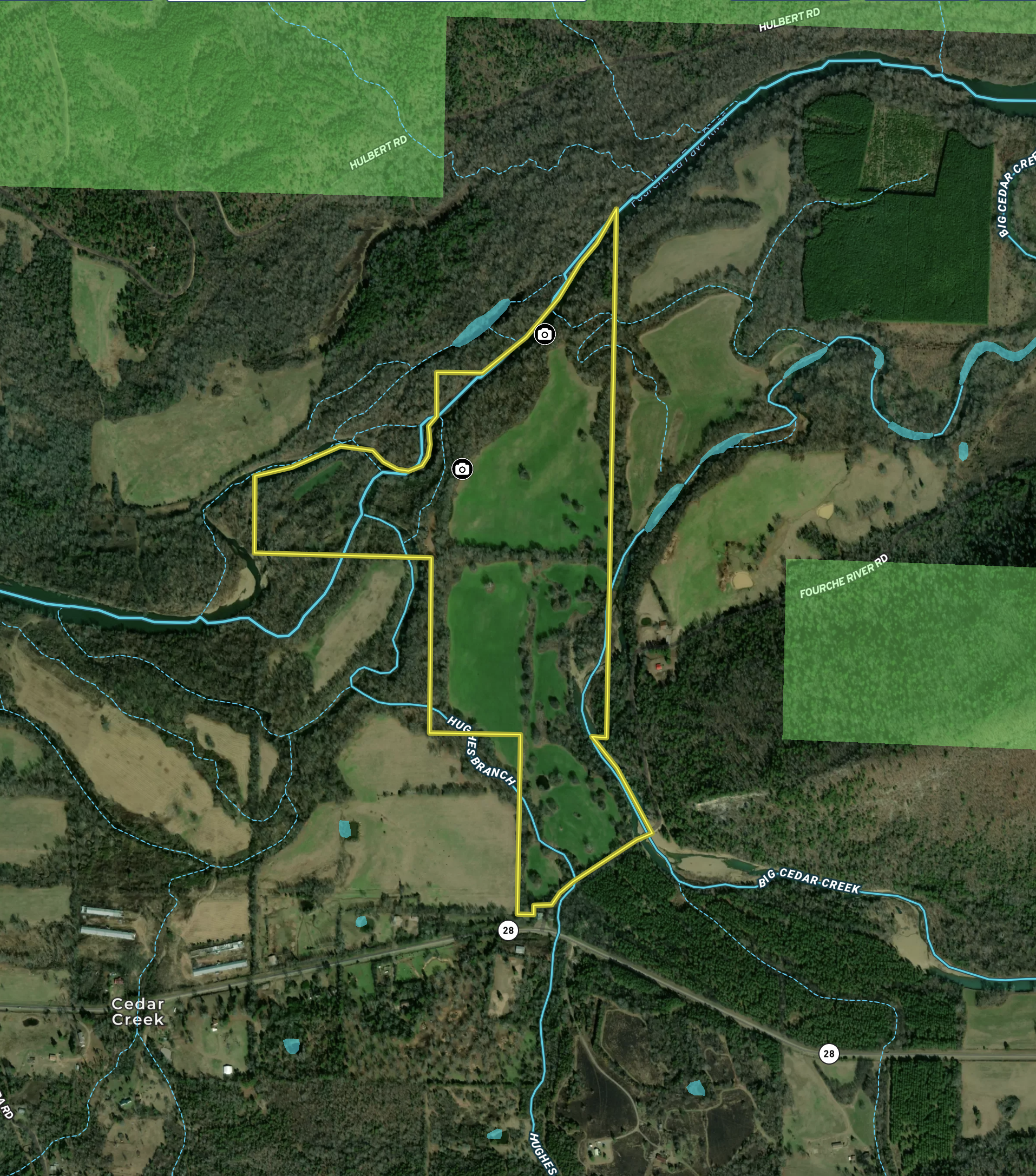 - Three amazing water ways to include the Hughes Branch, Big Cedar Creek, and the Fouche Lafave River all on the property
