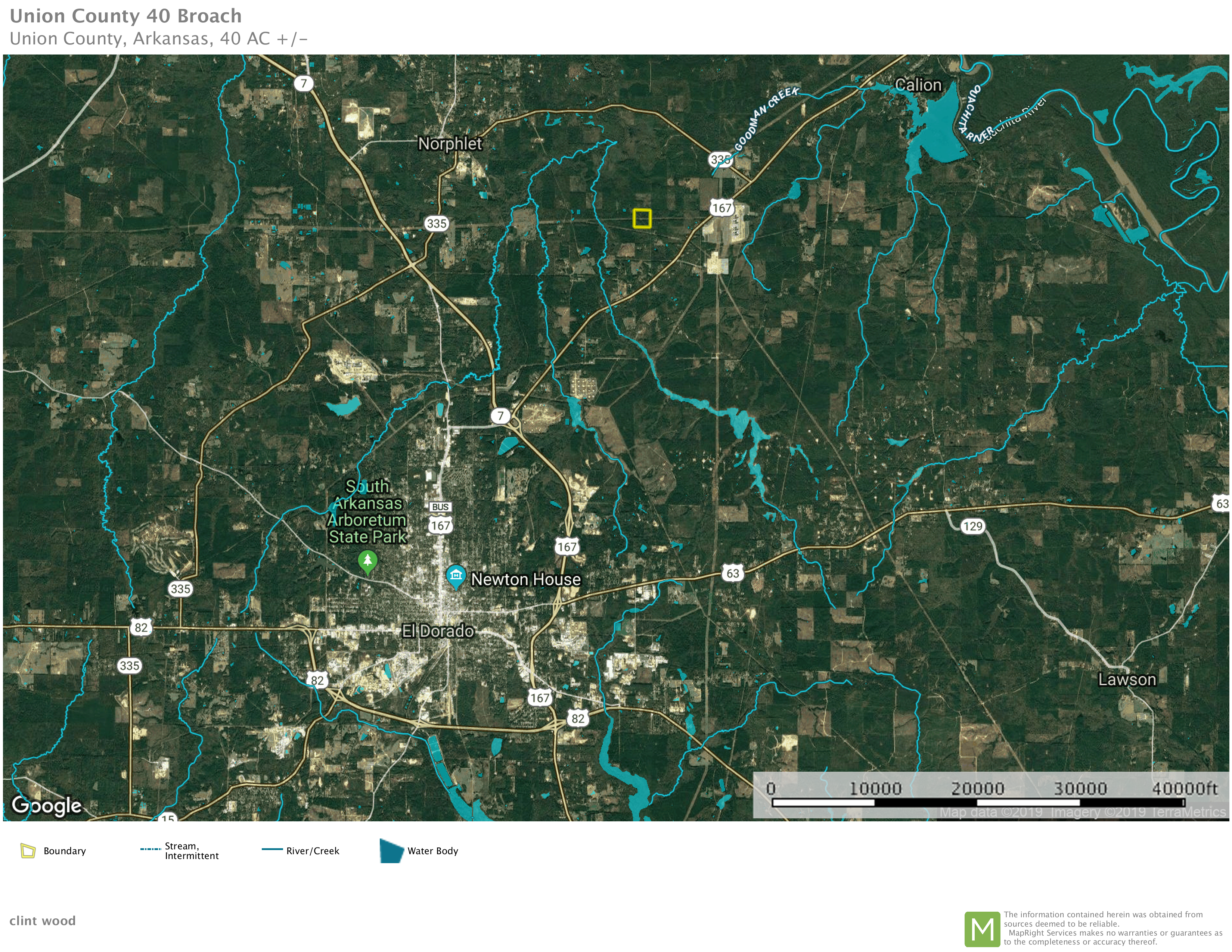 If you are looking for a great place to build your dream home and be able to hunt out of the back door, then this may be your spot. This property is located in the El Dorado school district and the property can be slit up if you do not want to buy the whole 40. You could buy the 14 acres the SW of O’Rear road or the 26 acres to the NE of O’Rear road. Both parcels would provide a great homeplace with electricity and water available. The property has been cut over and not re-planted. There is good deer sign and some really good cover for the wildlife. Give us a call if you want to take a closer look.