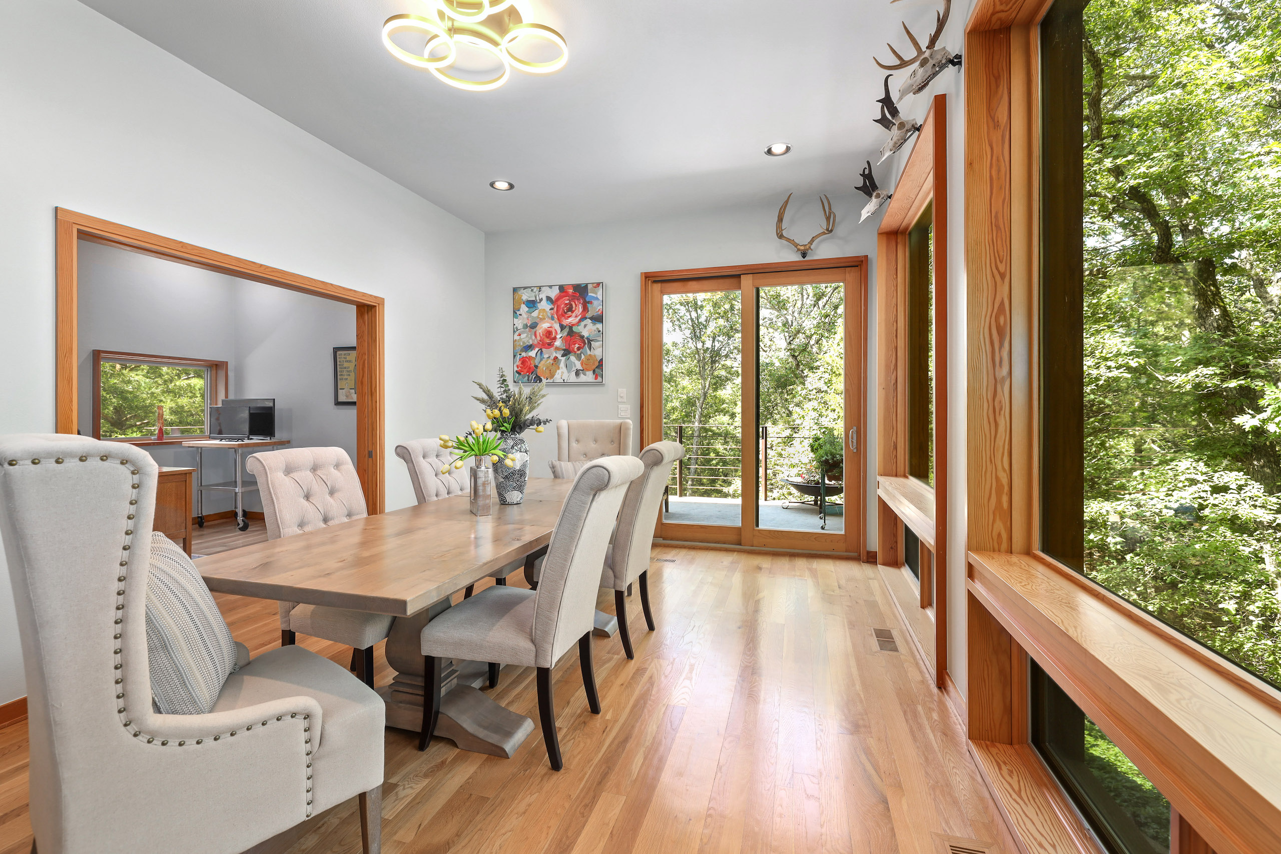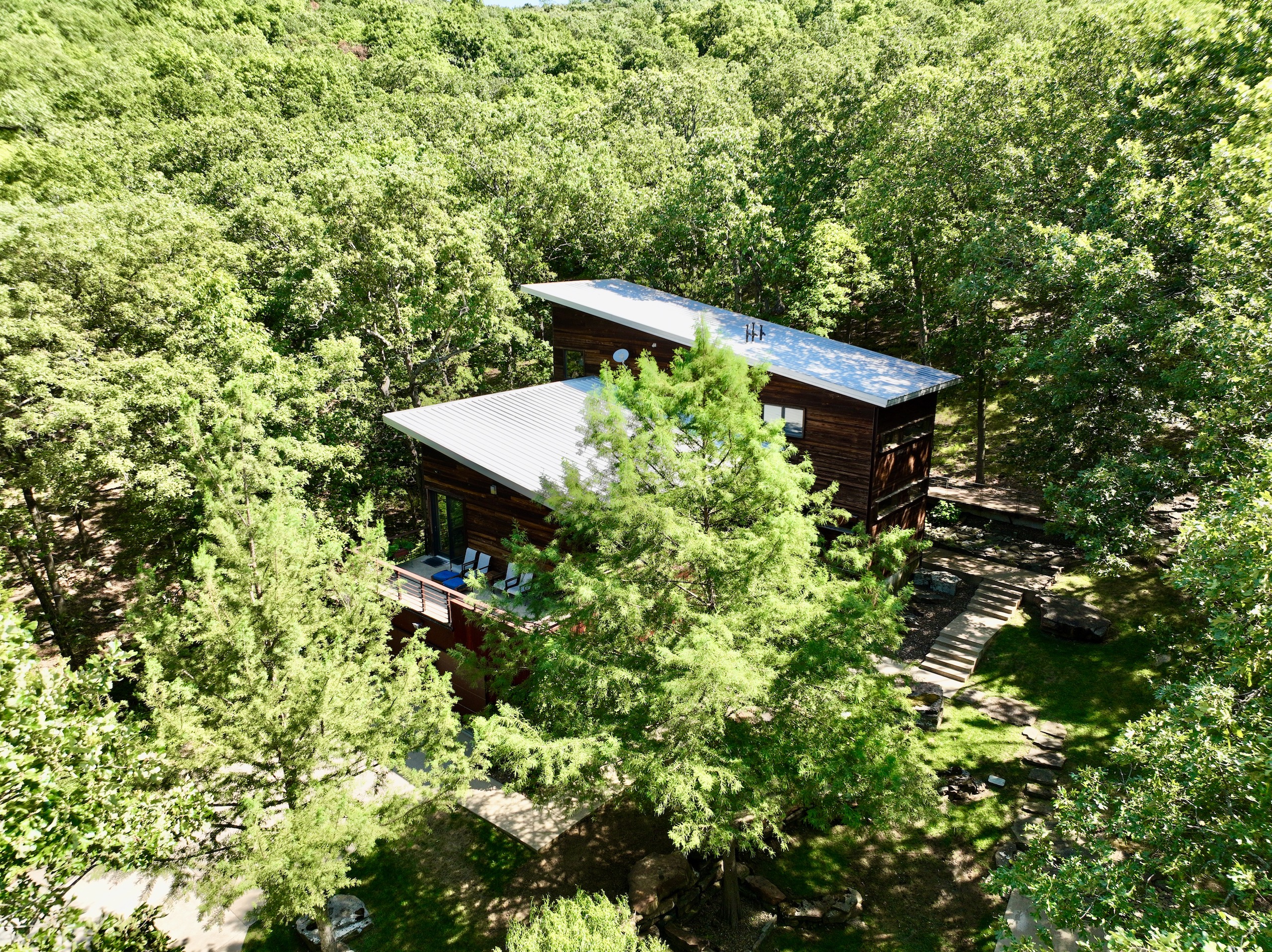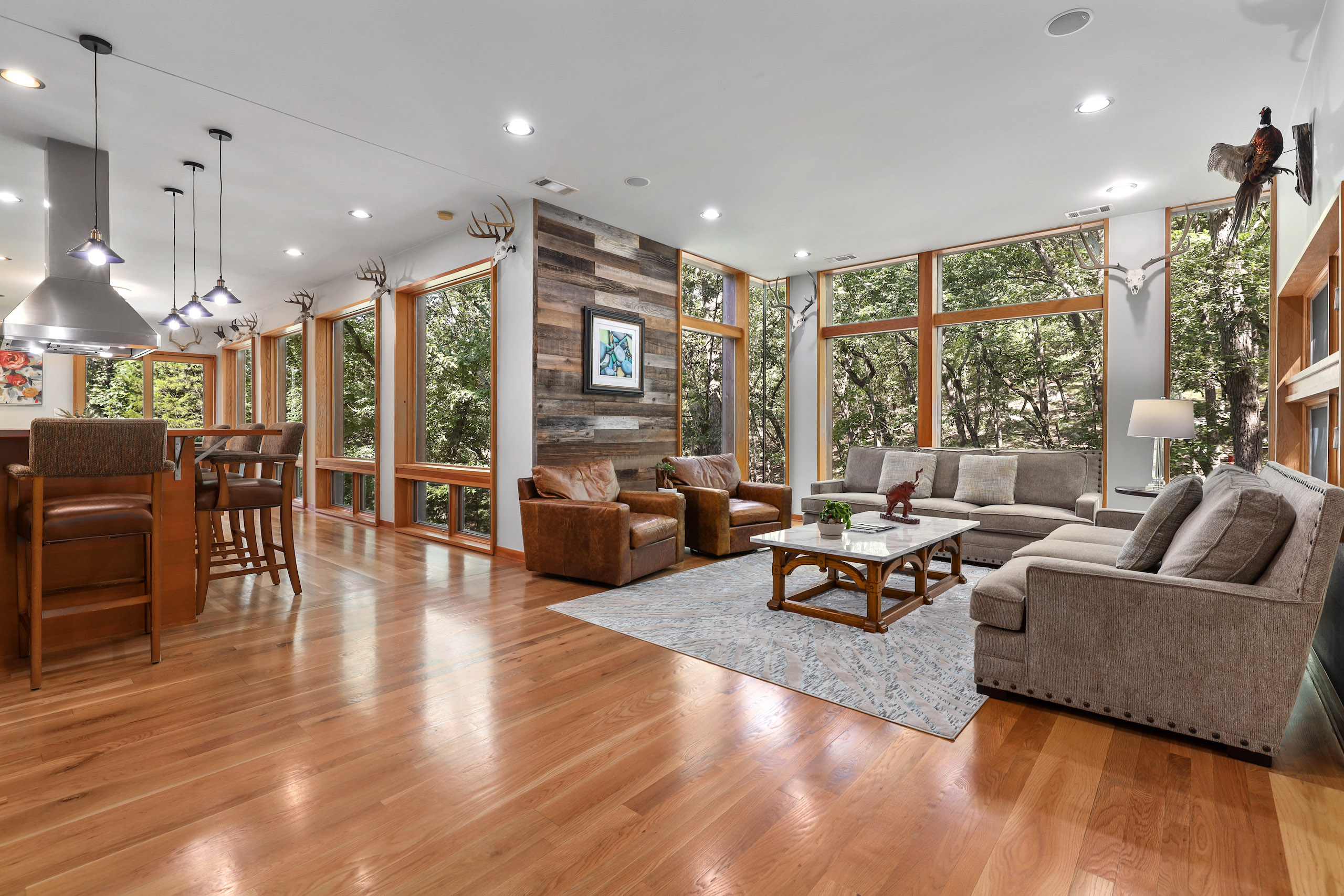 Welcome to one of the most one-of-a-kind properties in the Ozarks. If I were to say this place had it all, I think it would be an understatement, but truly, this property has something for everyone. Being just minutes from Elkins and just a short drive to Fayetteville, but with all the seclusion and privacy of any place in the Ozarks. This luxury rural oasis custom home is a rustic contemporary architectural masterpiece that will not disappoint with three levels that offer four bedrooms and three and a half baths, as well as a gorgeous open kitchen with soapstone countertops and hardwood flooring throughout. From floor to ceiling, no detail has been overlooked. The expansive windows provide a 360-degree spectacular view from all three levels, and the natural materials incorporated throughout seamlessly blend the exterior setting with the interior design. With the floating staircase, built-in bar/ lounge area, plus multiple patio and deck areas, you will create memories that will last a lifetime with family and friends. Also, enjoy the large covered screened-in porch that will be perfect for enjoying that morning cup of coffee as you view the park-like setting and all the wildlife that call the area home. An additional 60 x 40 shop, with two large bay doors, offers plenty of storage as well as being a great shop area. Plus, there is a second living area that offers a one bedroom, one bath, with kitchen and loft. If you are passionate about the outdoors, you are in for a special treat. How many places in the Ozarks do you know of where you can chase amazing whitetails, duck hunt, and fish too? No details have been overlooked, from extensive food plots in the river bottoms to the rice in the creek bottoms. In fact, the waterfowl and whitetails have been strictly managed for all most a decade with some amazing results. There are over three acres of food plots planted in soybeans, with stands placed in multiple funnels and pinch points throughout the acreage; it will give a person the perfect opportunity to see a mature whitetail this hunting season. In fact, it is not uncommon to see over 20 deer in one sitting. With the White River adjoining the property to the south and Lake Sequoyah Park adjoining to the west make for the perfect wildlife sanctuary. In addition to the amazing whitetail, opportunities are the proven duck hole with guaranteed water along the White River. Enjoy the established duck blind overlooking rice that is planted annually along the waterfowl flyway. No matter what you are looking for, this amazing place has it all. Don’t miss out on the amazing opportunity. Please call today to schedule your private tour or for driving directions.