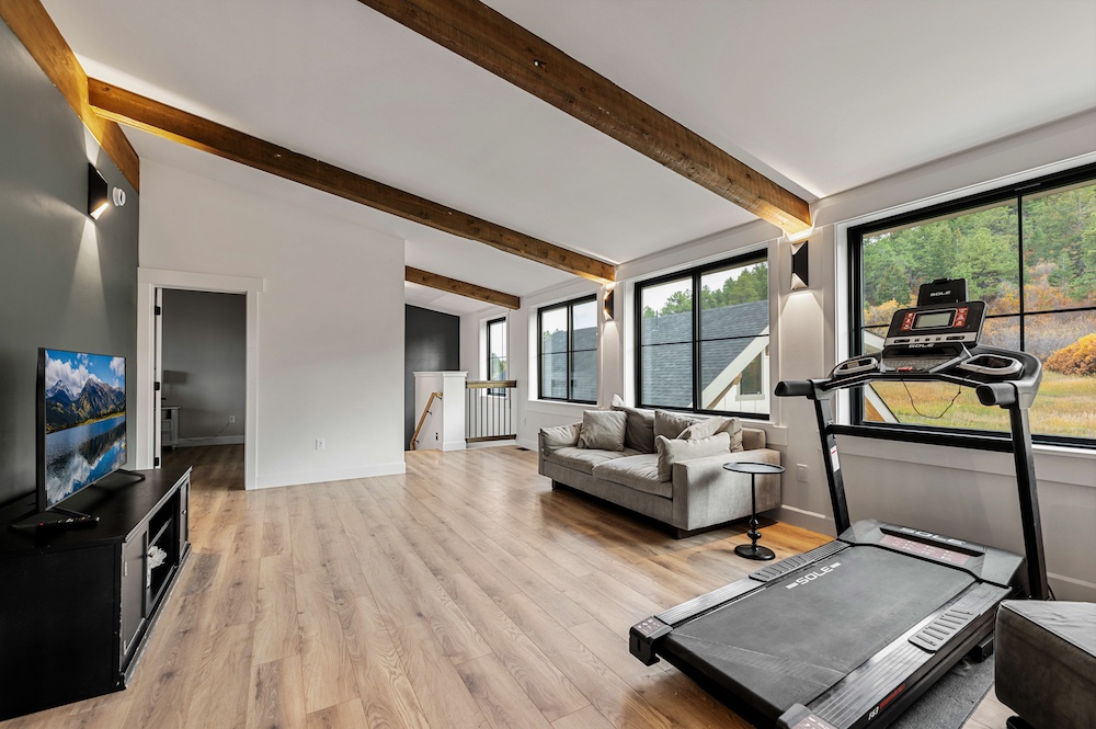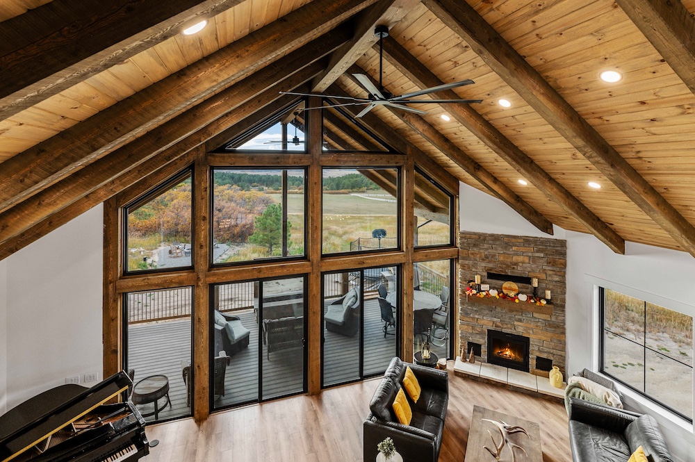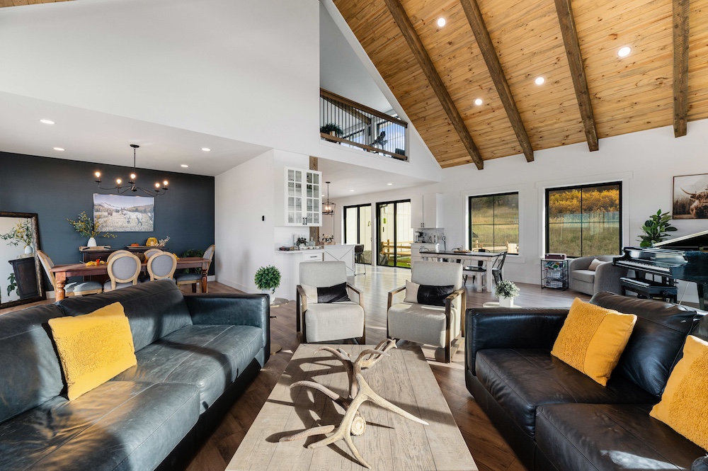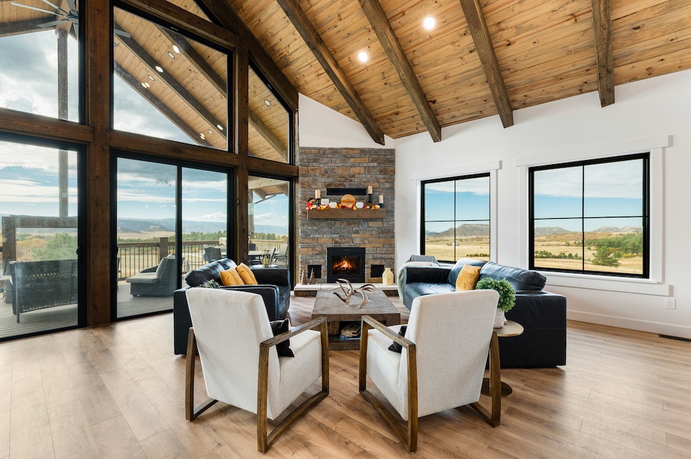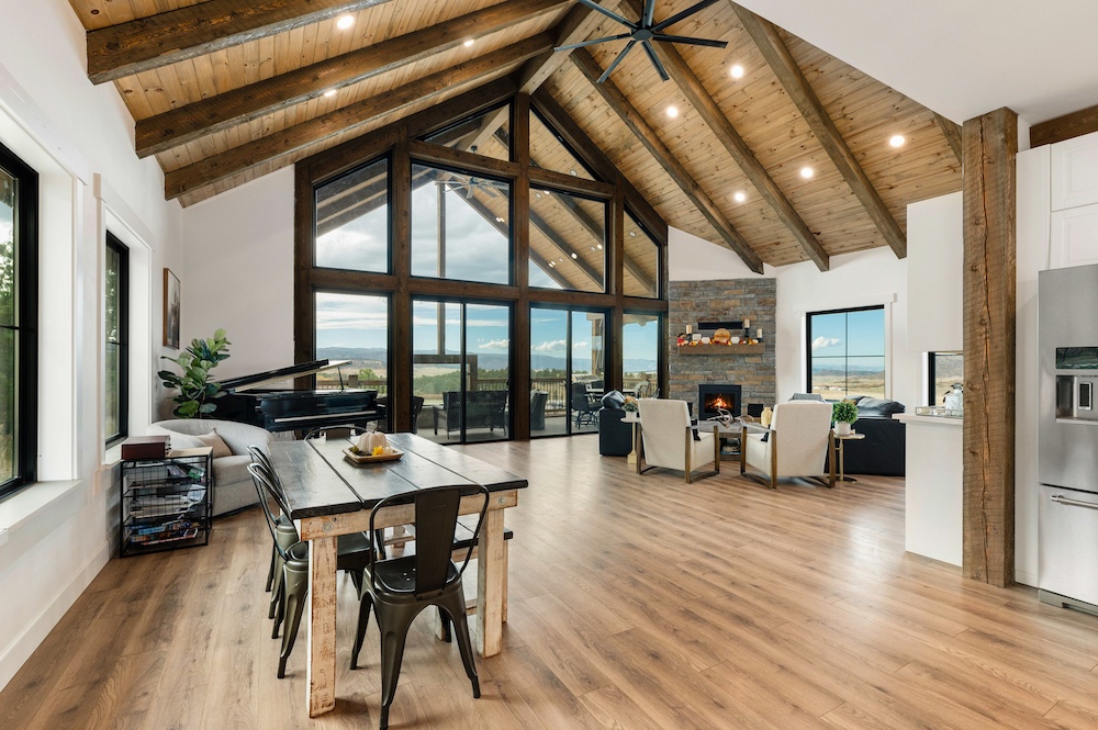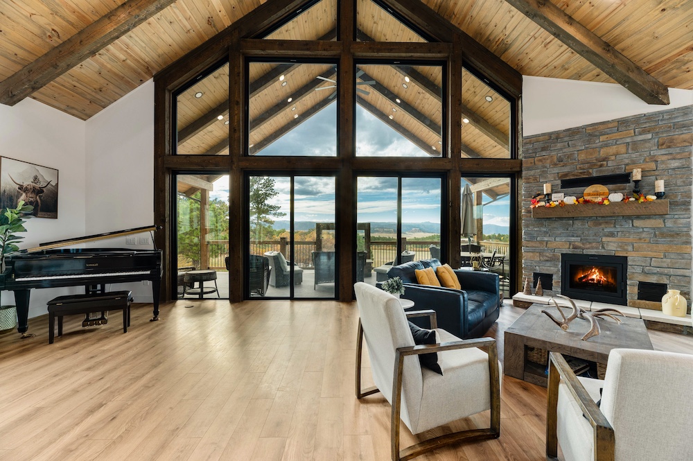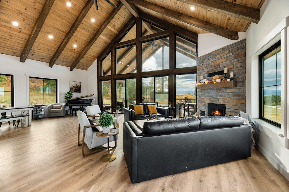 - Mountain-modern design custom home built in 2024 with vaulted great room, exposed timber beams, and large windows