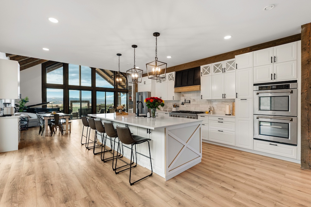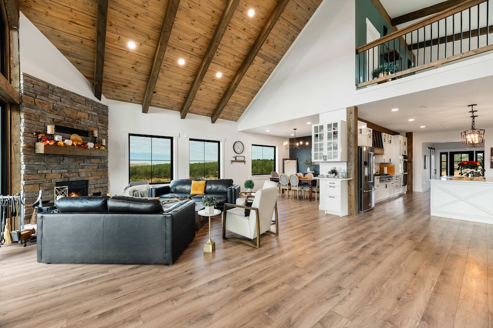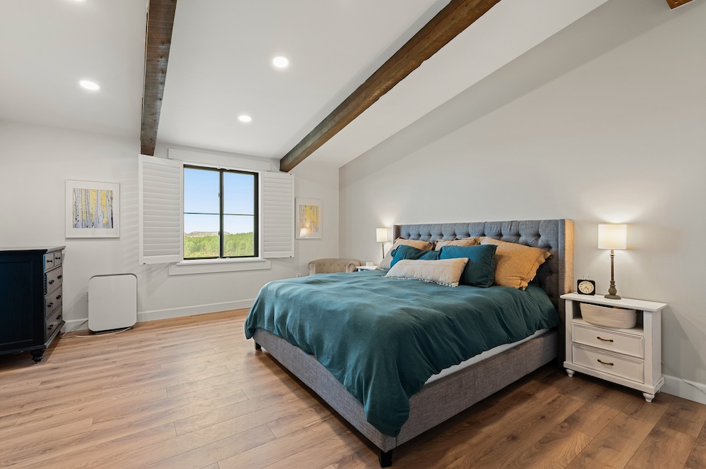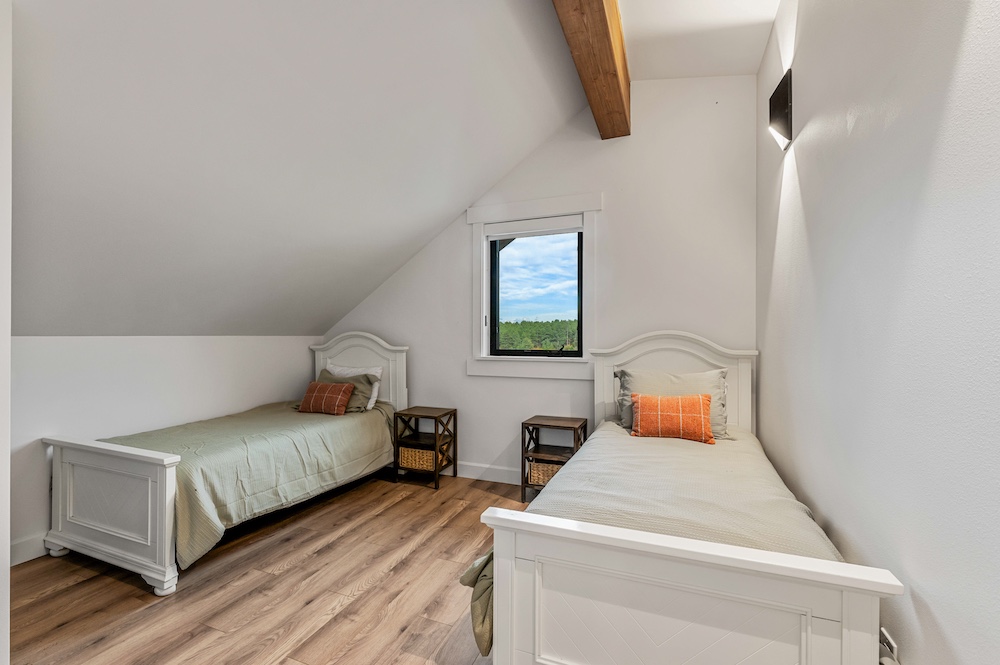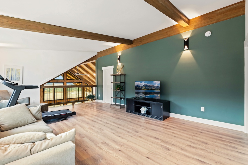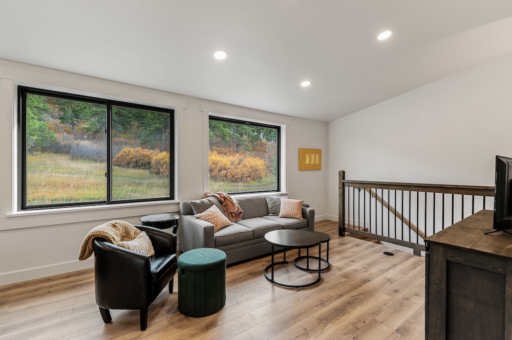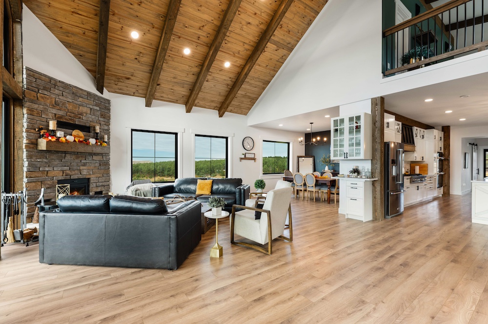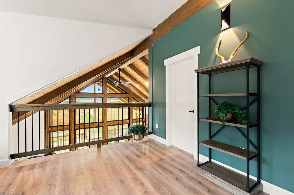 - Mountain-modern design custom home built in 2024 with vaulted great room, exposed timber beams, and large windows