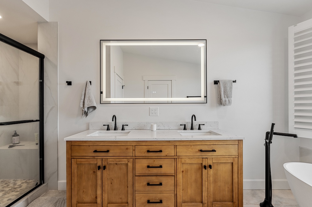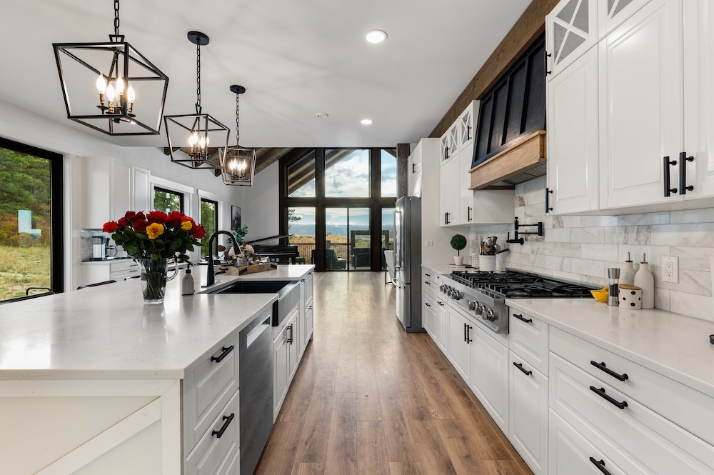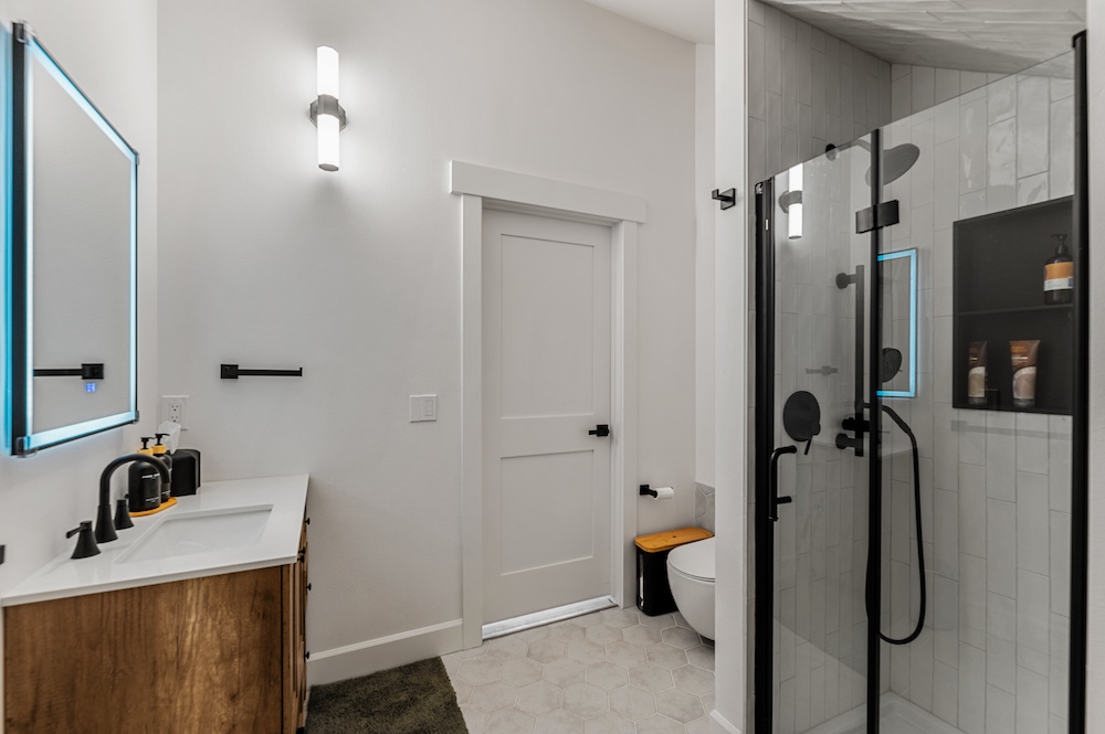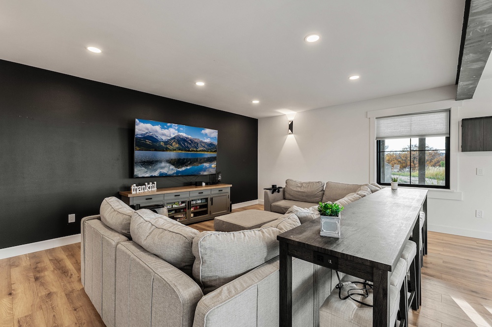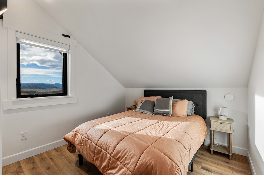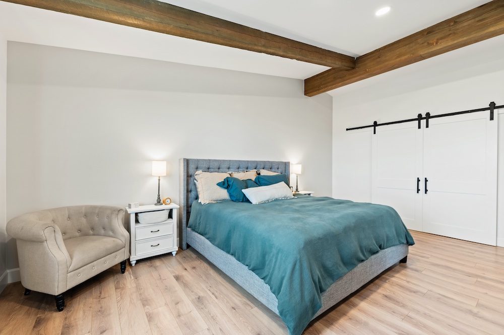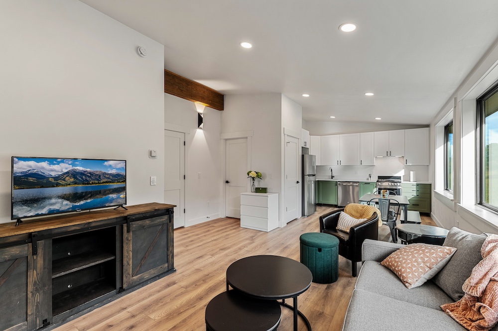 - Mountain-modern design custom home built in 2024 with vaulted great room, exposed timber beams, and large windows