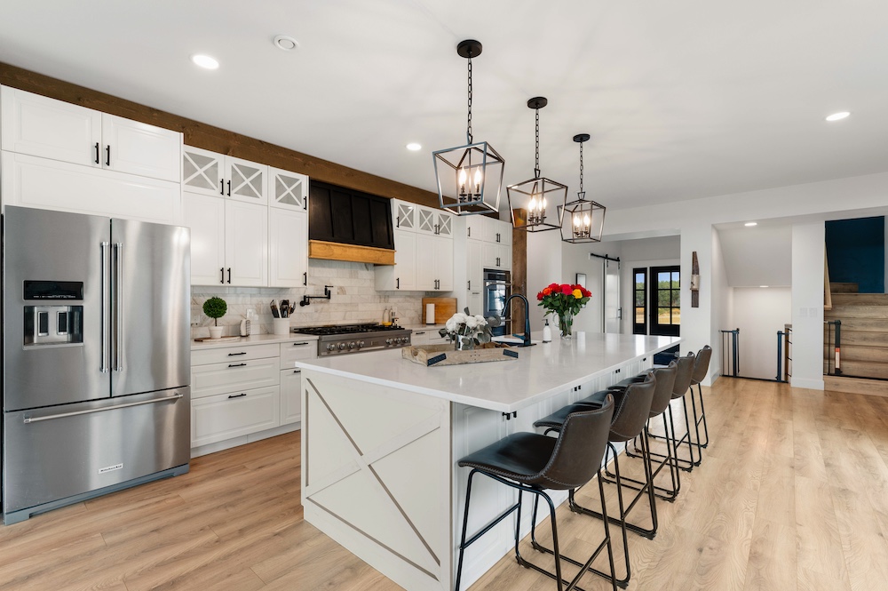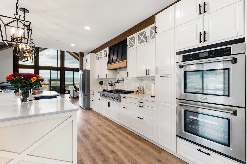 - Chef’s kitchen with luxury finishes, granite countertops, double-oven, and oversized island