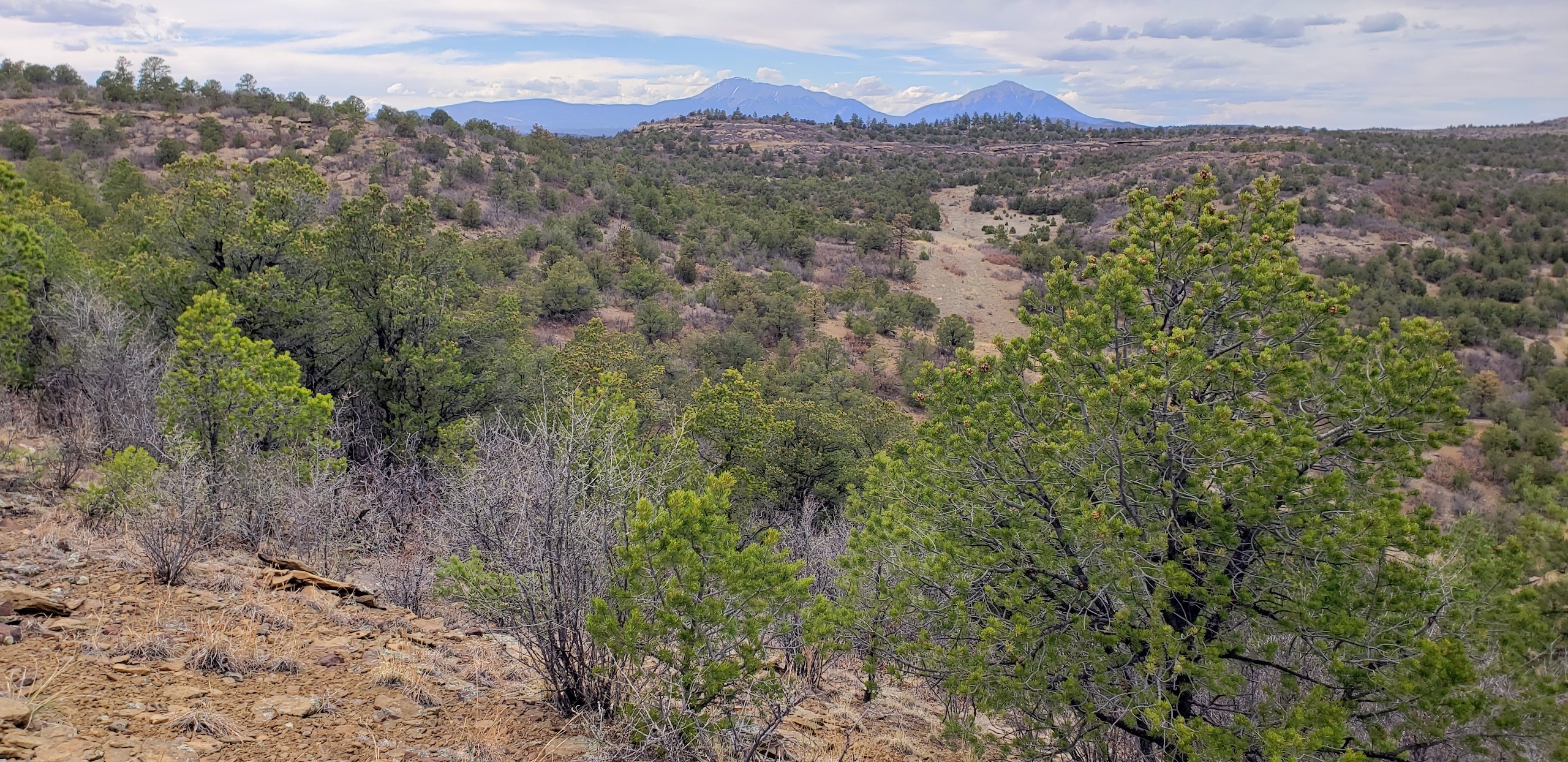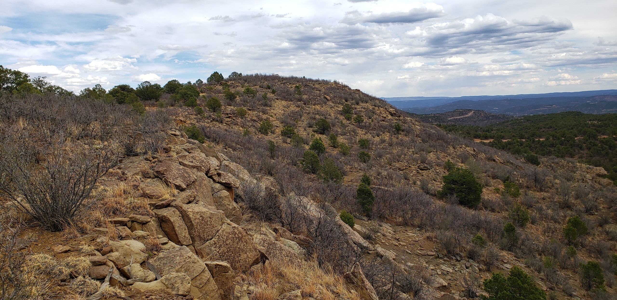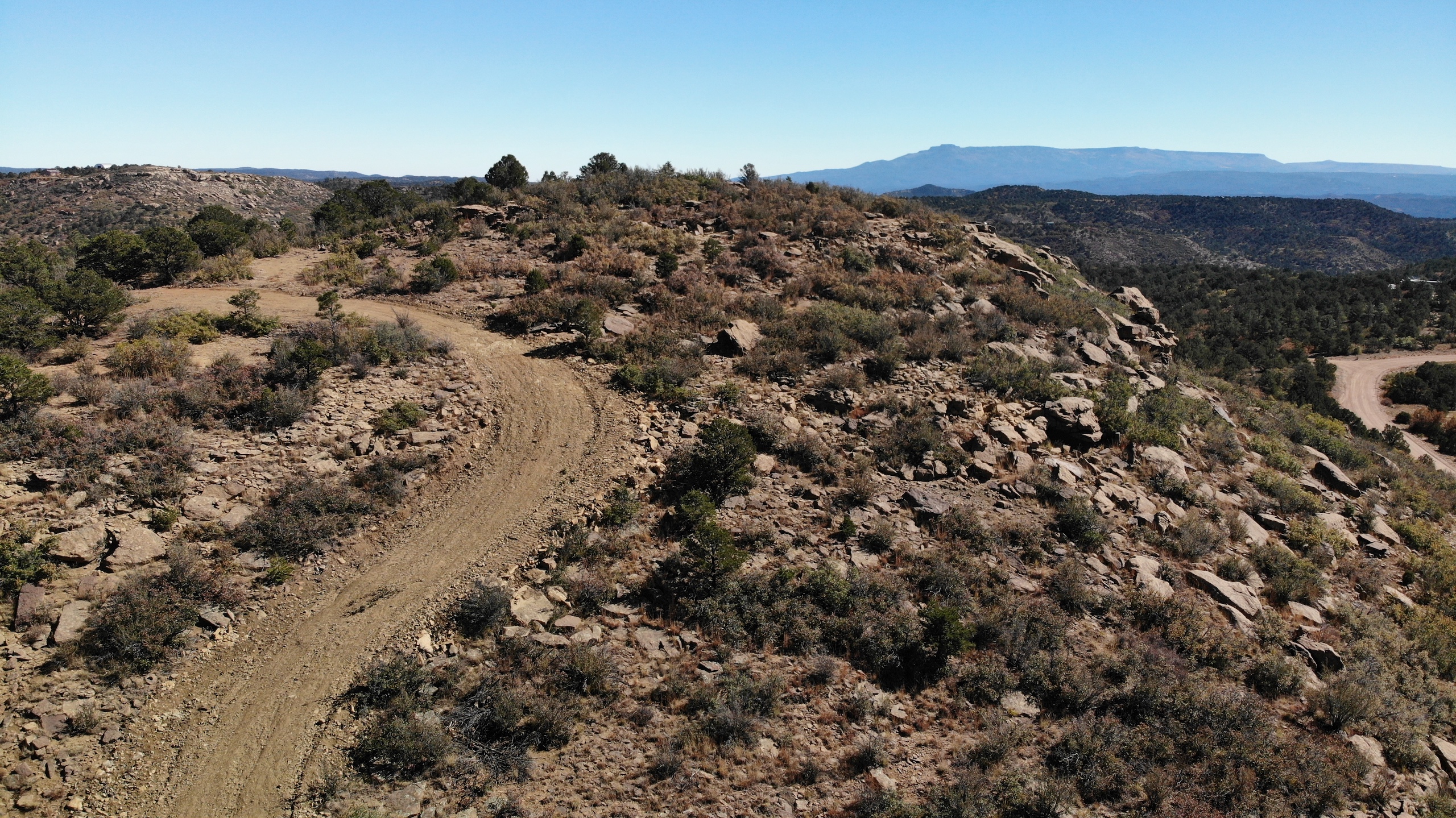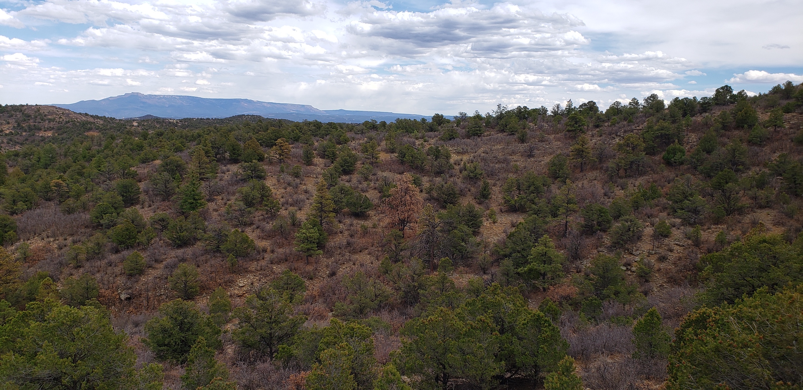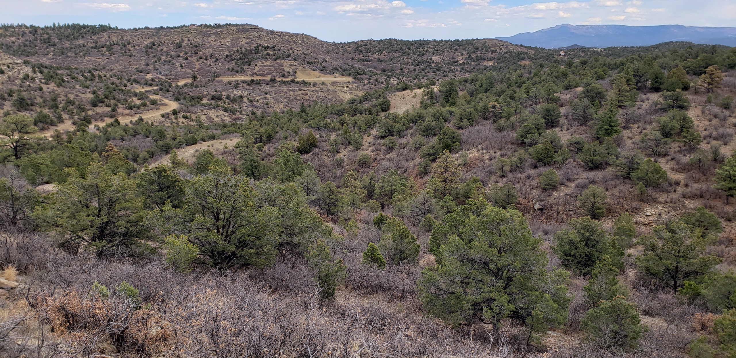 - Mountainous terrain with large rock outcroppings, pinon, juniper, and oak brush