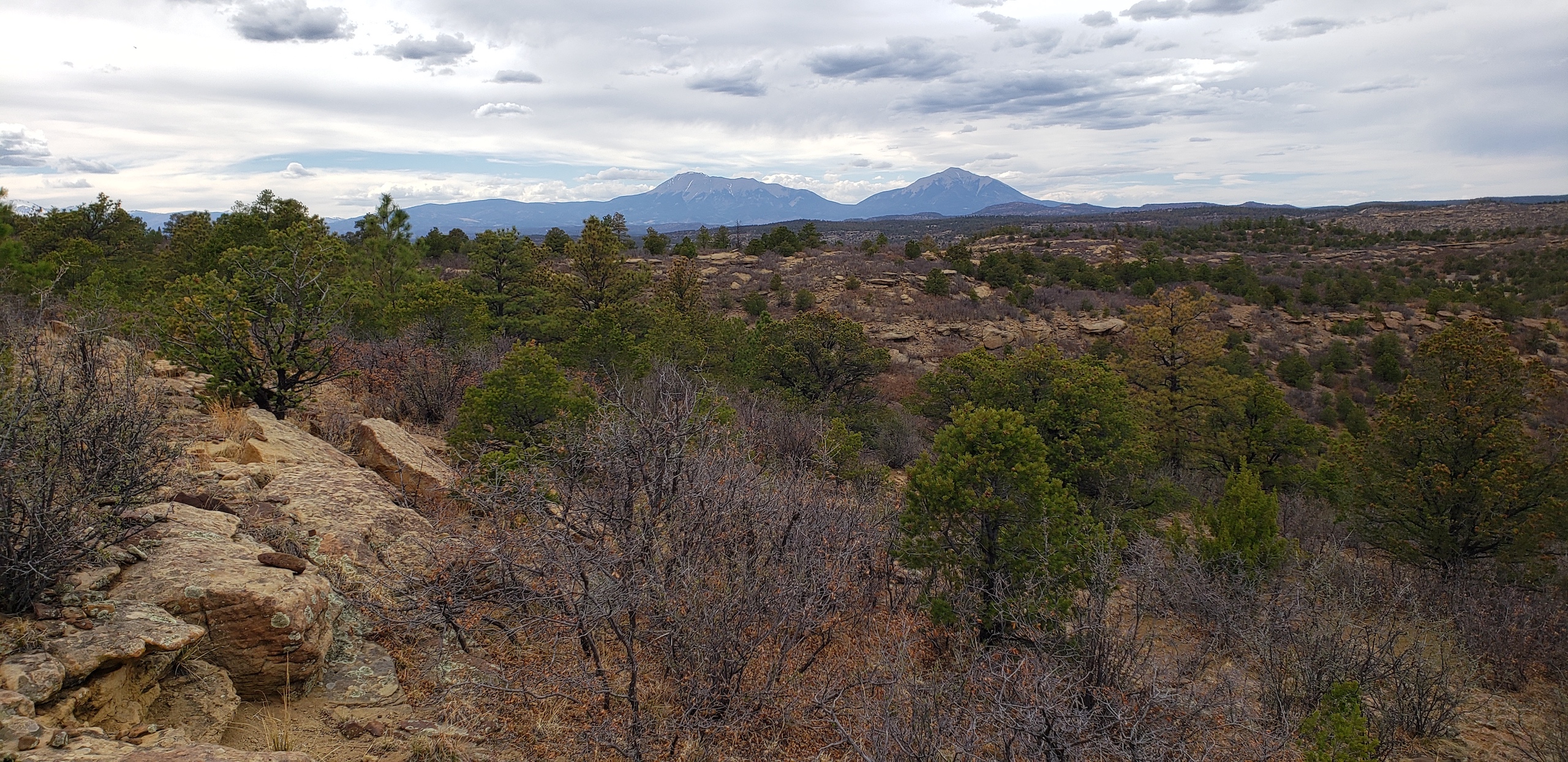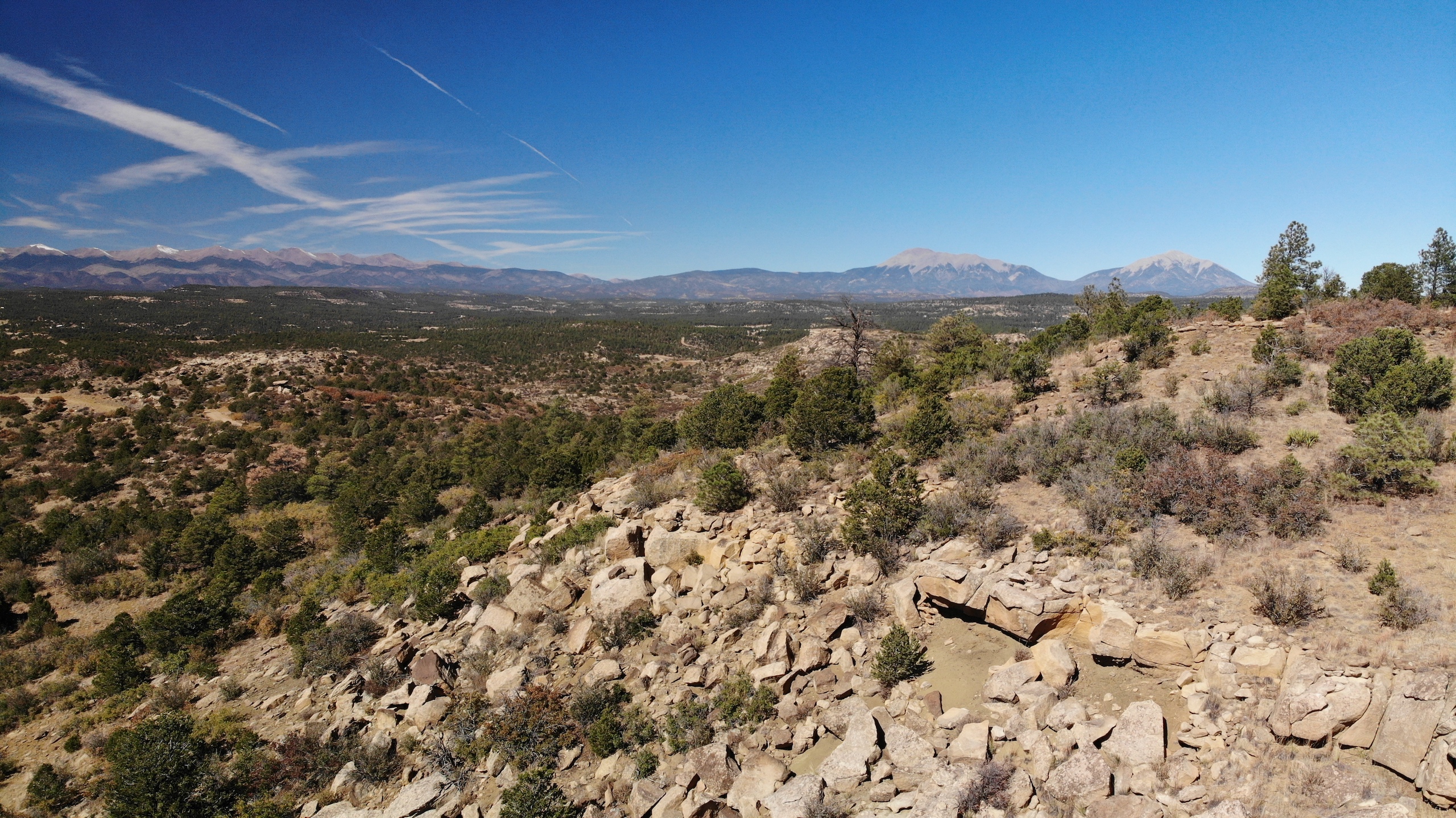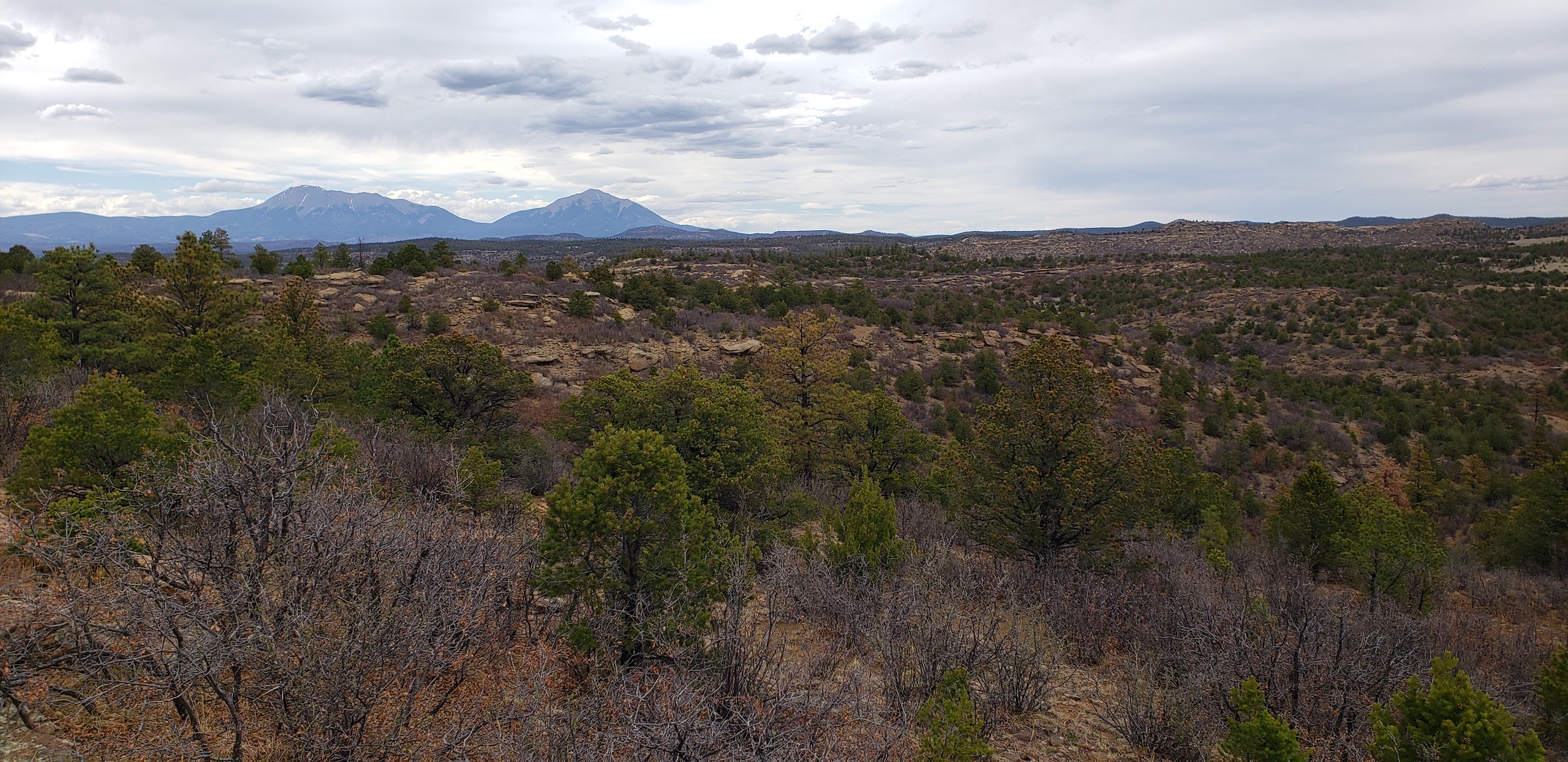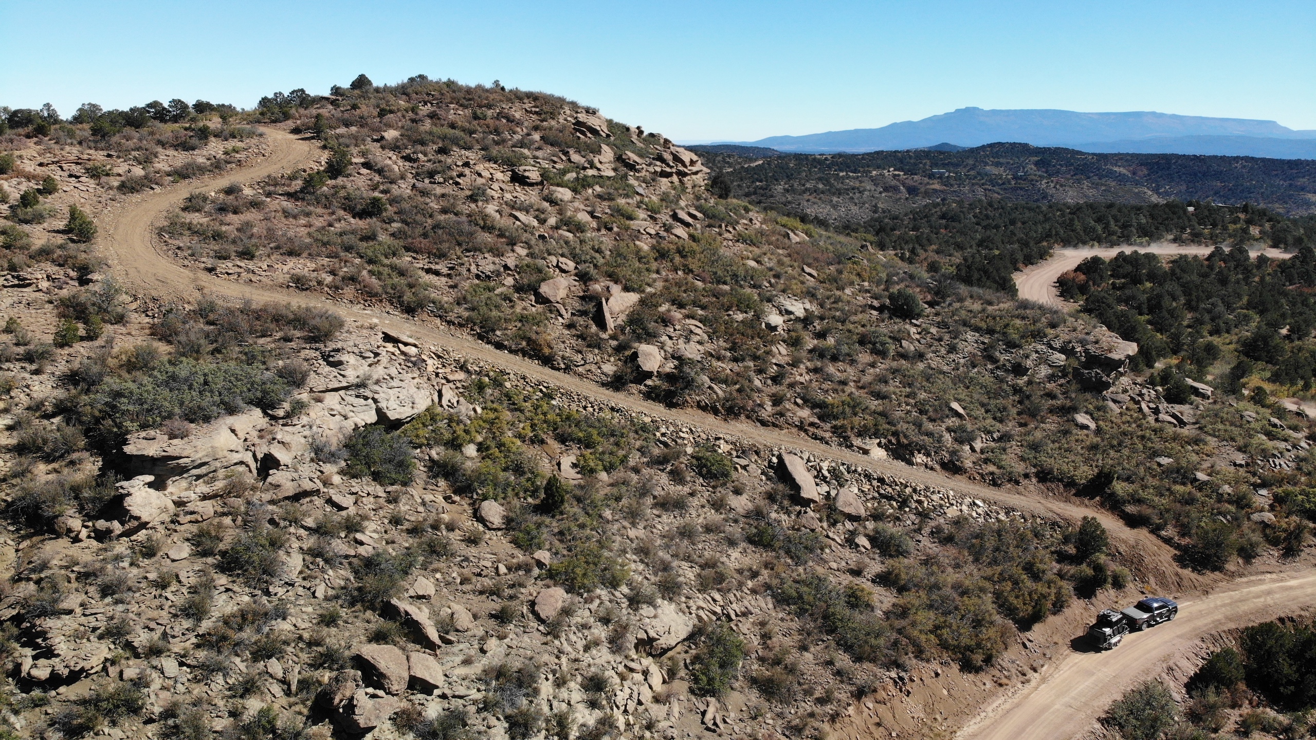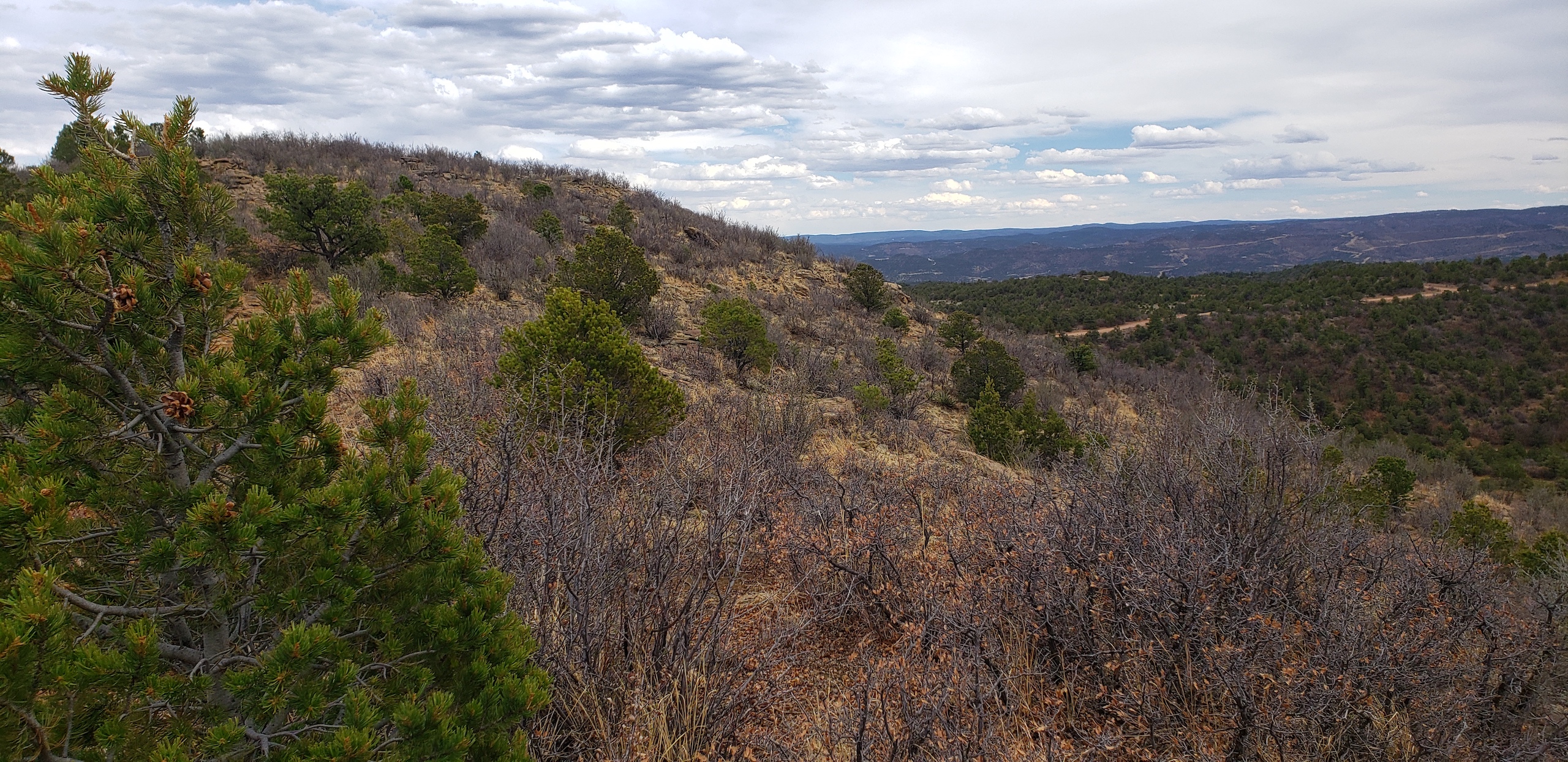 - Mountainous terrain with large rock outcroppings, pinon, juniper, and oak brush