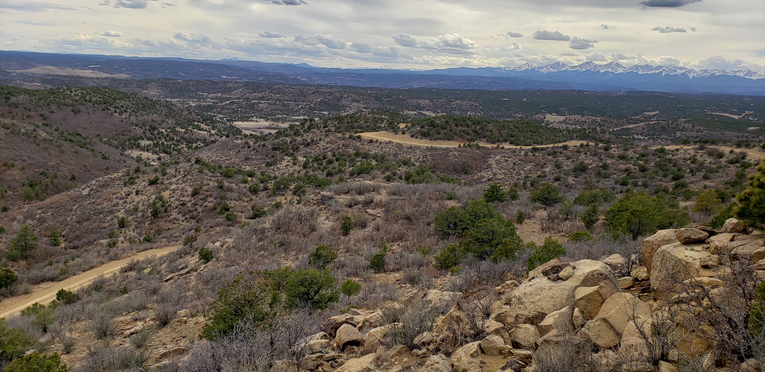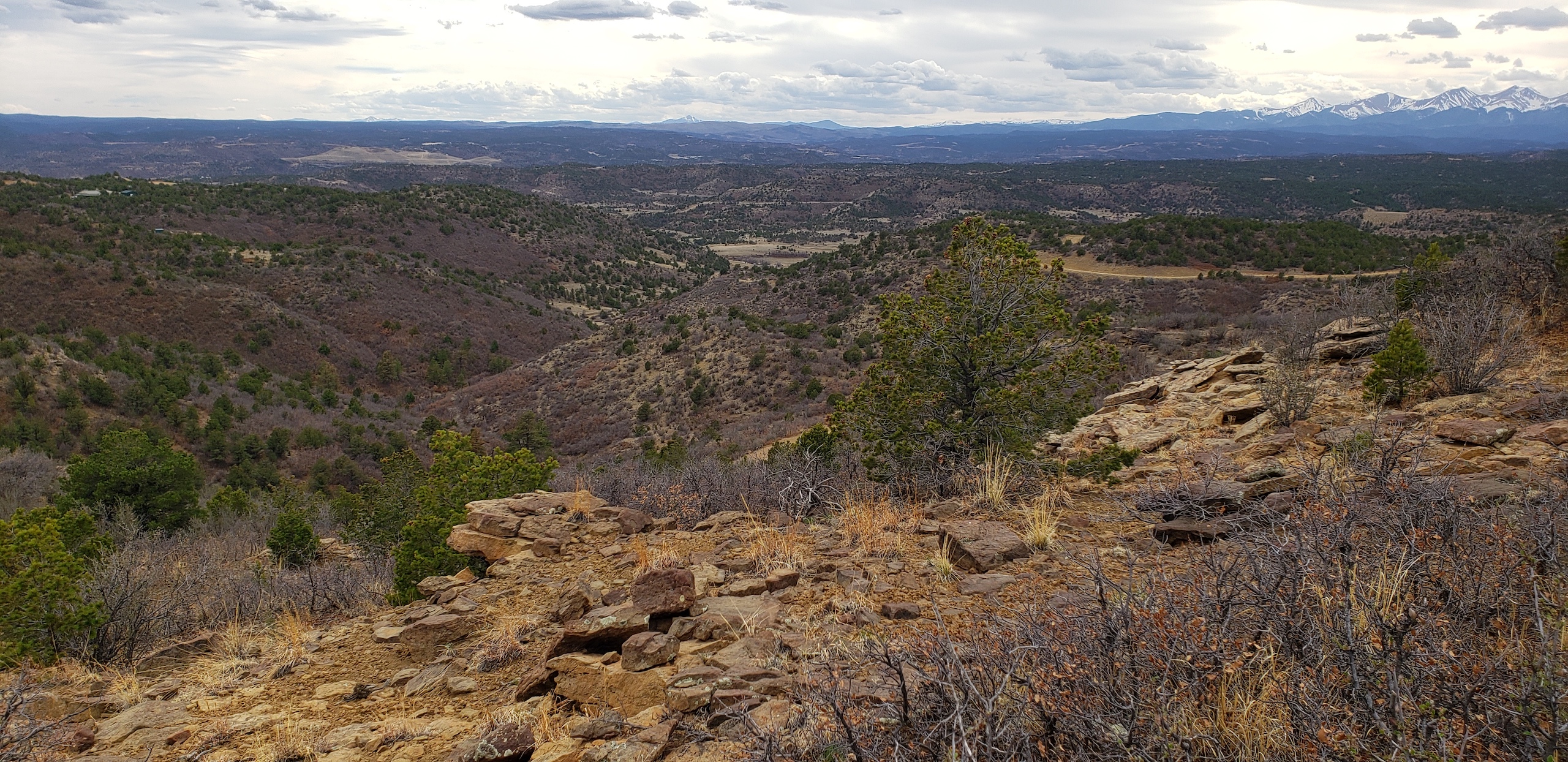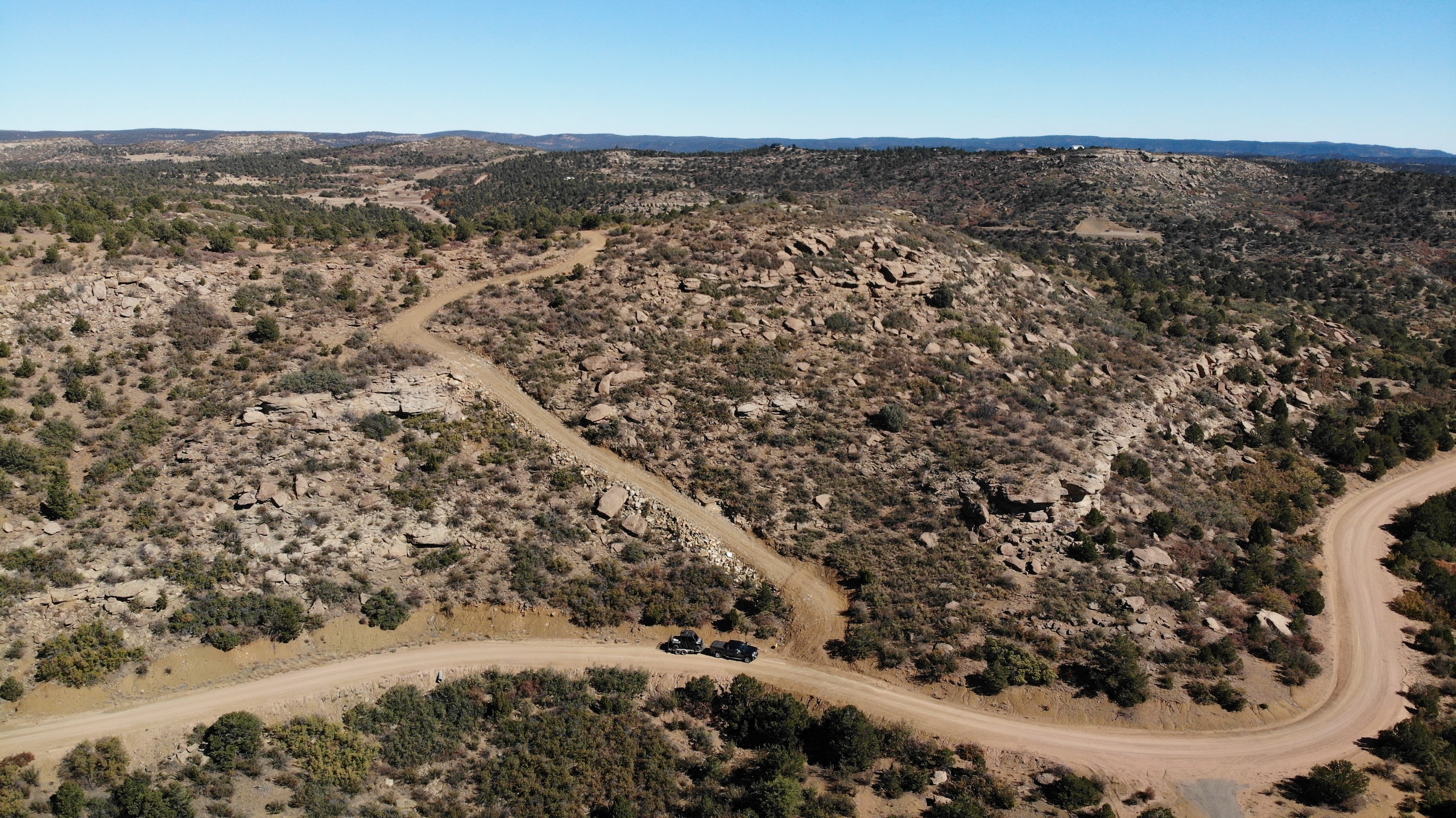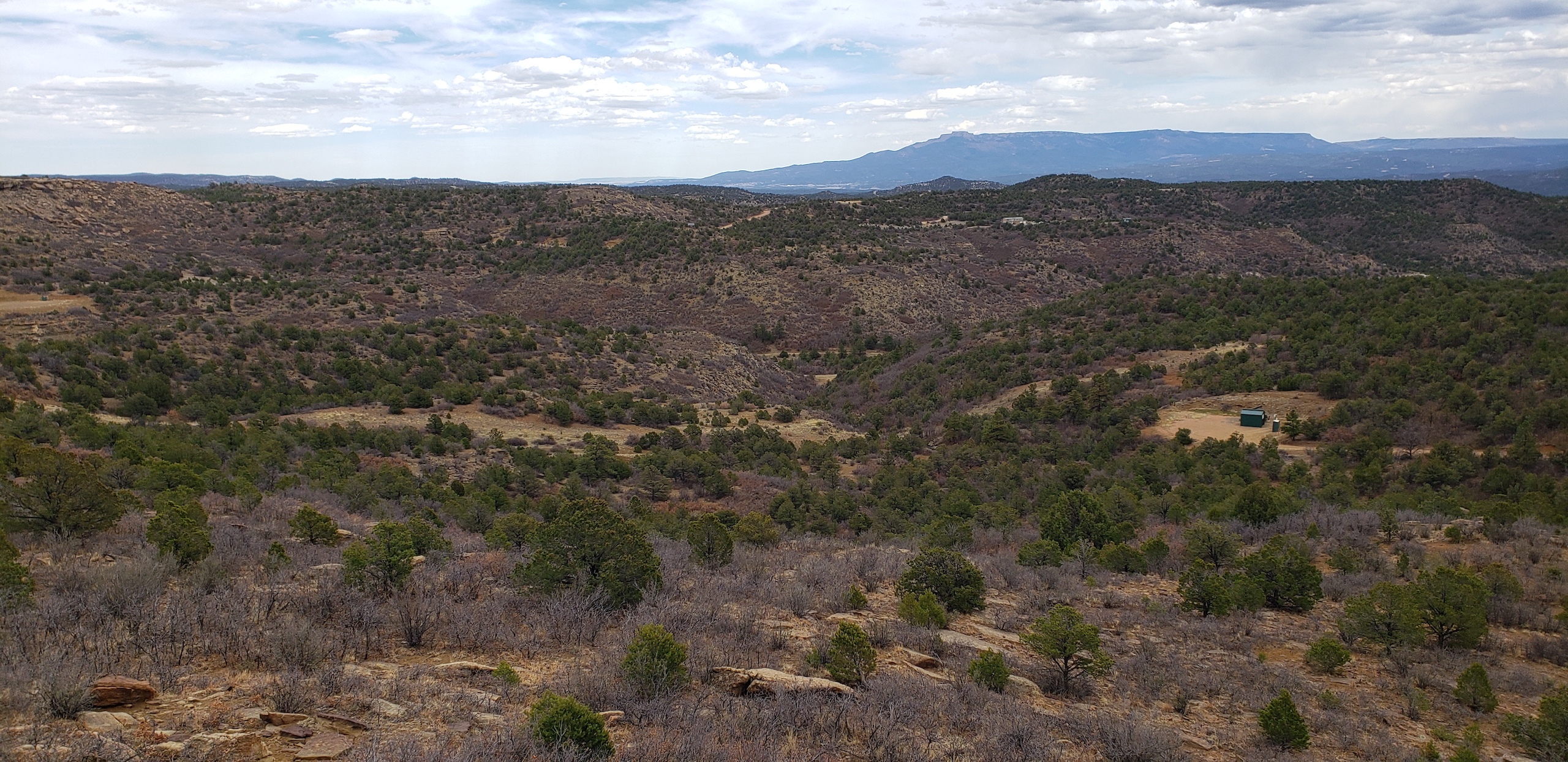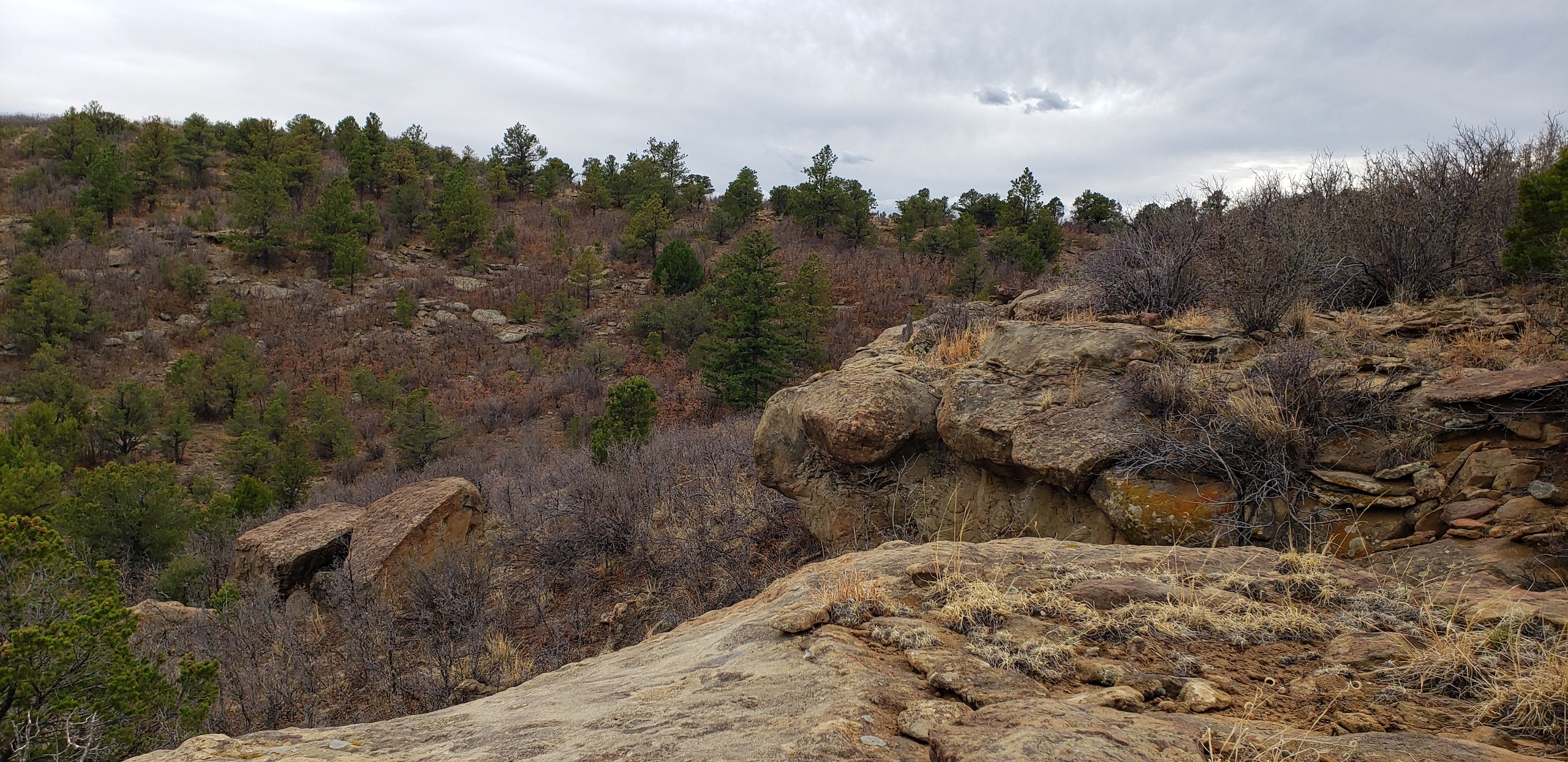 - Mountainous terrain with large rock outcroppings, pinon, juniper, and oak brush