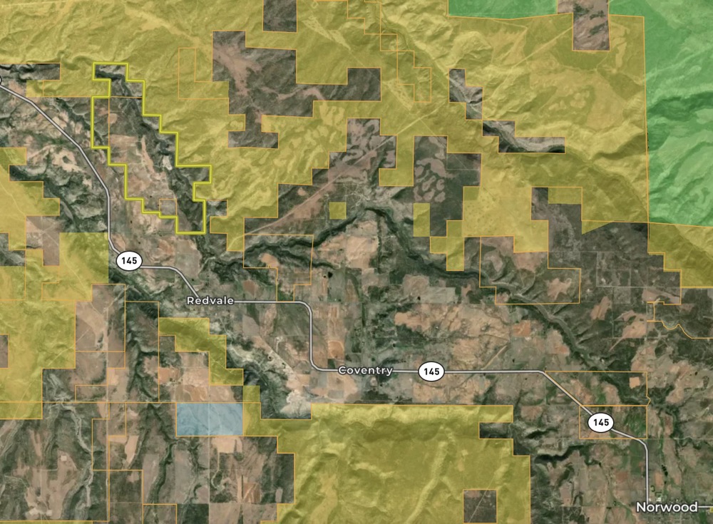 This 1,365-acre ranch near Redvale, Colorado, offers a blend of natural beauty, functionality and recreational opportunities. Key features include: Equestrian Facilities: An outdoor riding arena with stalls and multiple horse turnout areas. Agriculture: Irrigated hay crop fields managed with 140 shares of water, distributed via underground pipes with gated or side rolls. Wildlife and Hunting: A history of trophy mule deer and elk, ideal for outdoor enthusiasts or hunters. Living Spaces: A charming farmhouse with views of Lone Cone Peak and a smaller cabin/bunkhouse. Outbuildings: Multiple outbuildings for storage or agricultural use. Accessibility: Easy access via a maintained county road, just one hour from Telluride and minutes from Norwood. Private Gravel Pit: On-site resource to maintain the ranch’s interior roads. The ranch is also part of Colorado's LPP (Landowner Preference Program), enhancing its appeal for hunting opportunities. This exceptional property is primed for its next chapter.
