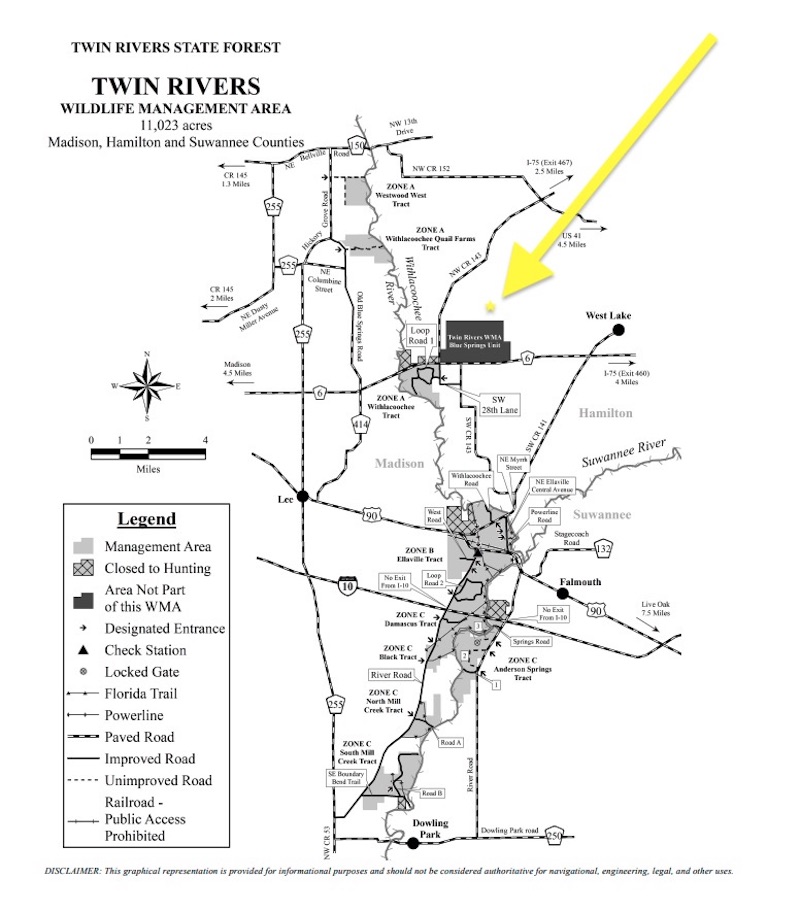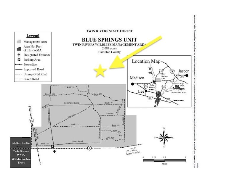 Directly south of the property, across a peanut field, is the Blue Springs Unit of Twin Rivers State Forest. This 2,082-acre tract is closed to deer hunting, creating a substantial block of preserved habitat in close proximity. The combination of surrounding agriculture, large tracts of conservation land, and the property’s own natural features help sustain consistent wildlife movement and growth around the area.