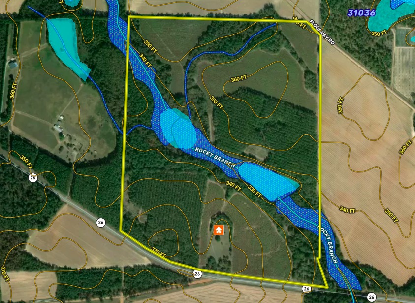 - Property has seasonal water in Rocky Branch and its tributaries, ample cover, and natural browse for wild game