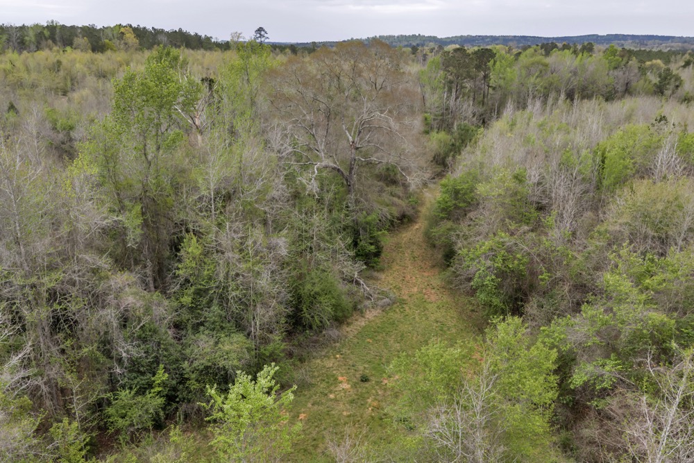 A creek runs through the property, providing a natural water source and enhancing habitat diversity. The presence of water can support wildlife activity and contribute to the land's overall character. The combination of water, cover, and open areas creates a property layout that allows multiple hunters to hunt simultaneously while maintaining separation between hunting locations.