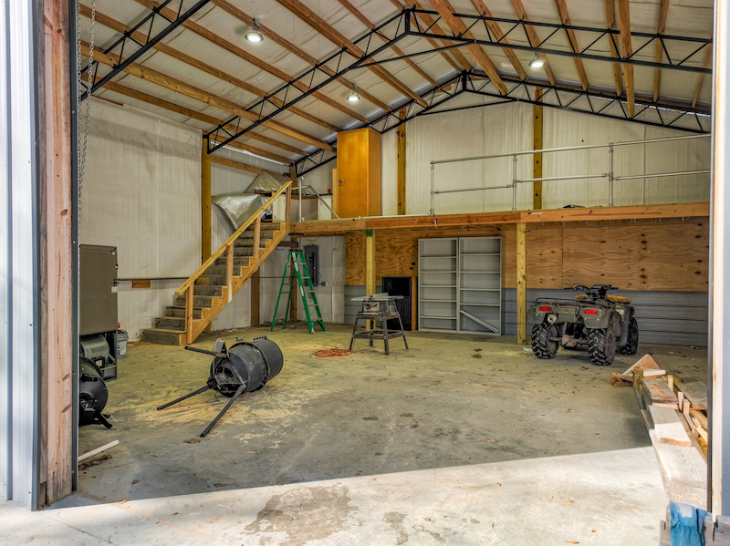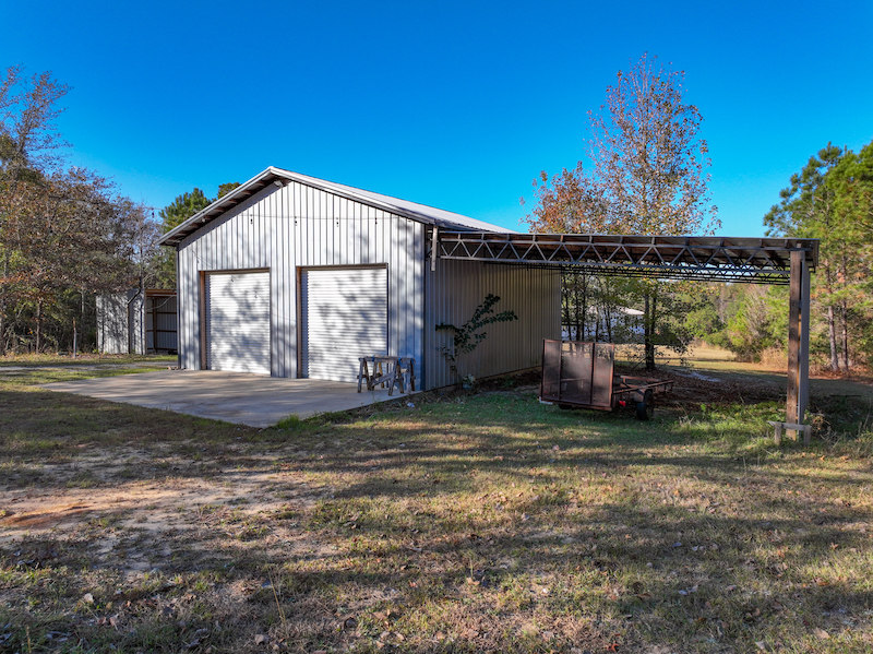 - Metal shop on concrete slab with exterior pad, overhang, and rear covered storage
