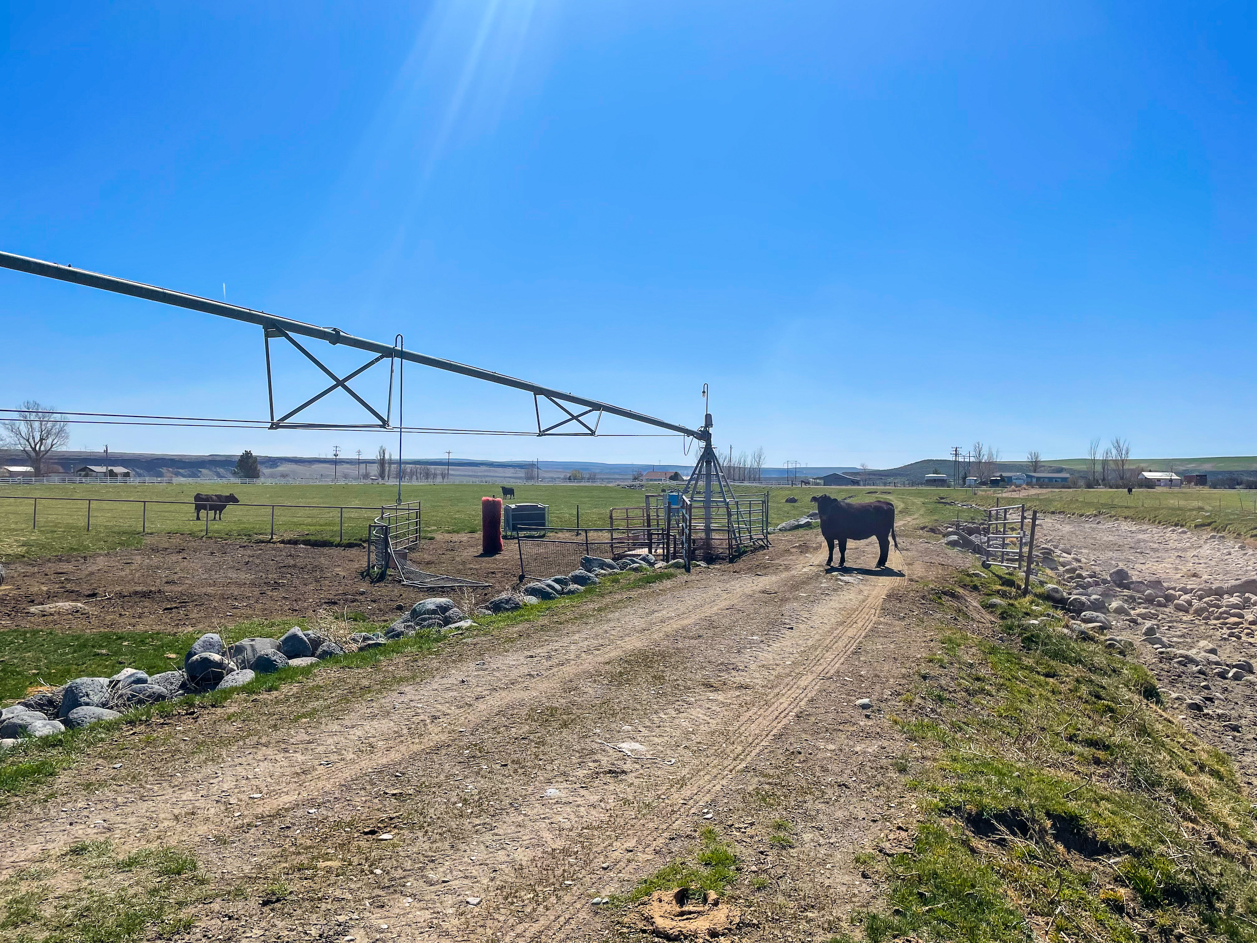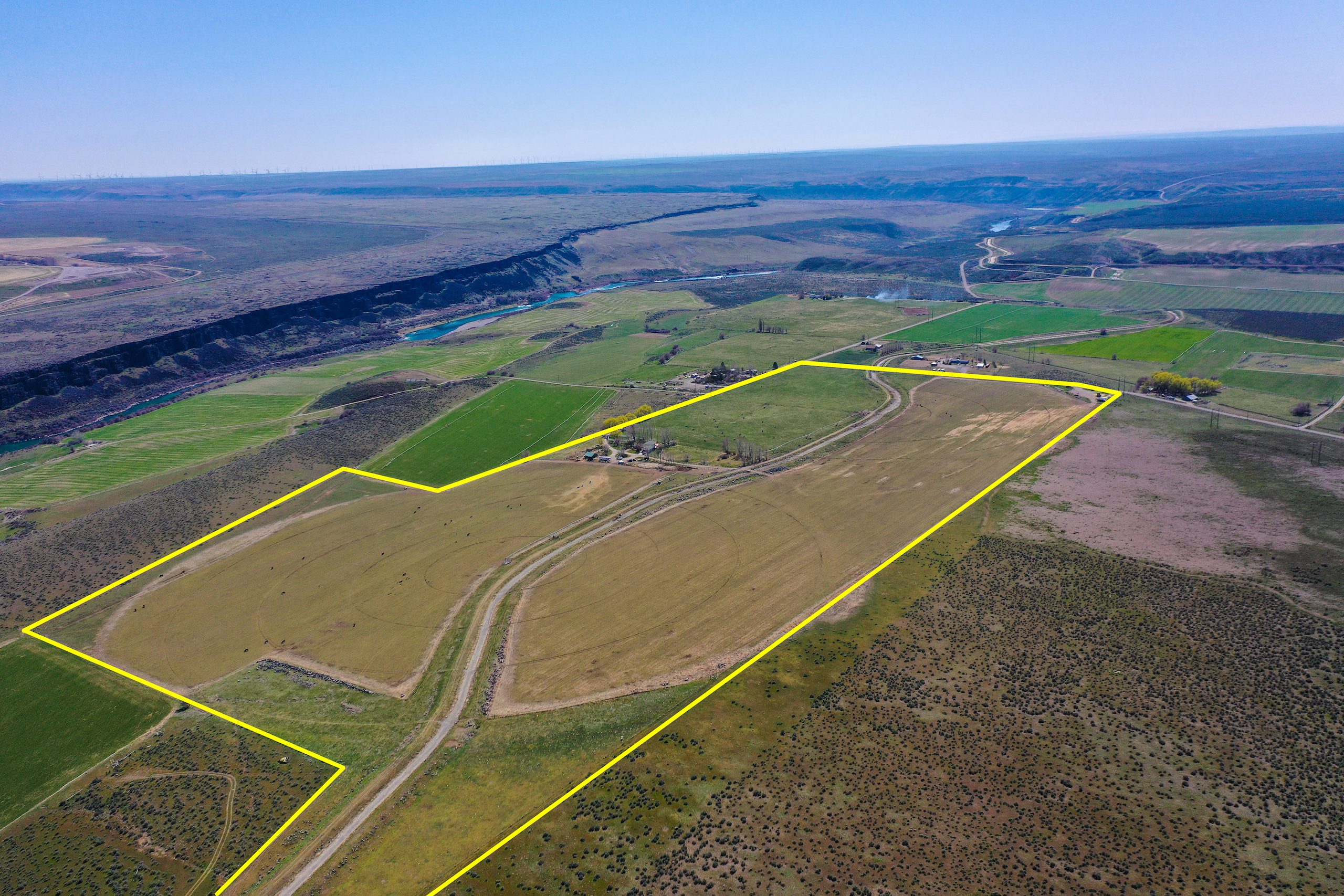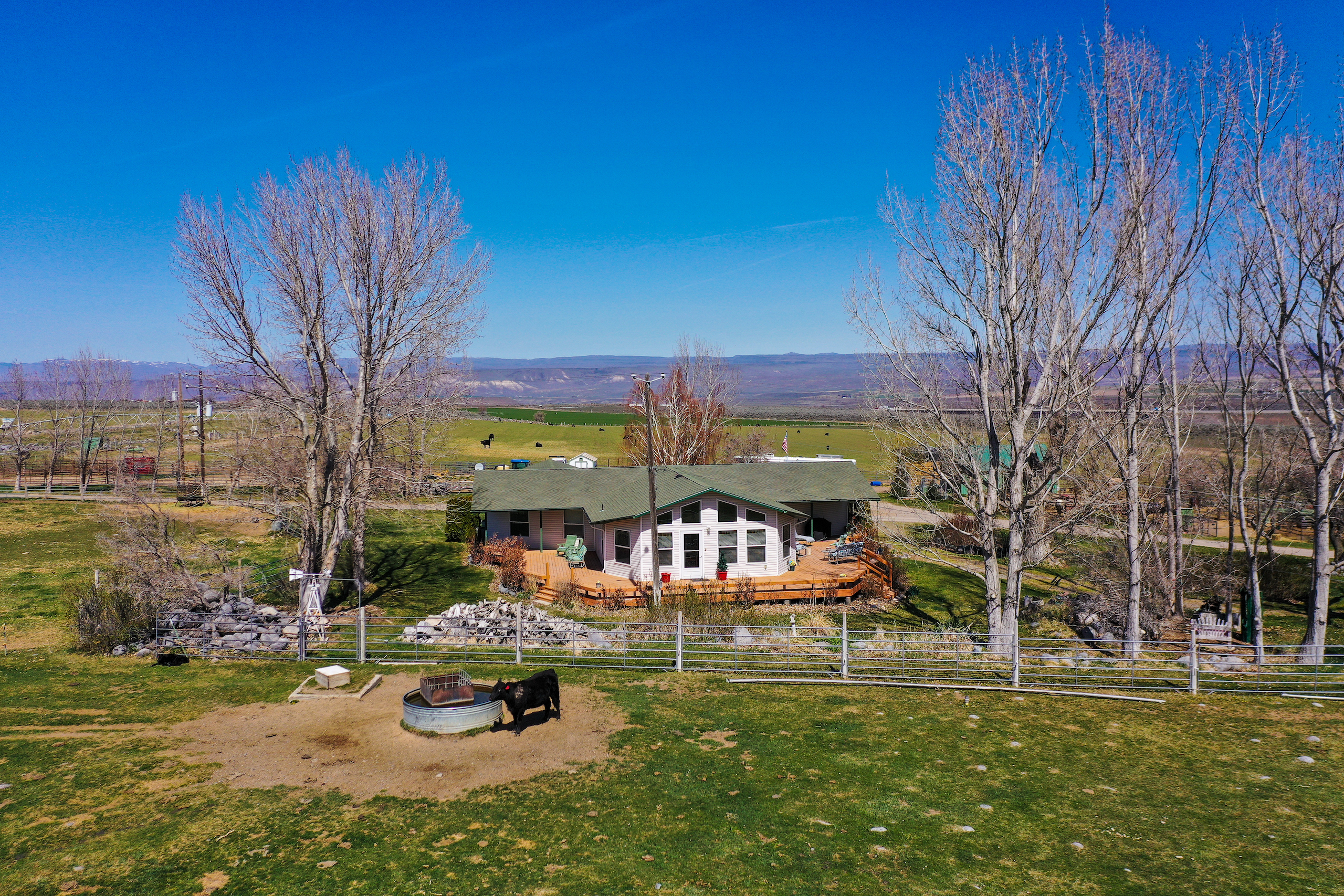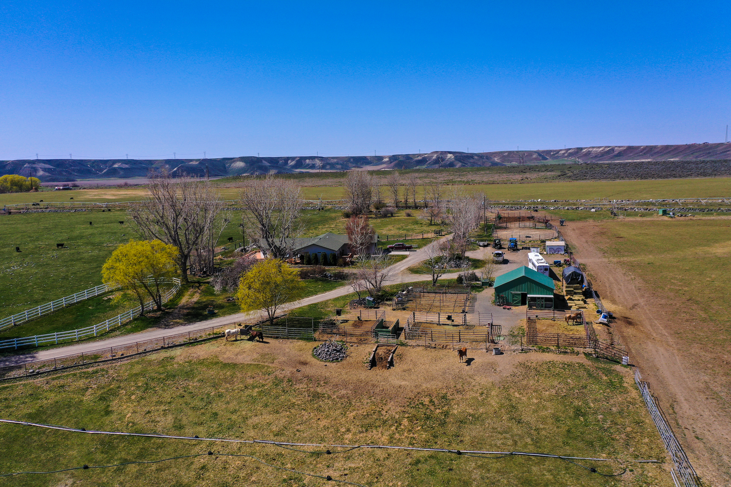 The Fallen Tree Ranch finds itself at the end of a road on the bluffs of the Snake River Canyon in King Hill, Idaho. A white post and rail fence lined with mature hardwoods brings you to the center of the ranch where the well-appointed three bedroom, two bath, 2400 sq ft home with vaulted ceilings and rear wrapping porch takes advantage of the panoramic views and privacy. Opposite the home is multiple horse and cattle corrals, pens, tack room and pastures. The facility layout provides ample space for machine movement and parking with plenty of room for infrastructure expansion. Presently, 64+/- acres are annually leased on a corn/potato rotation with cattle grazing triticale after the crops come off. Running through the center of the property is King Hill Irrigation’s ditch which provides 73 acres of water pumped direct to a 4- tower and a 3-tower pivot, which cover a majority of the acreage with handlines filling in the gaps. A 300 ft domestic well provides water for the home and livestock. A well-maintained fencing system separates multiple fields for rotational grazing and animal management. The property is broken up into two parcels, 10 acres hold the home, facilities, and a portion of the field south of the home and then wrapping around that is the large 94+/- acre parcel that holds most of the irrigated ground, pivots, and ditch. This modern, well-designed ranch is turnkey and checks every box for privacy, water, space, home, facilities, and irrigated ground, making it the ideal location to expand your operation or create the ranch you have always envisioned.