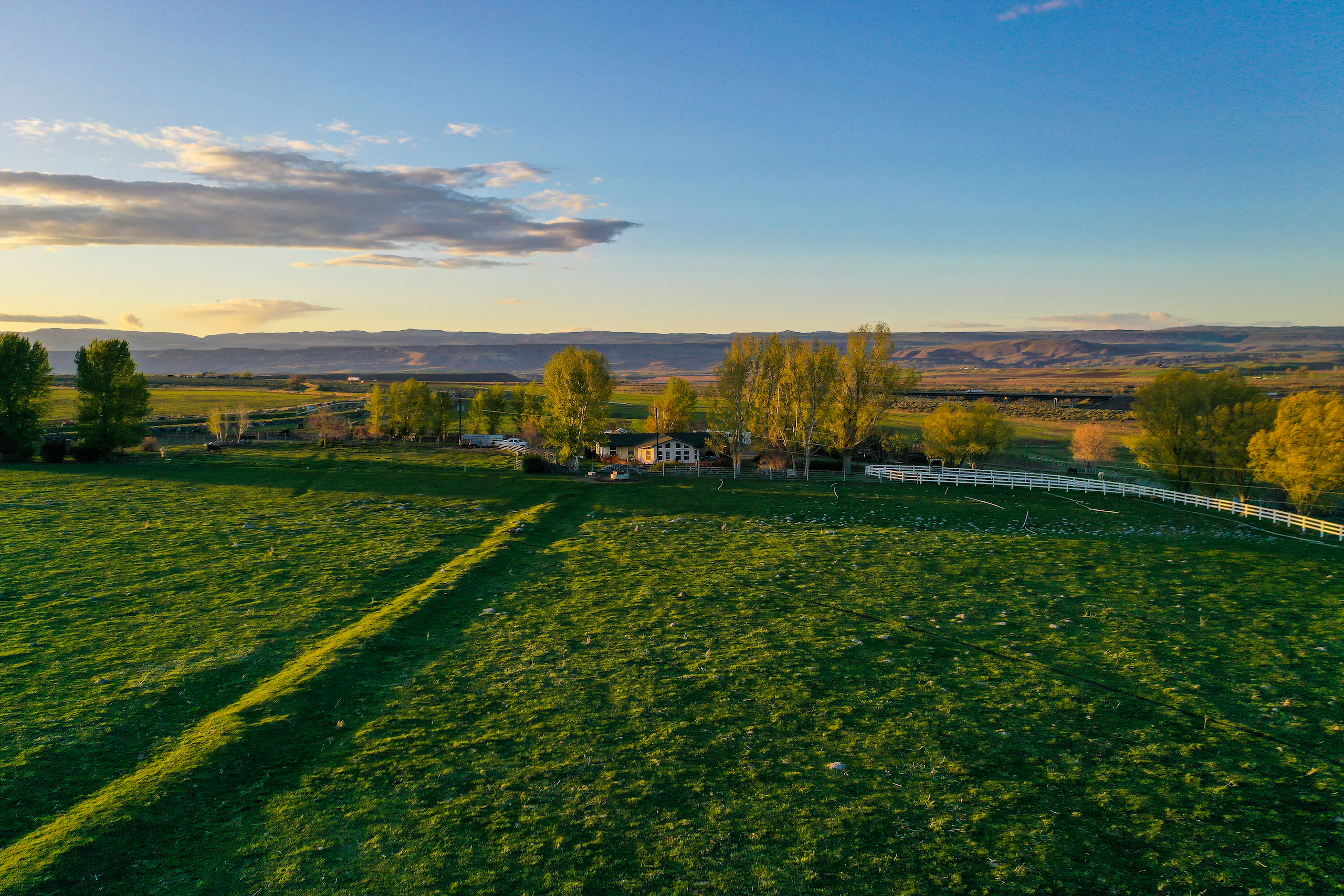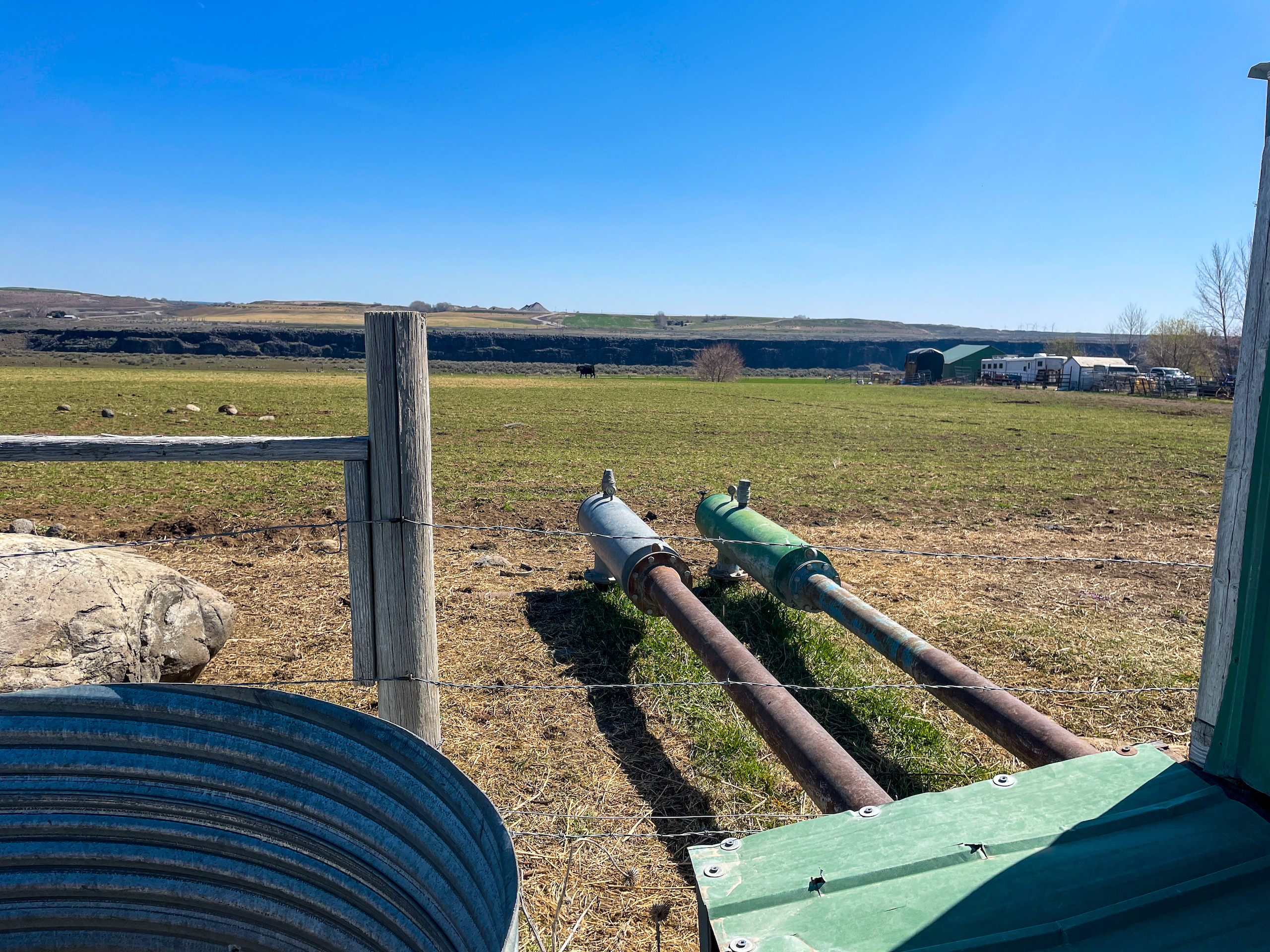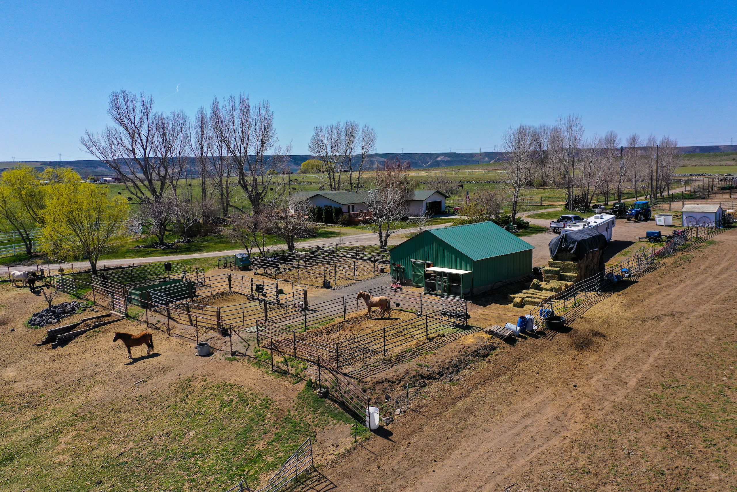 The Fallen Tree Ranch finds itself at the end of a road on the bluffs of the Snake River Canyon in King Hill, Idaho. A white post and rail fence lined with mature hardwoods brings you to the center of the ranch where the well-appointed three bedroom, two bath, 2400 sq ft home with vaulted ceilings and rear wrapping porch takes advantage of the panoramic views and privacy. Opposite the home is multiple horse and cattle corrals, pens, tack room and pastures. The facility layout provides ample space for machine movement and parking with plenty of room for infrastructure expansion. Presently, 64+/- acres are annually leased on a corn/potato rotation with cattle grazing triticale after the crops come off. Running through the center of the property is King Hill Irrigation’s ditch which provides 73 acres of water pumped direct to a 4- tower and a 3-tower pivot, which cover a majority of the acreage with handlines filling in the gaps. A 300 ft domestic well provides water for the home and livestock. A well-maintained fencing system separates multiple fields for rotational grazing and animal management. The property is broken up into two parcels, 10 acres hold the home, facilities, and a portion of the field south of the home and then wrapping around that is the large 94+/- acre parcel that holds most of the irrigated ground, pivots, and ditch. This modern, well-designed ranch is turnkey and checks every box for privacy, water, space, home, facilities, and irrigated ground, making it the ideal location to expand your operation or create the ranch you have always envisioned.