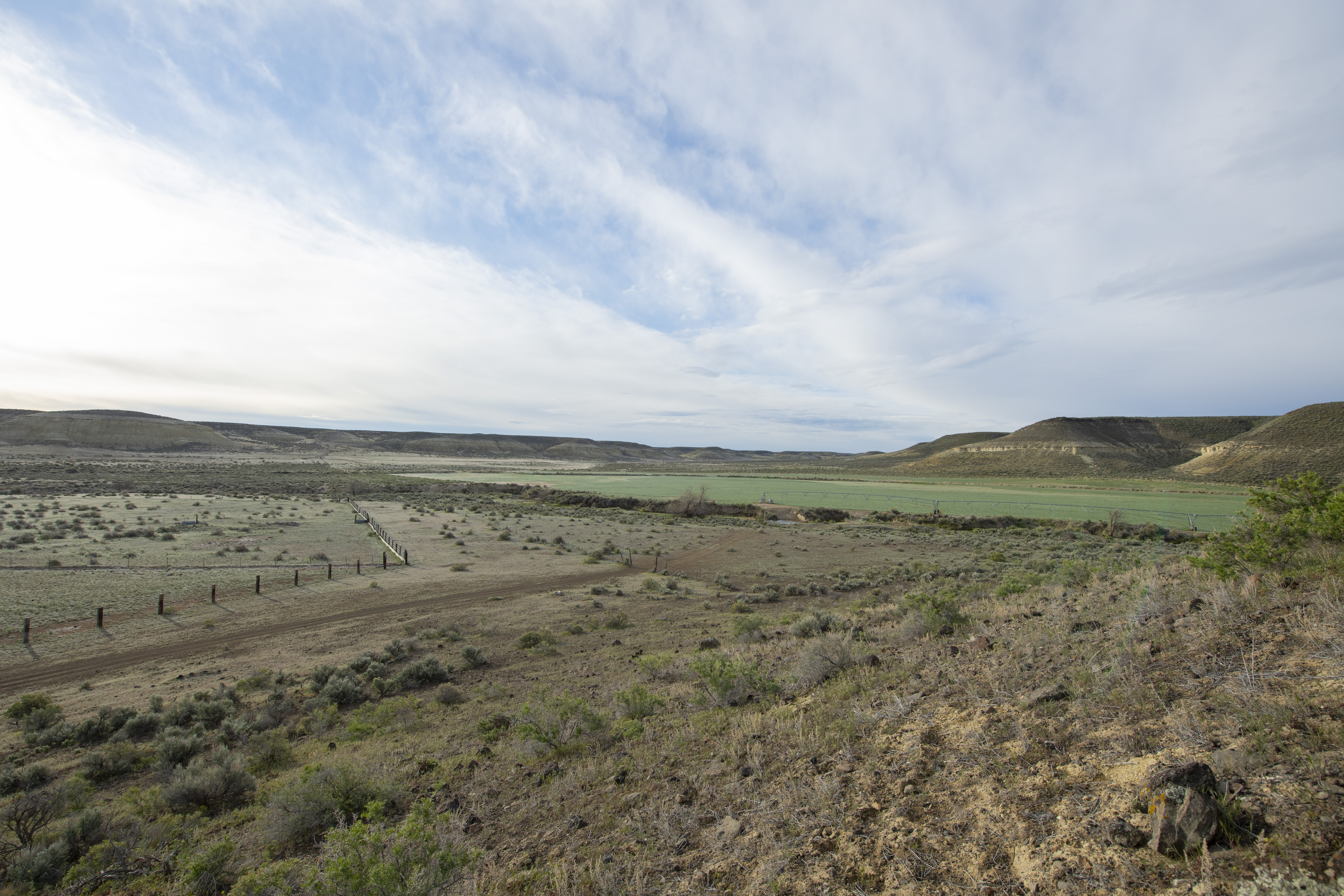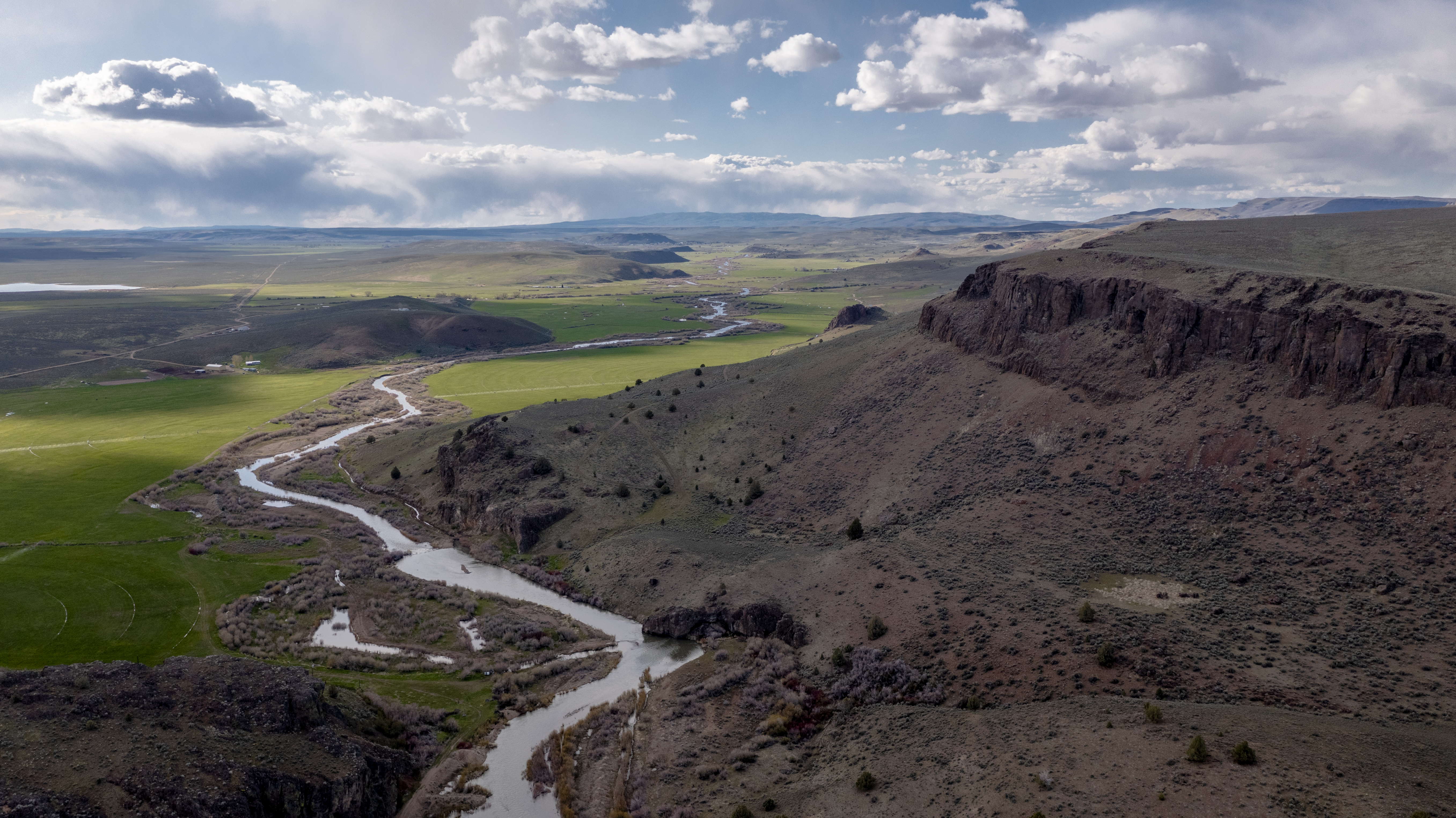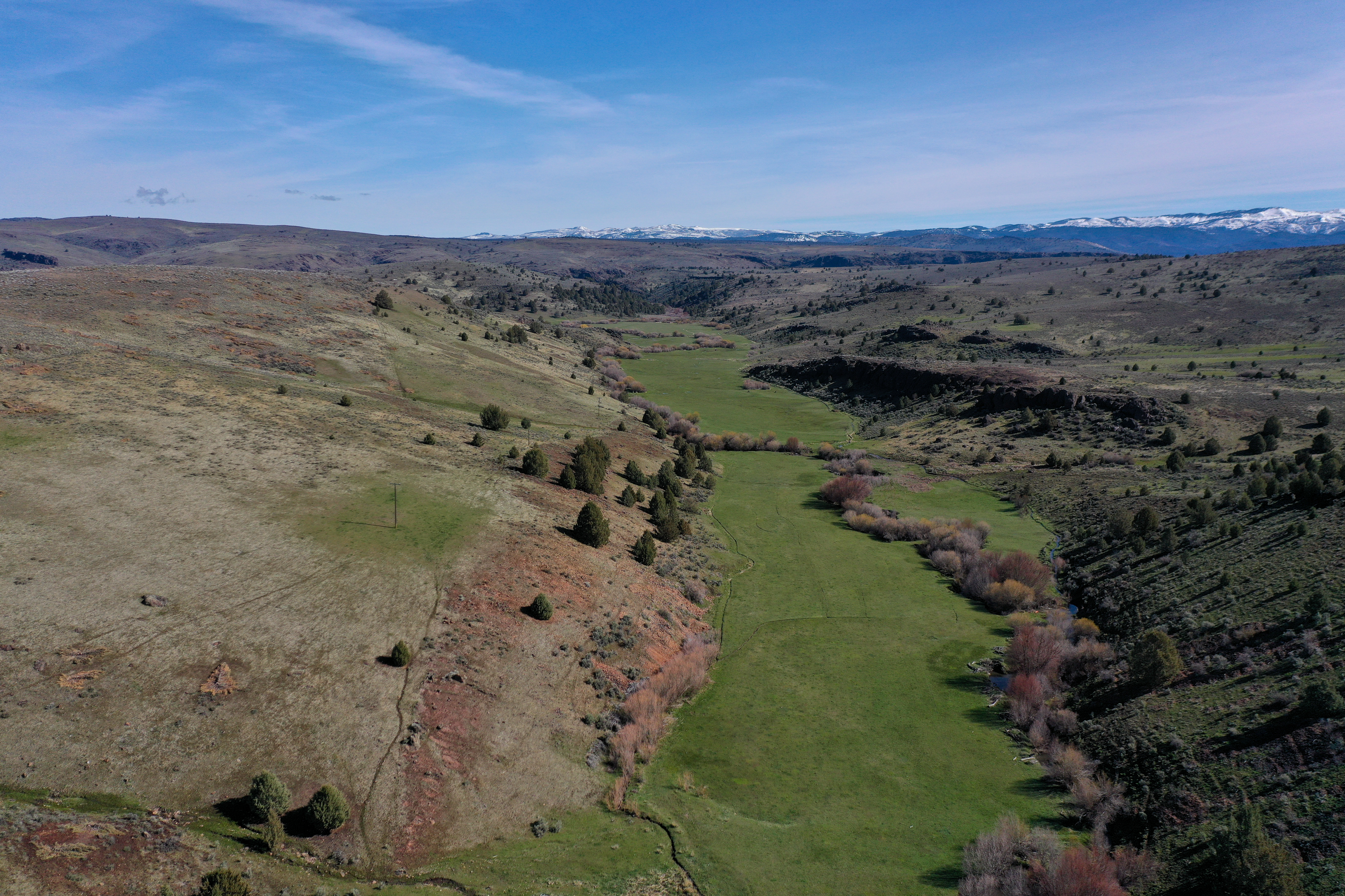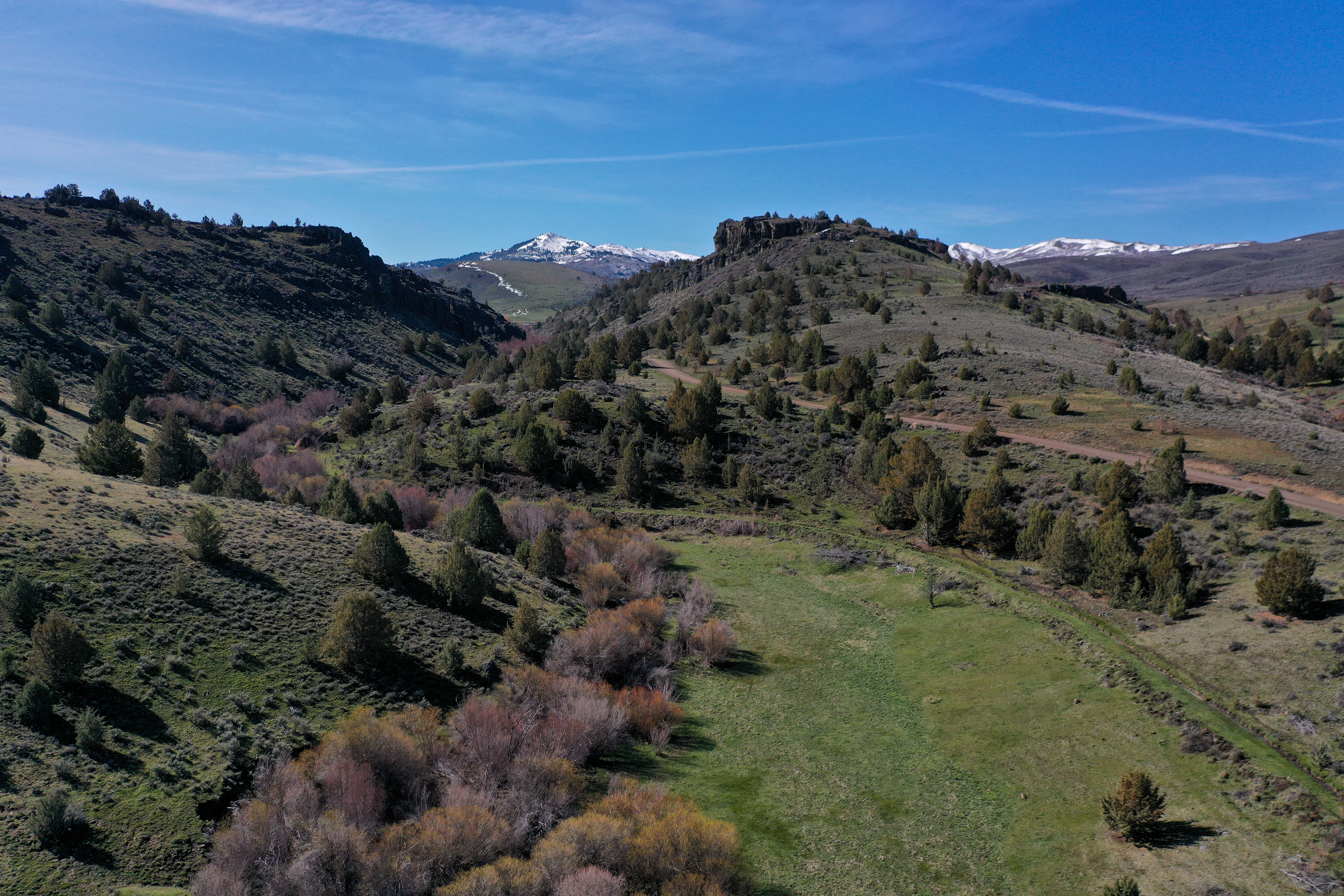 Equally as expansive and beautiful, the Oregon Ranches’ 5,100+ deeded acres lay 50 miles west in Rome, Oregon with the historic Pillars of Rome serving as its entrance. 1000 feet lower in elevation from Idaho’s low country, the dry, desert climate is ideal for winter ranges. Crooked Creek supplies water across 200+/- irrigated acres that produce about five tons an acre of hay in three cuts, with the fourth cut being left for October’s first arrival of cows. Mule deer, ducks, geese, and a host of other animals frequent this oasis in the desert that somehow seems to have more water leave the property than enters.