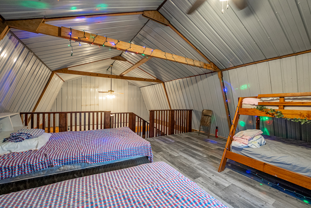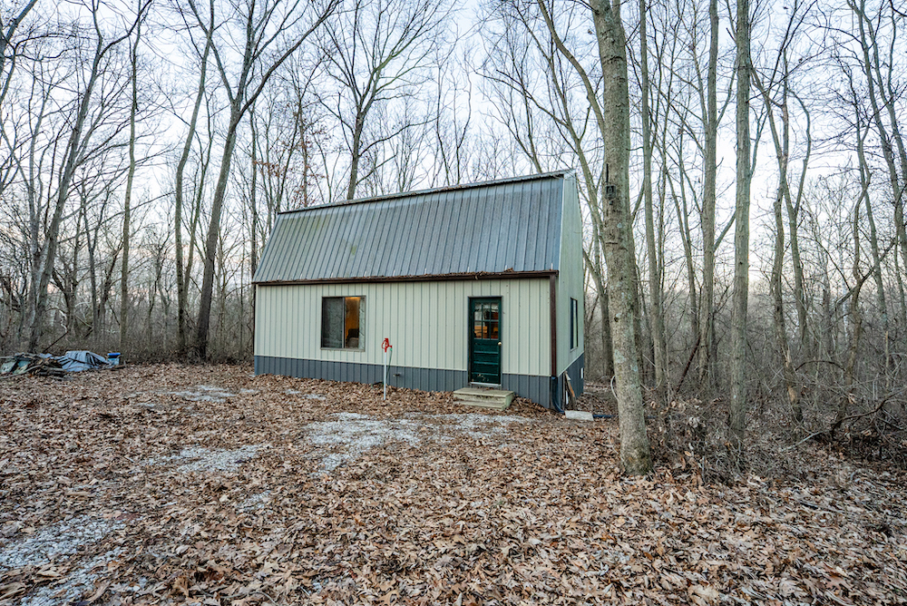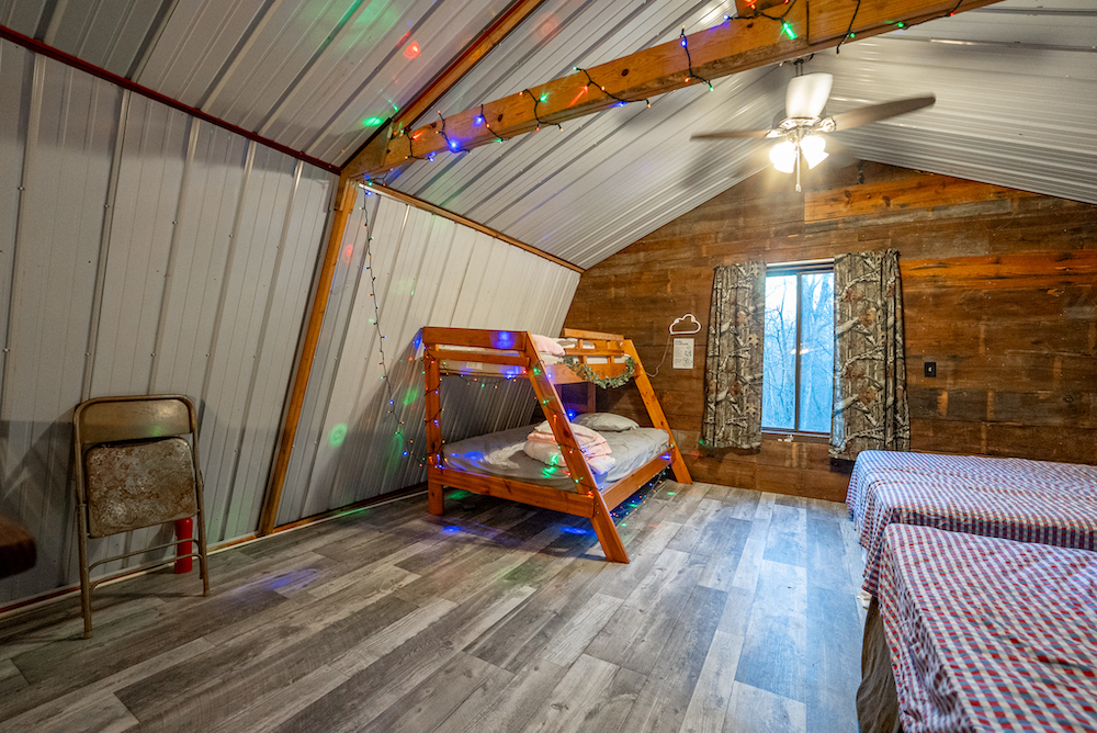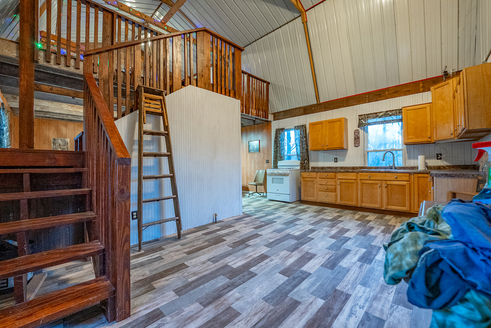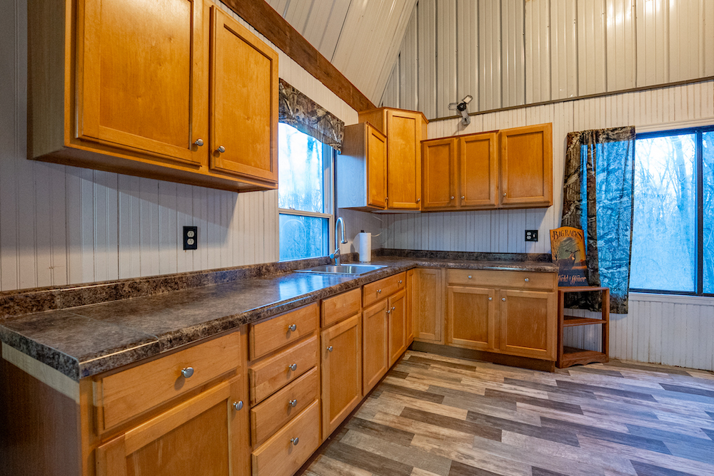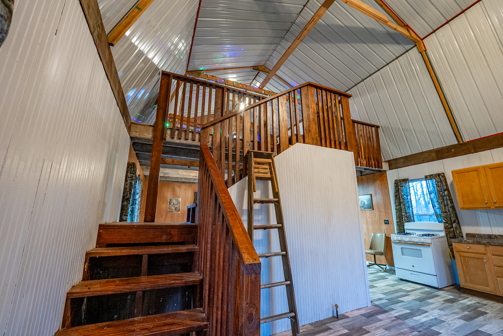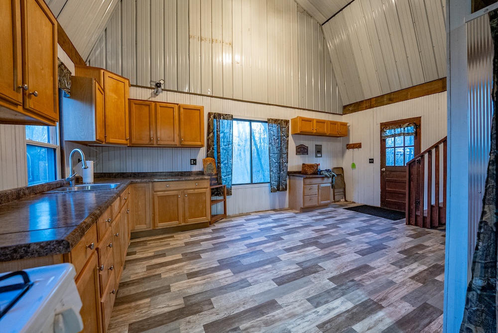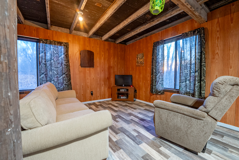 An off-grid hunting cabin is located on the property and will remain furnished. The cabin features a metal roof, updated flooring, and a functional layout designed for extended stays. Inside, there is a combined kitchen and living area, a wood-burning stove for heat, and a toilet and shower. A loft area provides sleeping space. Electricity is supplied by a generator, and propane is used for additional heating or cooking options. The cabin is positioned to support hunting use while maintaining privacy and functionality.