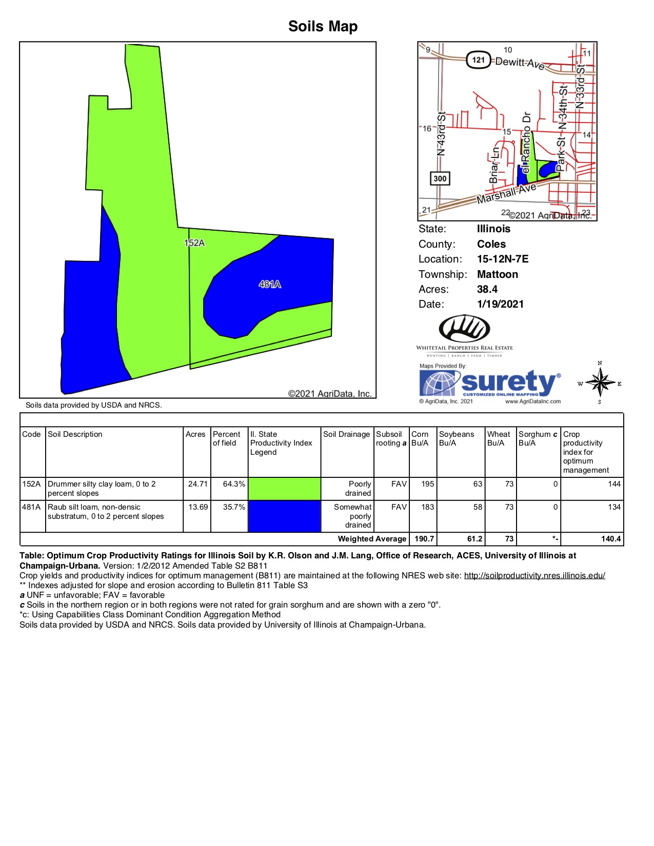 This farm is located on the west side of Mattoon and is mostly tillable. The average PI is 140 with 64% of the field being Drummer Silty Loam and 36% Raub Silt Loam. Call the listing agents today for details.