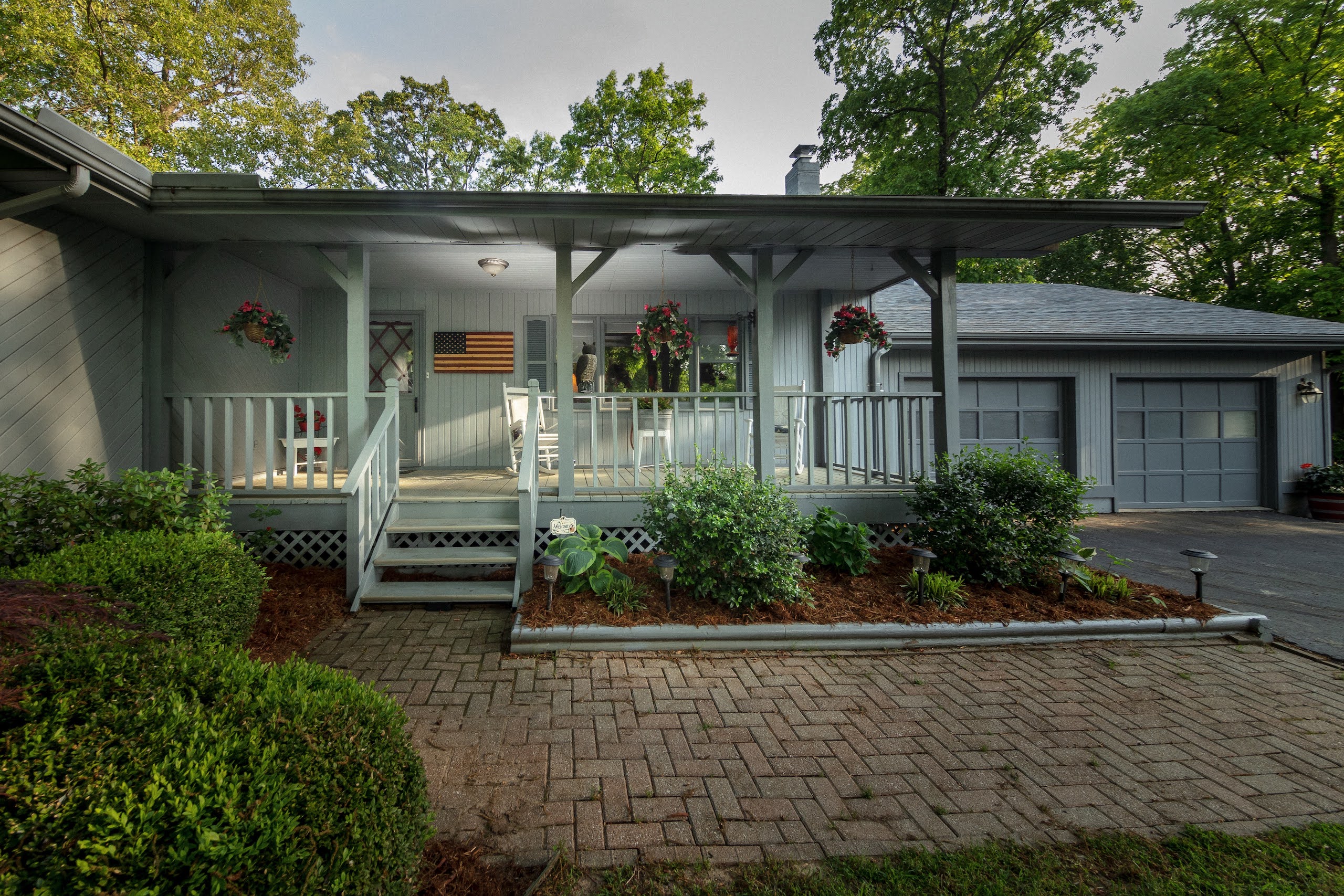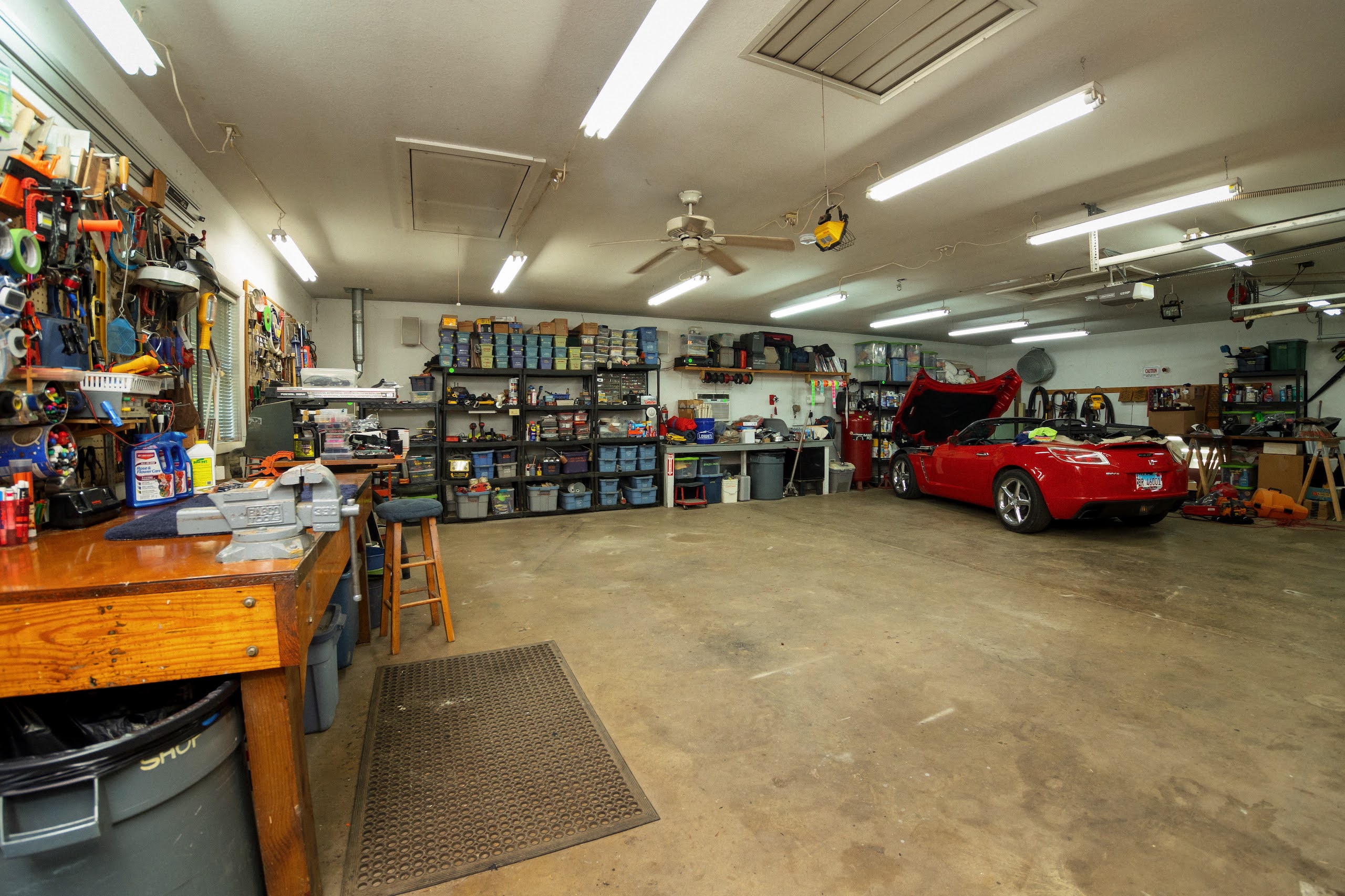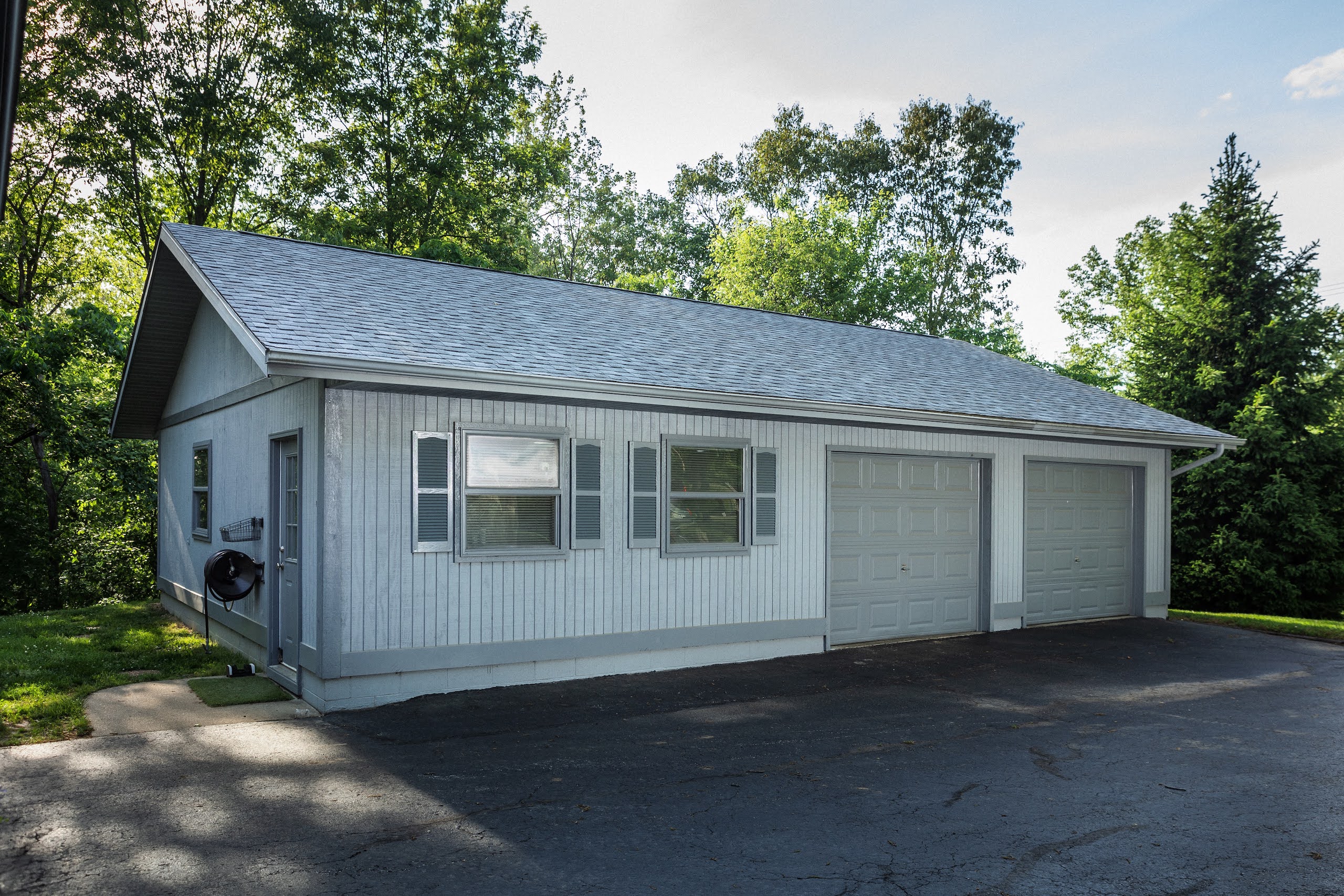 - House has an attached garage and a two-car detached garage and a work area