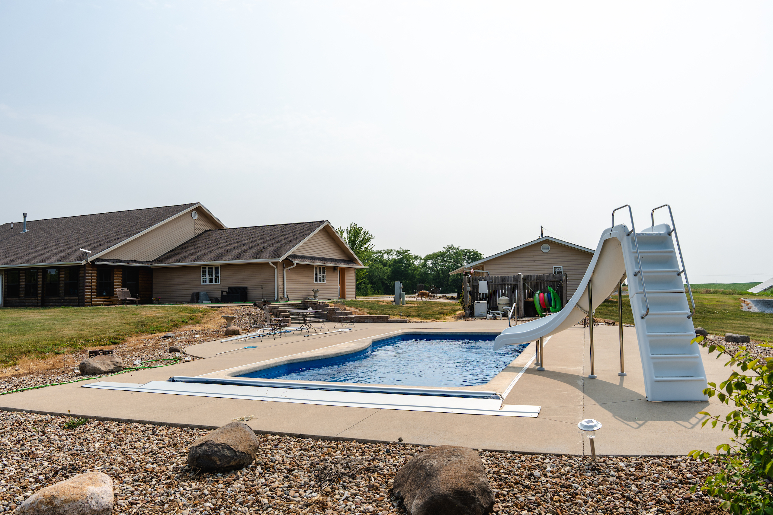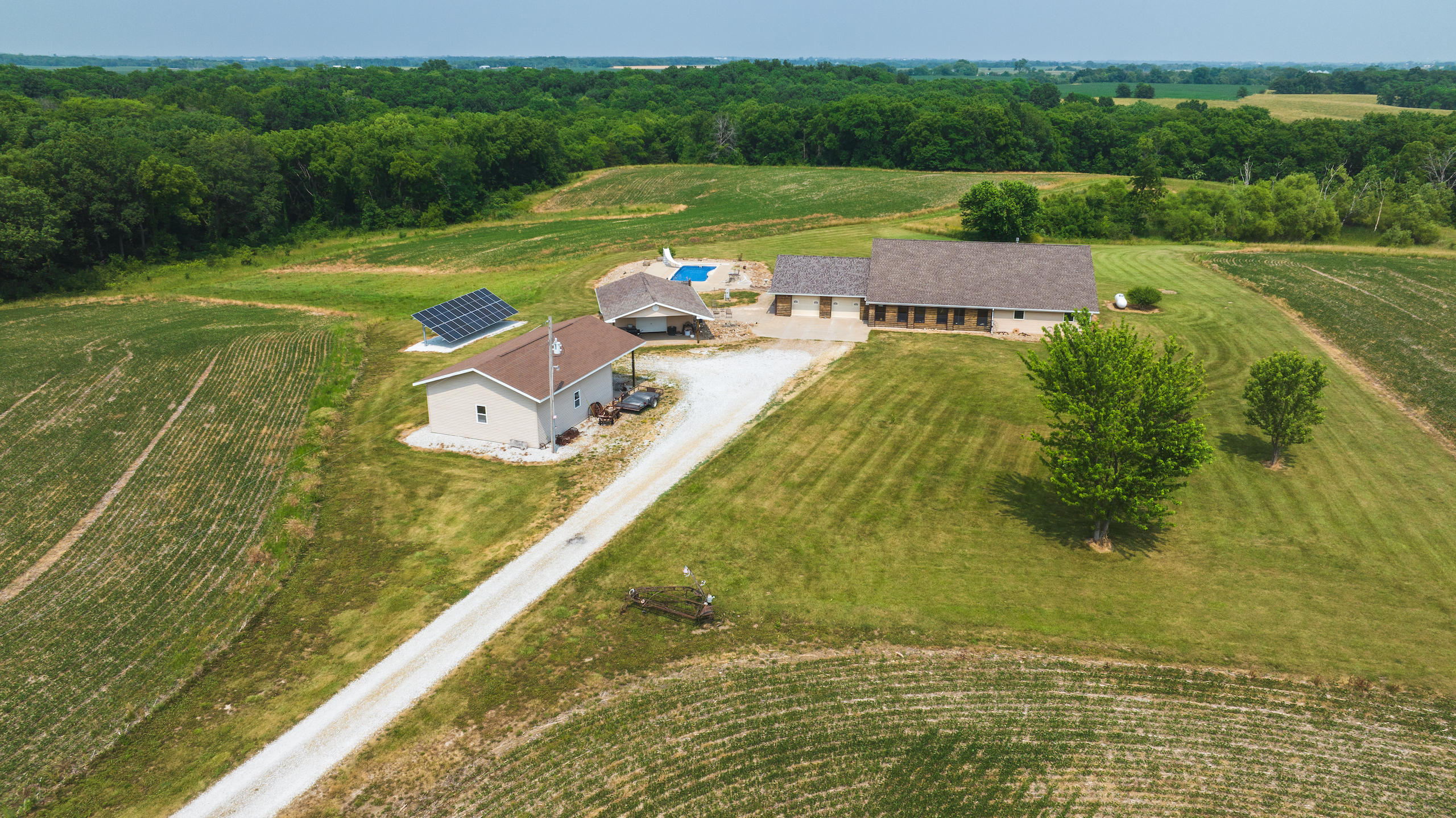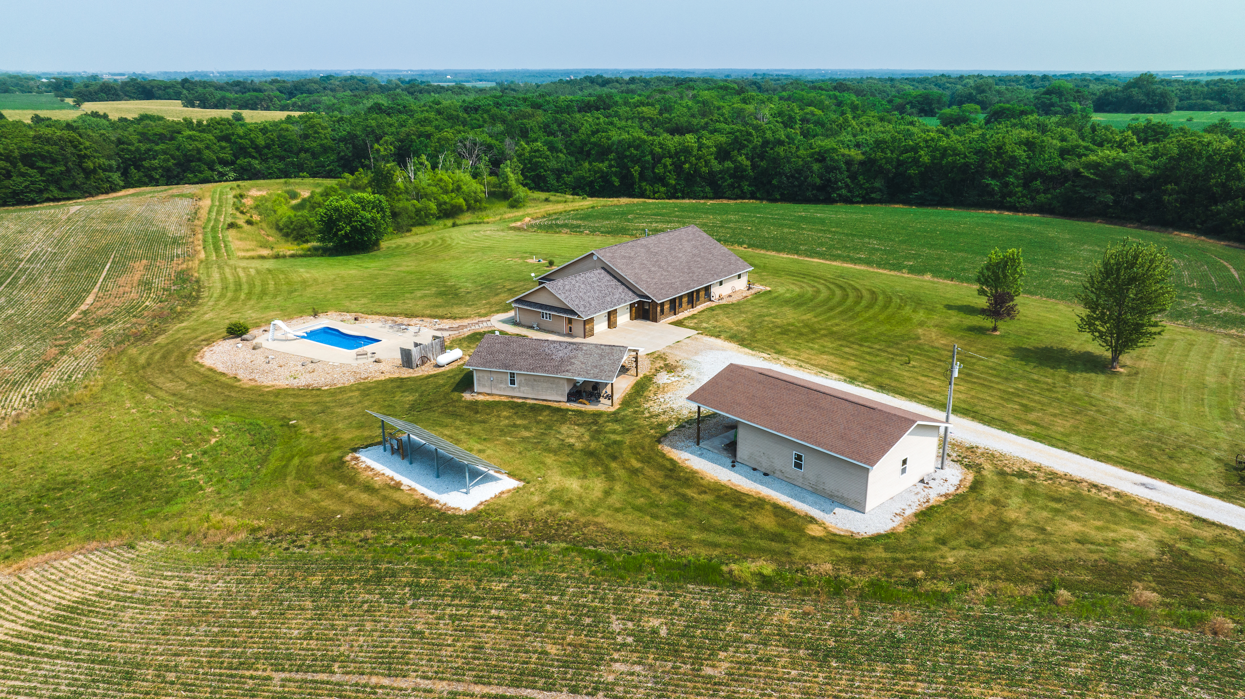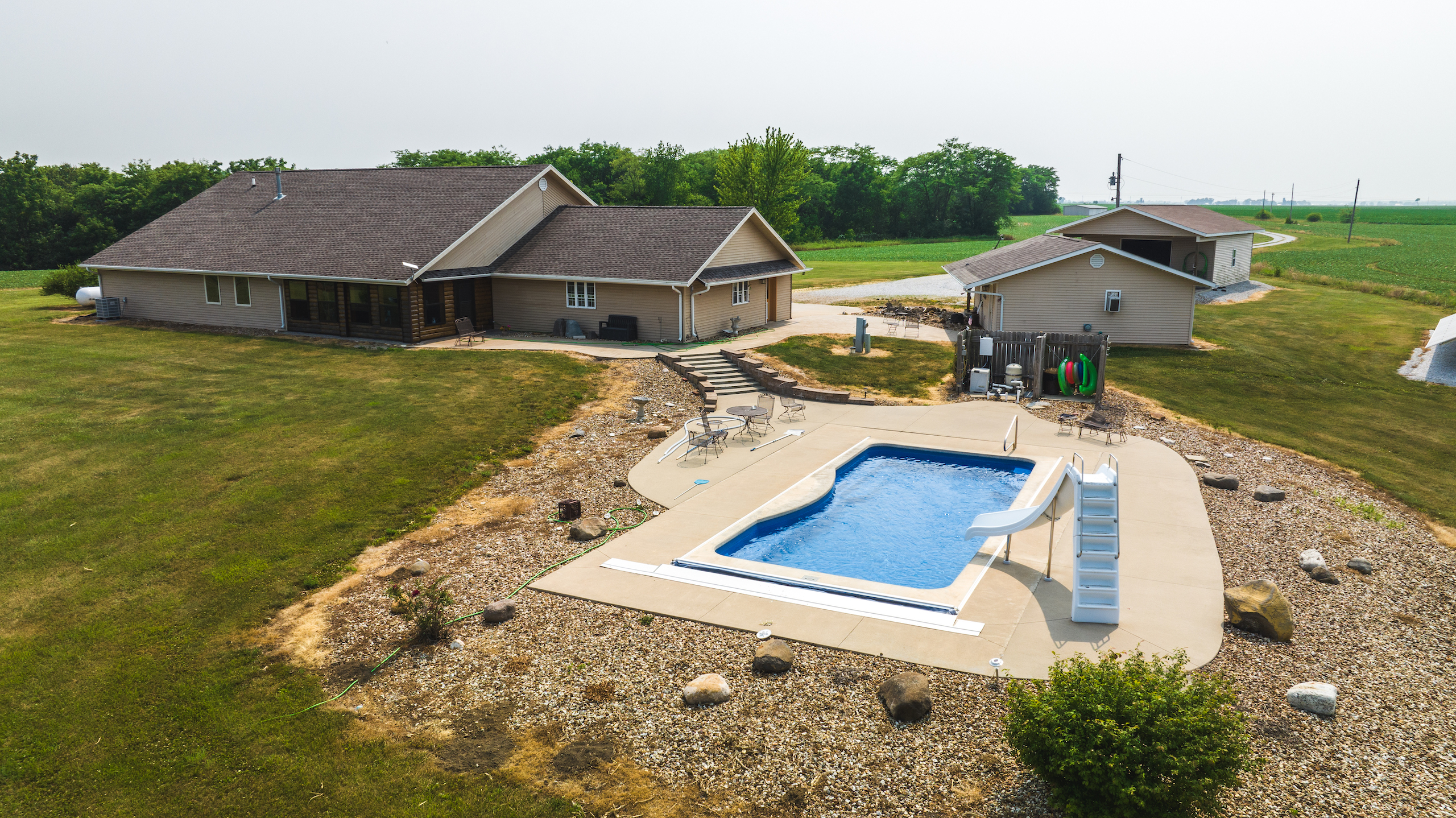 Located southeast of Hamilton is this secluded country home, a perfect home for a weekend getaway or for a family to enjoy. The house is situated down a long driveway. This custom-built ICF home was built in 2005 and is approximately 2,600 square feet of finished living area. The home has three bedrooms and two full bathrooms, including a master bedroom complete with a walk-in closet and jetted tub. The living room and dining room have an open concept and offer plenty of space for furniture and entertaining. An adjacent smaller living room has excellent countryside views that would make a great office area or playroom for the kids. The large kitchen is perfect for cooking for a large family or entertaining guests. The laundry room and pantry/mechanical room are adjacent to the kitchen/dining room. There is a 30’x30’ attached two-car garage located on the north side of the house. There are two additional buildings which are 24’x26’ and 26’x32’, next to the house. The smaller of the two has been partially finished with heat and air. It is currently being used as an office. There is a large outdoor patio on the southeast side of the house and a 15’x40’ in-ground heated swimming pool. If you are in the market for a top-quality county home, give the listing land specialist a call today for more information or to schedule a private showing.