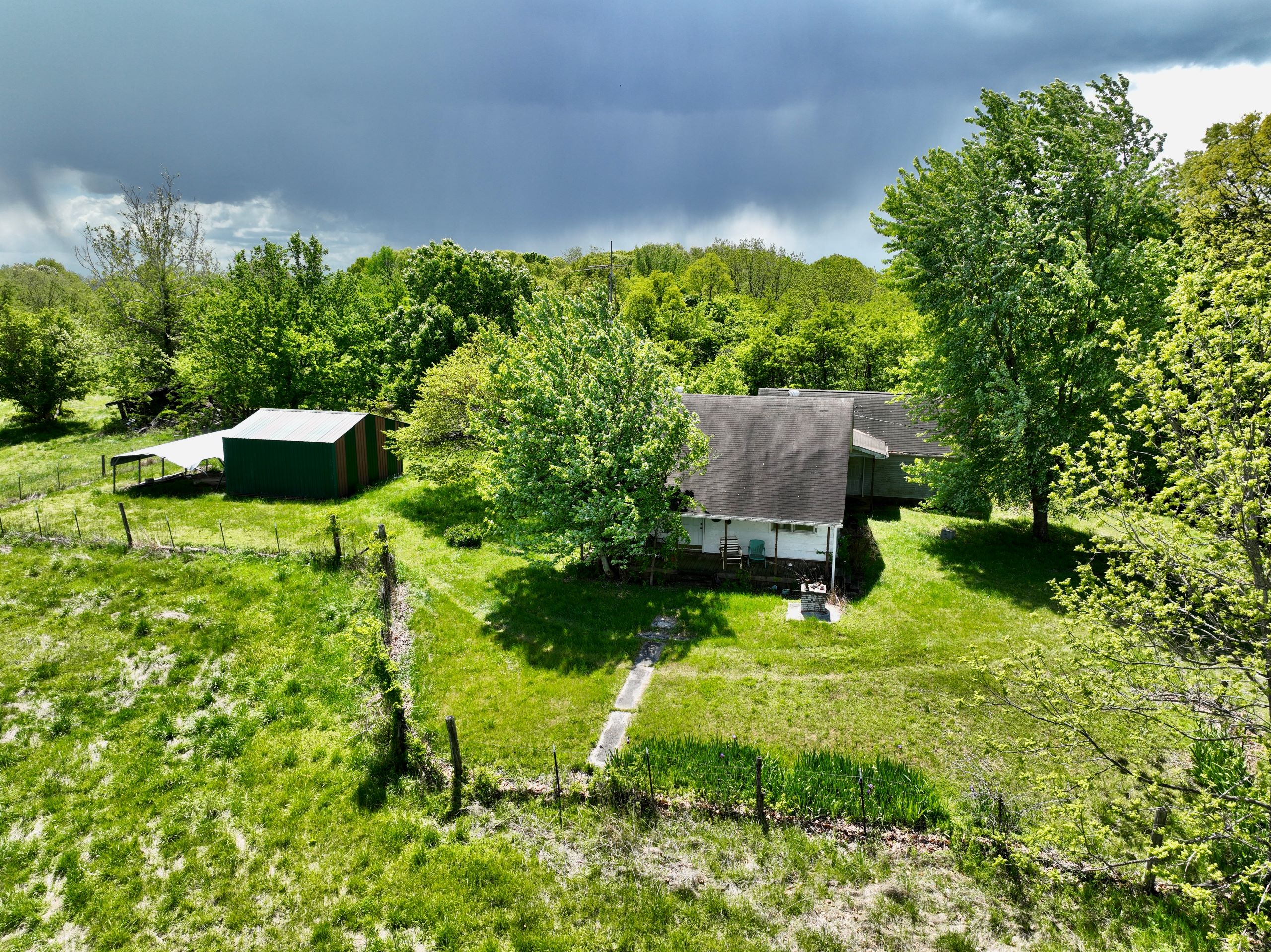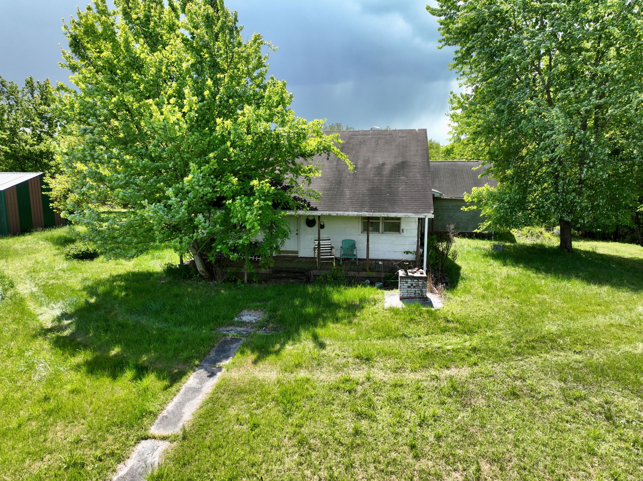- 2BR/1BA farmhouse with detached 2-car garage and storage buildings