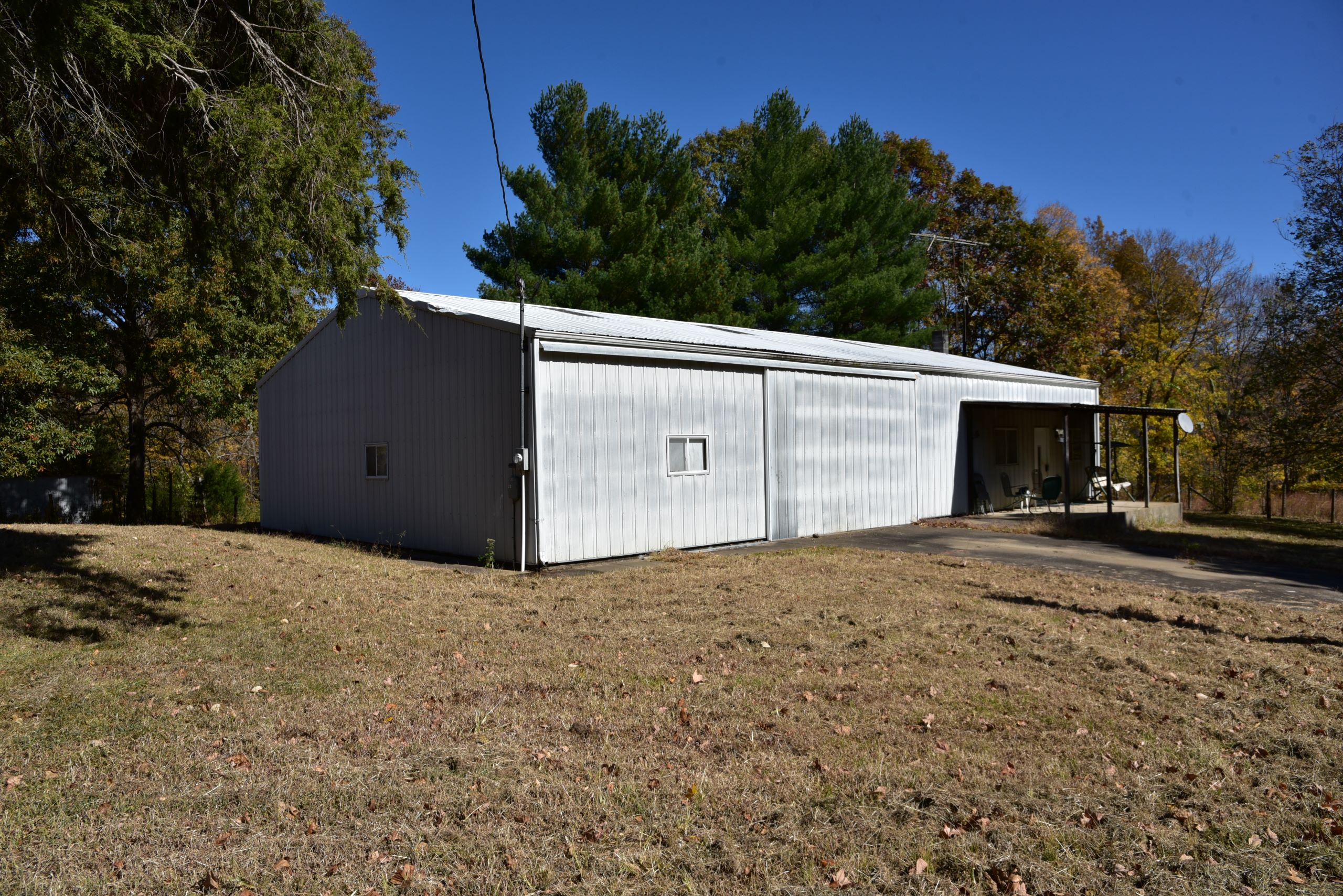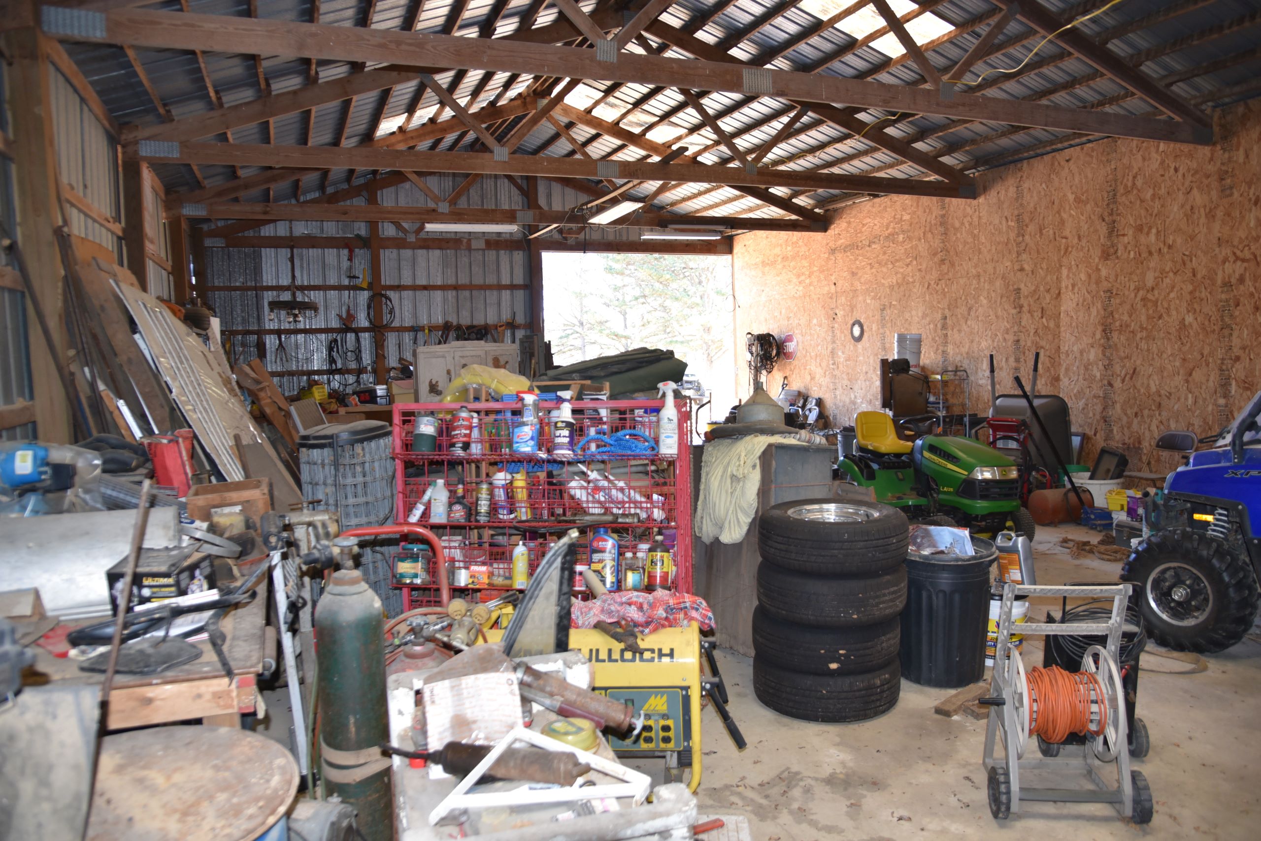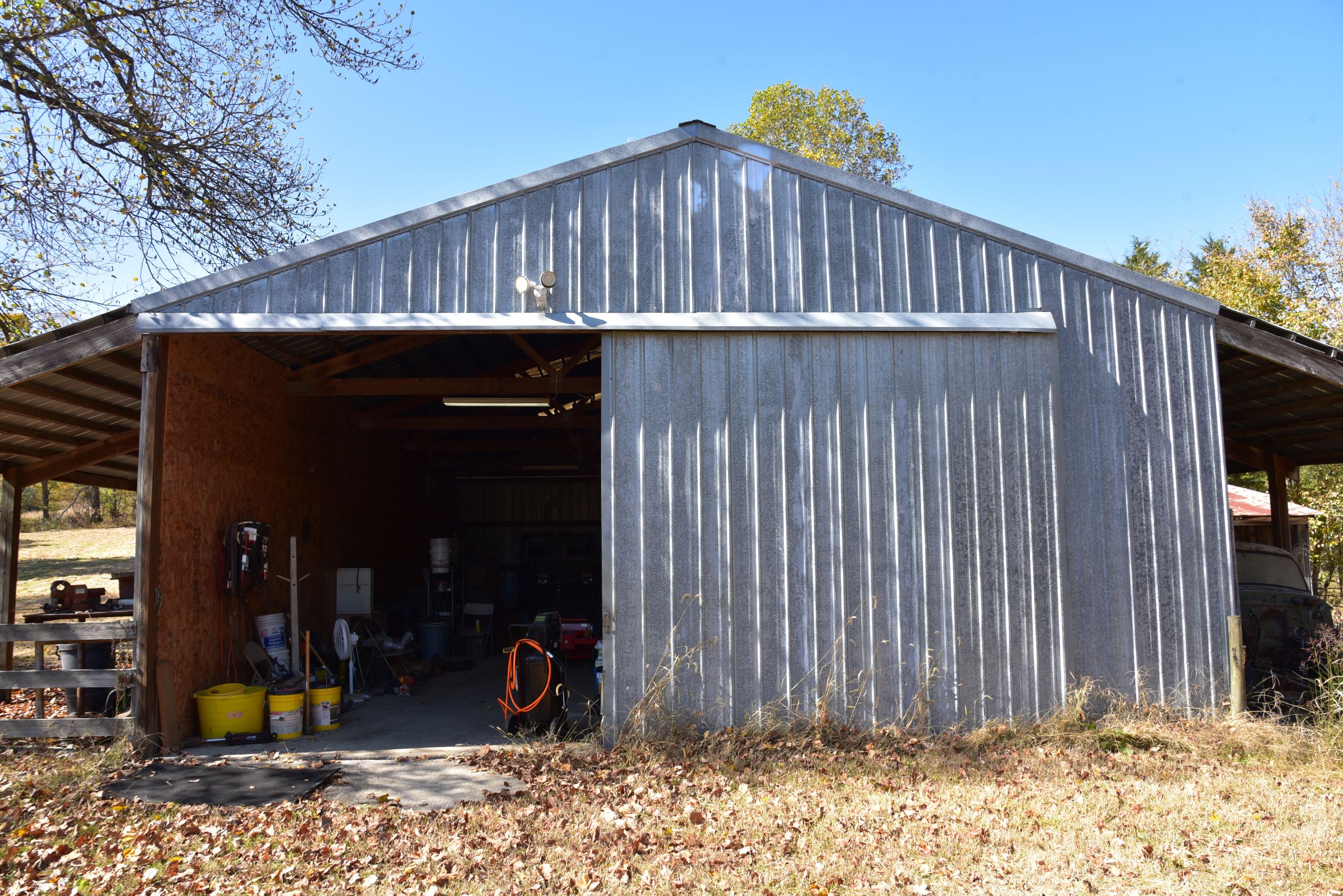 - Large shop with garage doors and lean-to storage