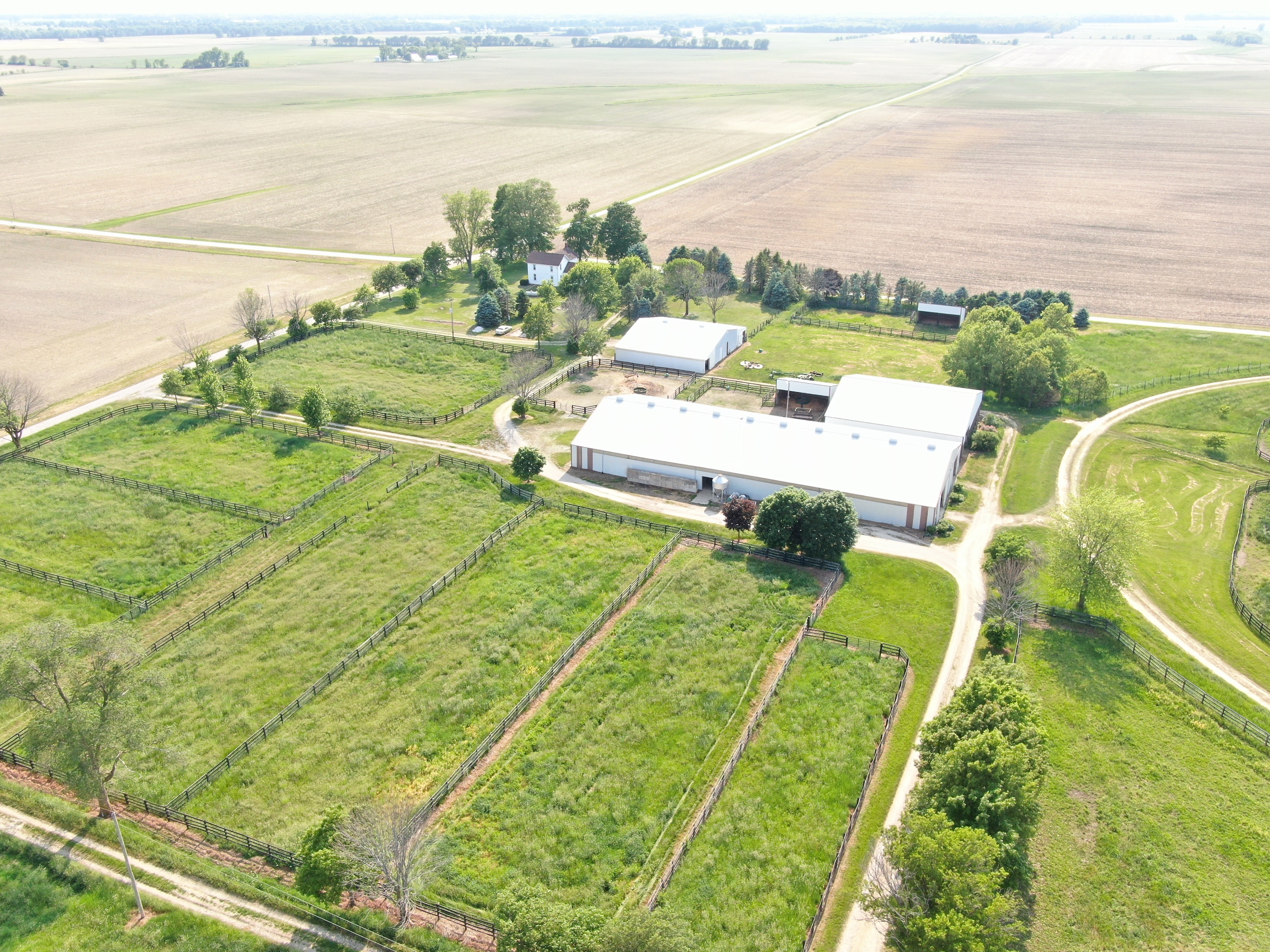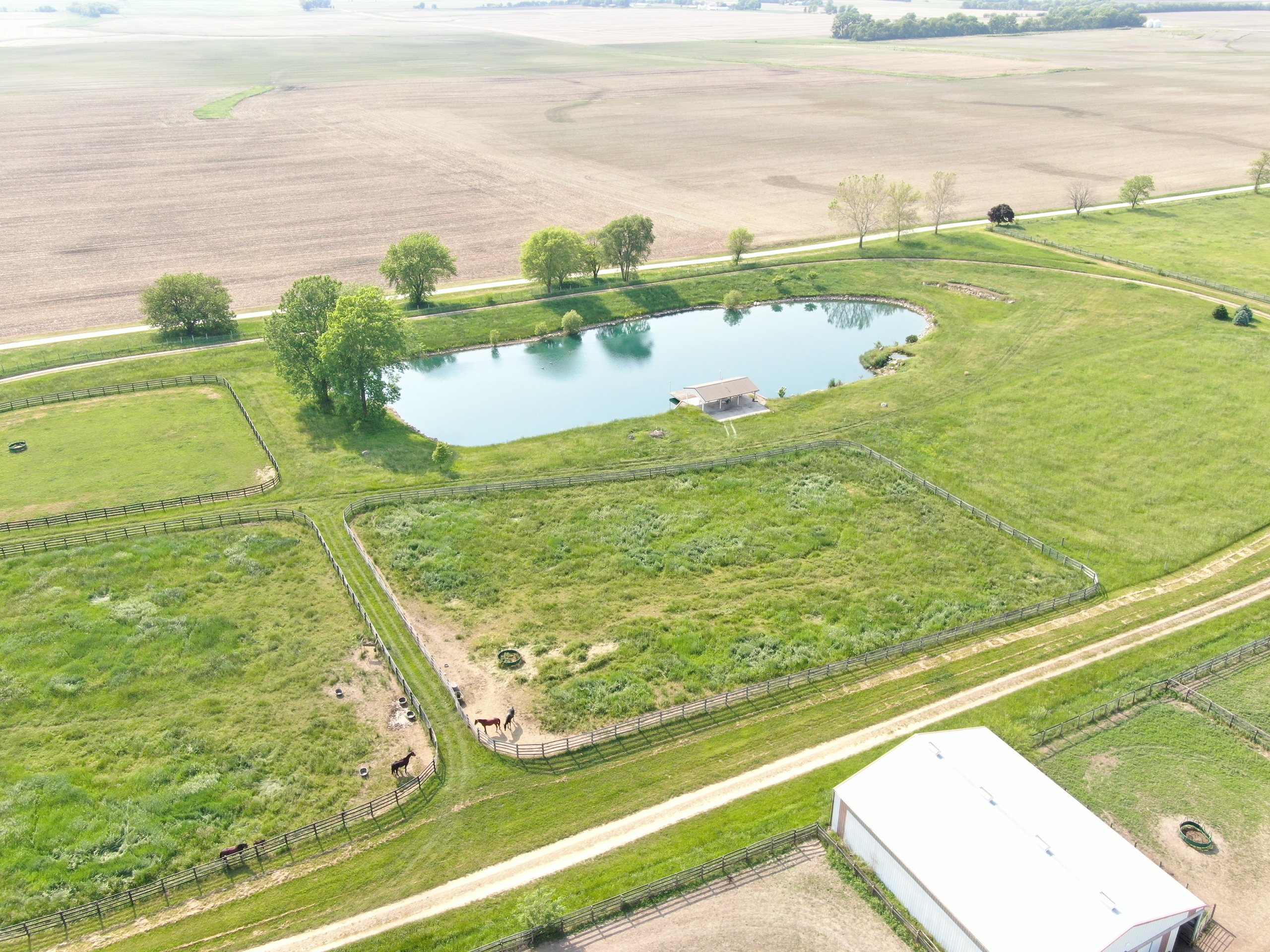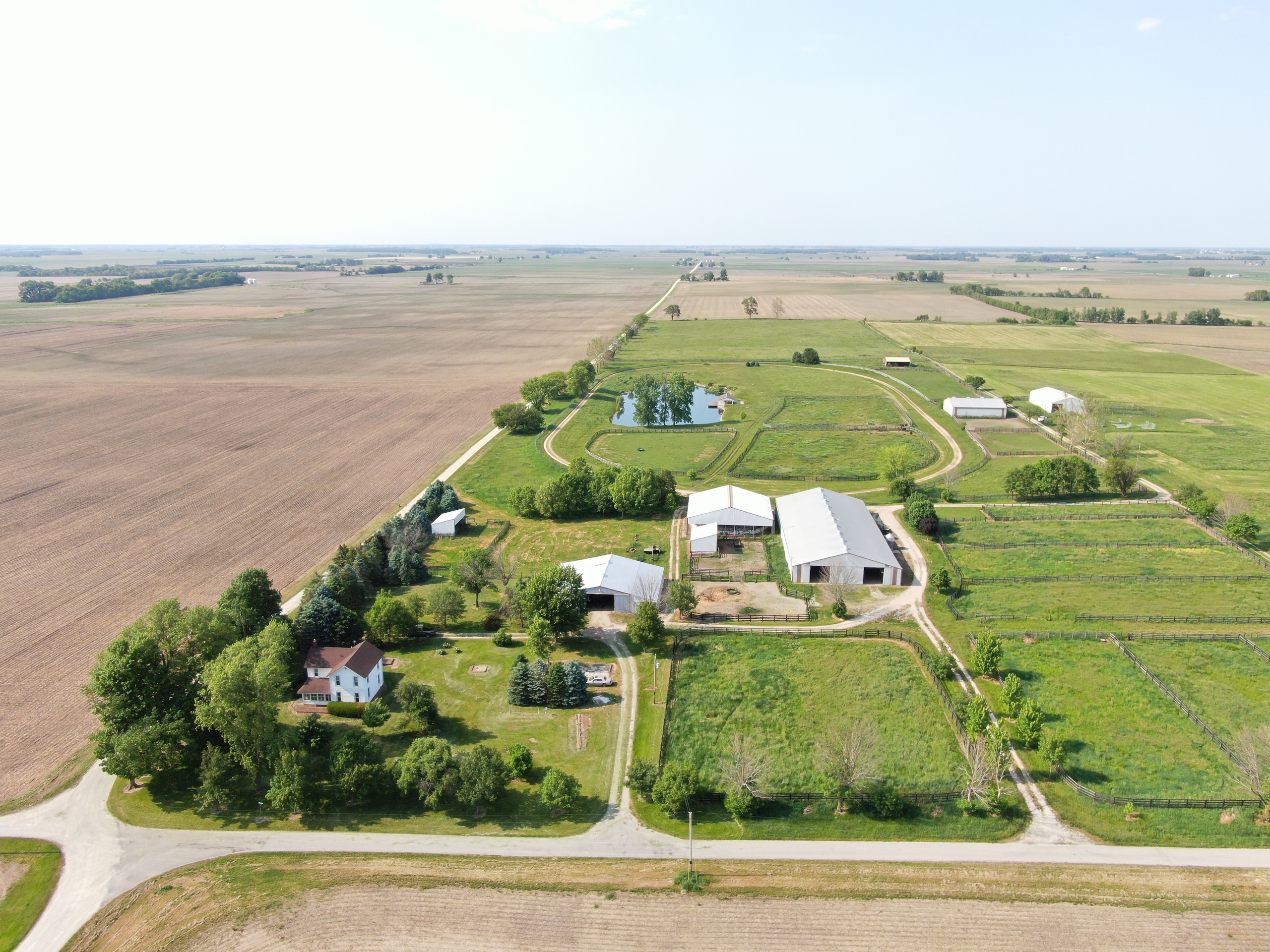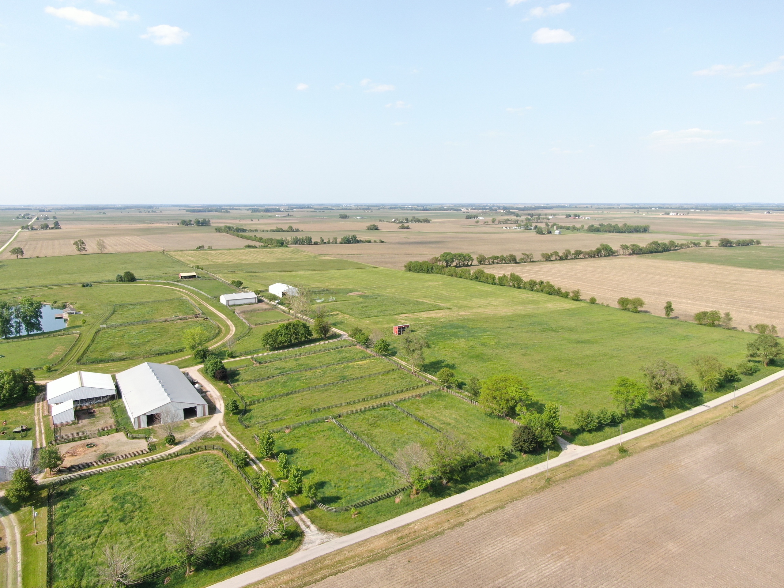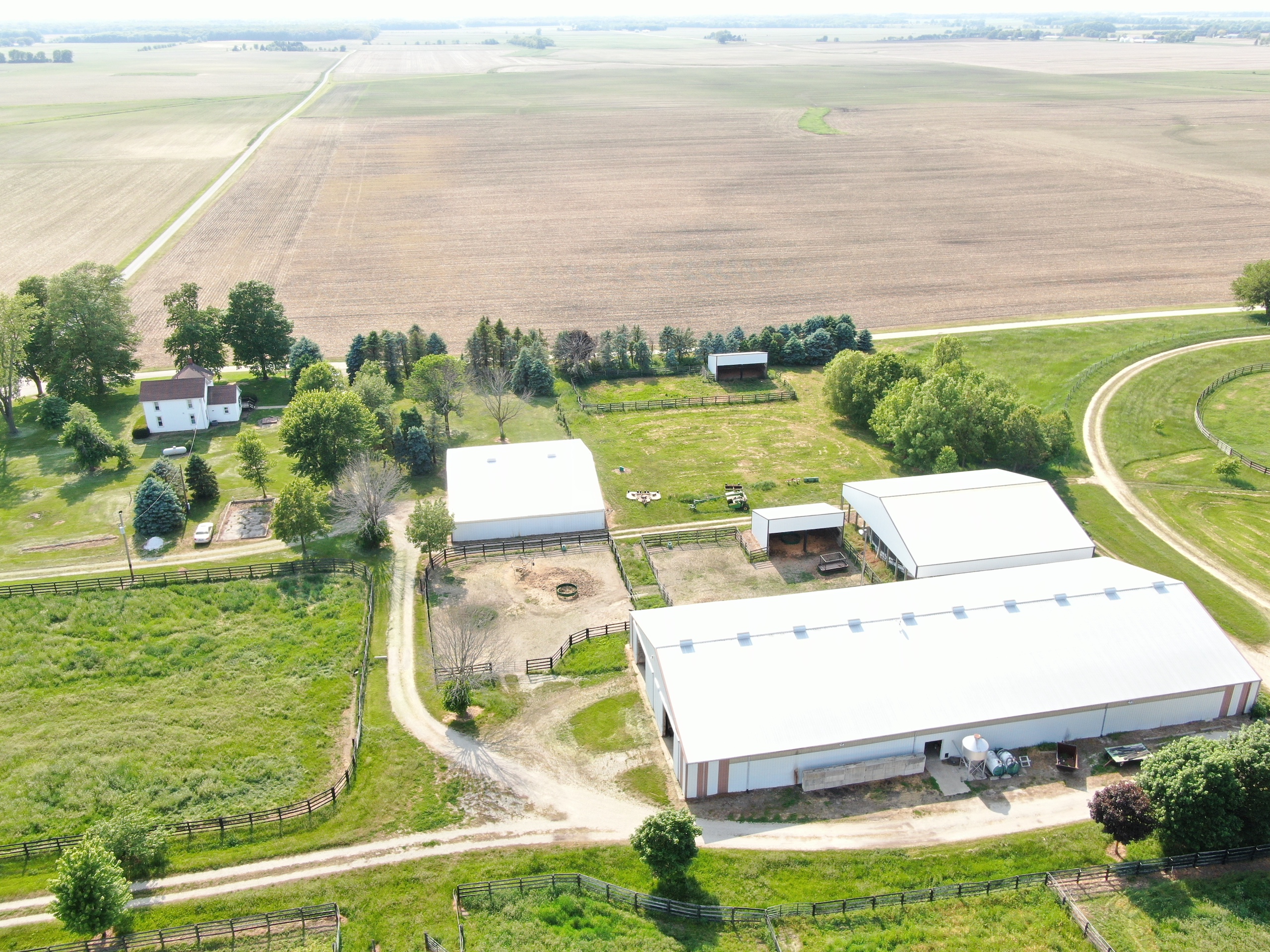 The prestigious Freedom Hill Farm, birthplace and early life home of several stakes caliber and fast class racehorses, is available for sale. The farm has 20 useful-sized paddocks with oak board fences, five larger pastures with moveable fences, and an underground water supply. In addition, there is a 2-acre fishing pond stocked with largemouth bass, bluegill, and channel catfish. A covered picnic area, conveniently located adjacent to the pond, has a cement floor and a large wooden deck extending out over the water. This is the perfect spot to entertain guests or relax while watching the sunset. The farm has a main barn with 51 box stalls, constructed using 2-inch rough-cut oak board walls and fronts. There are underground water supply lines to all stalls, with several that have automatic individual waterers. Eight stalls are larger and used for foaling and to house mares with newborn foals. Six of these stalls are wired for cameras connected by underground coaxial cable to a monitor in the house and monitors in the break room and the barn apartment. The main barn has 14,040 sq. feet of space. It is a pole barn with two drive-through isles, one with a cement floor. It includes hay storage over the stalls with openings to drop hay into each stall from above. The insulated barn and stalls are well-lit and has rooftop ventilators. With four or five horses present, it does not require additional heat to keep water sources from freezing, even on the coldest nights of winter. It remains cool in the summer. This barn is used to house training race horses, finish sale prepping yearlings, rehab horses, foal mares, board horses, and inseminate mares. The barn has a double-stall wash area with hot water. Next to the wash stall area is a half bathroom with an electric wall heater. The main barn has a breeding chute, blacksmith shop, overhead hay storage, office, break and supply room, tack room with clothes washer and drying appliances, and storage space. The second-floor apartment has a kitchen/living room, bedroom, and full bathroom. It has electric heat, a cook stove, a window air conditioner, a satellite T.V. hookup, and a monitor to watch foaling mares. This is an efficient, multi-purpose designed barn. There is a half-mile dirt training track. A tractor shed provides space for various types of equipment and has a workbench and storage space with many shelves. This building has an addition with six stalls for overflow needs and storage use in it. Adjacent to the main barn is a six-horse computer-controlled Odyssey Exerciser. It is under an insulated roof to help shield horses from extreme heat in the summer. It can be used as a hot walker, and because of the electronic speed control, it can be used to condition race horses and muscle-up sale horses. The 4,104 sq. feet main yearling barn is divided into two run-in areas, each with an automatic waterer. One side is used for fillies, and the other for male colts. Between the two sides is a complex of gates designed to safely and efficiently handle individual yearlings for grooming, training, and veterinary access. The gates allow yearlings to be separated and put into a handling chute by one person. The chute is made of a 2-inch round pipe for safely handling and inspecting yearlings. Hay is stored above the center aisle complex to feed each run-in area easily. In addition to the yearling barn, there is a second yearling barn across the lane. It is a two-lot run-in barn with lights and automatic waterers to handle excess yearlings. Built-in grain and hay feeders are also located in each run-in area. This barn has a drive-through lane to park horse trailers or other equipment. The barn is currently used for hay storage but was initially constructed as a horse-run-in barn. There is another small lot with a run-in barn in addition to those already described. Underground water lines supply outdoor hydrants in most strategic locations. This property also features a historic home built in the late 1800s. The main level is comprised of the kitchen, living room, one full bathroom, and a half bath. The upstairs has three bedrooms. The basement houses the HVAC system and water heater. For additional information or to visit the facility, please get in touch with Adam Crumrin at Whitetail Properties Real Estate at (217) 276-2334.