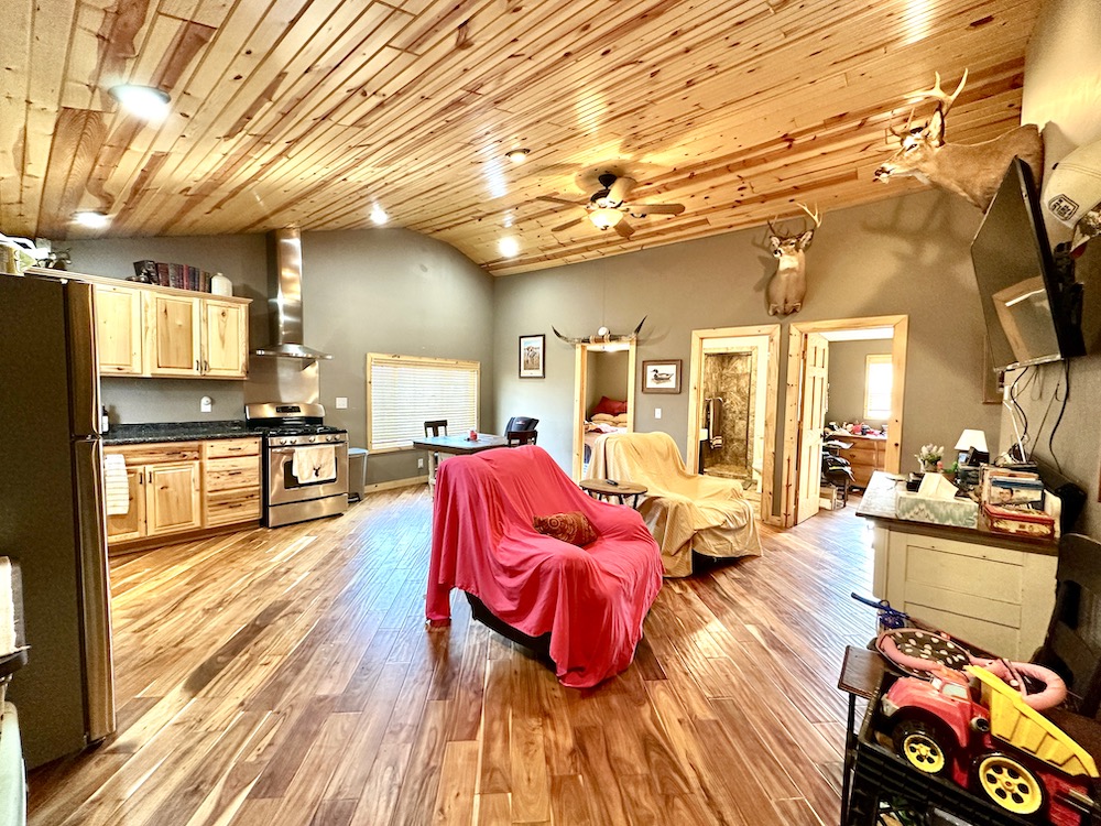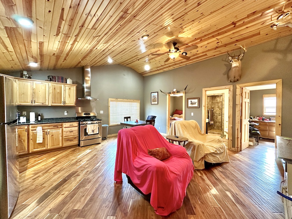 - Garage next to cabin offers storage and built in walk-in cooler