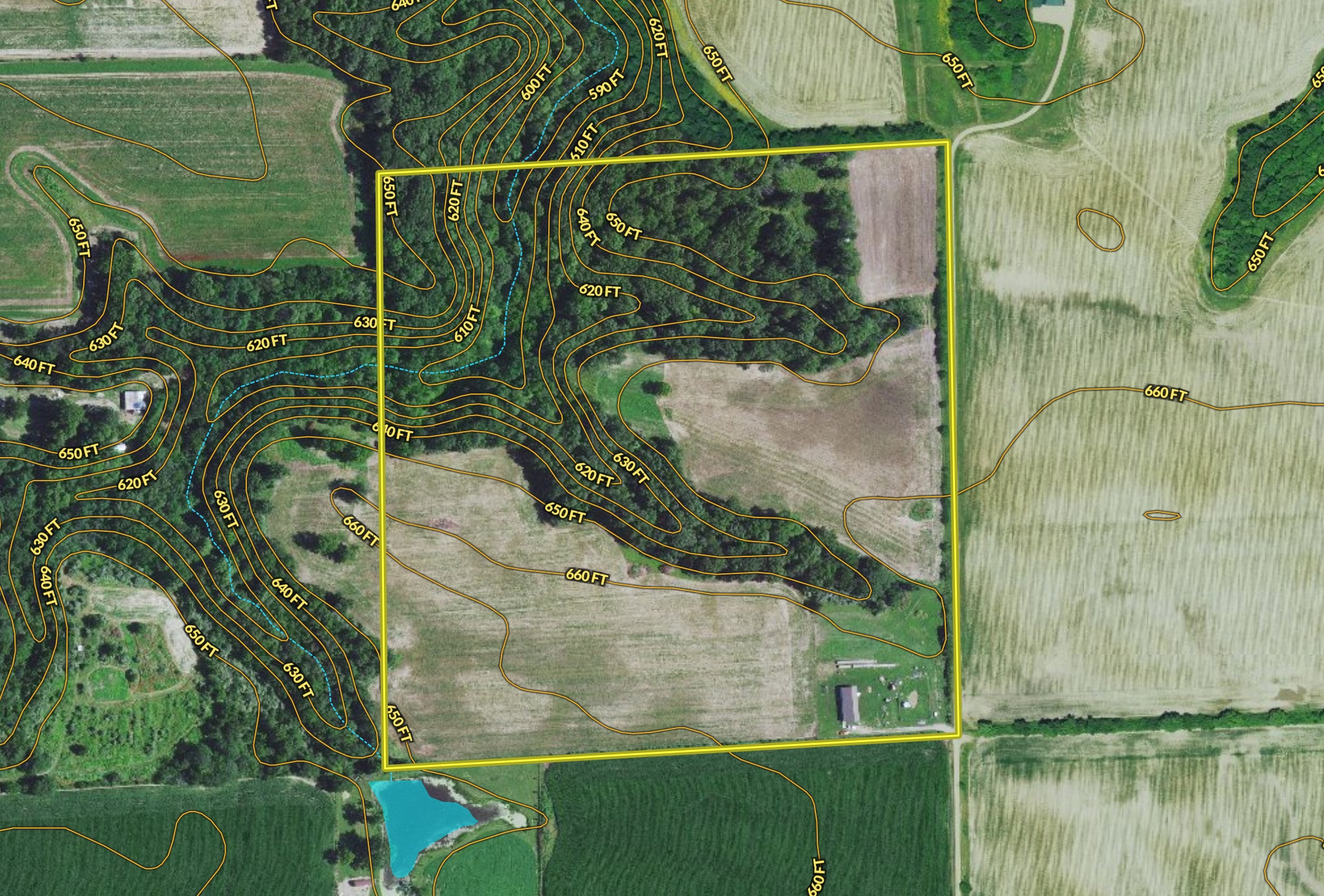 - Mixed hardwoods with rolling topography and creek