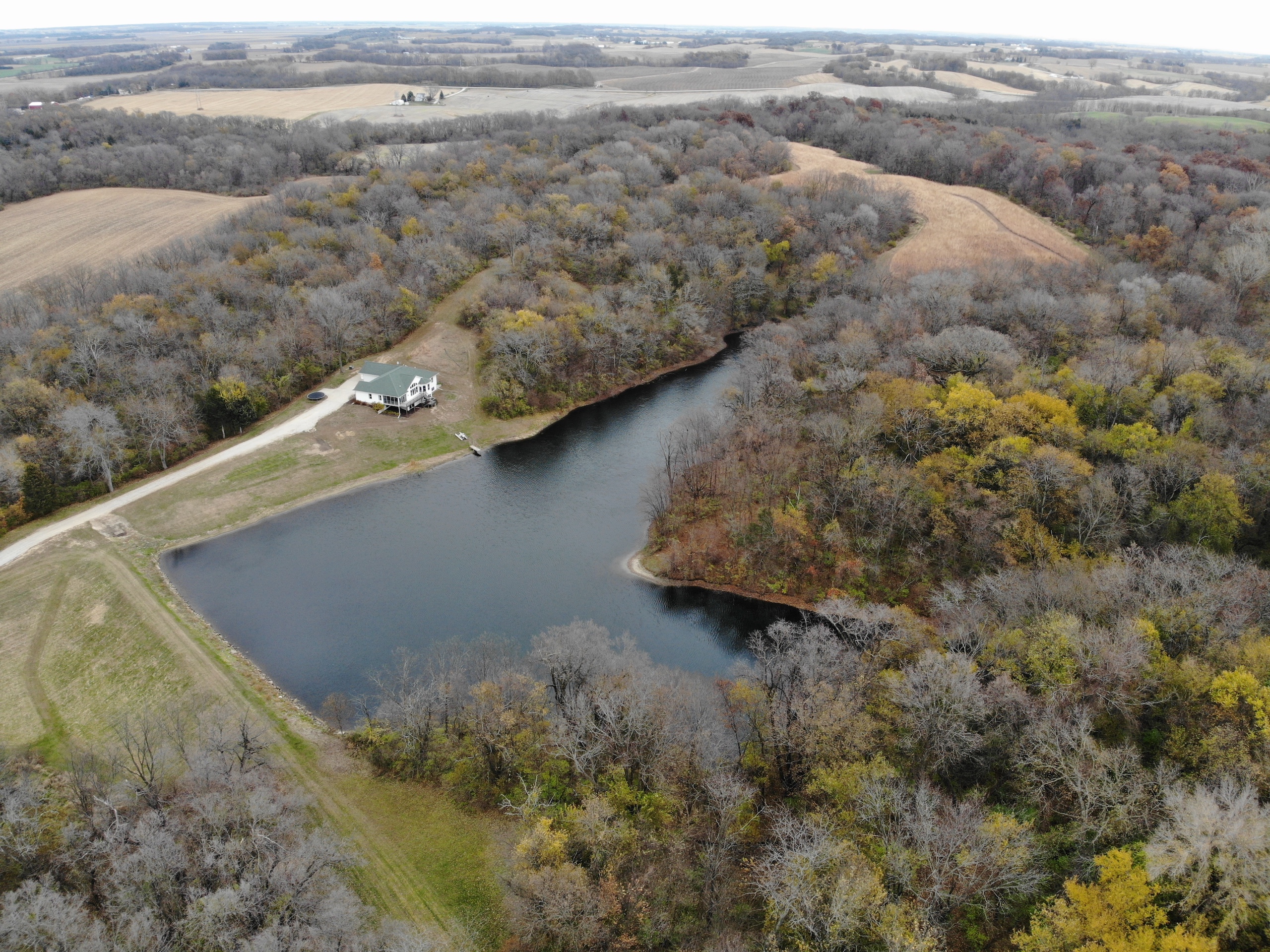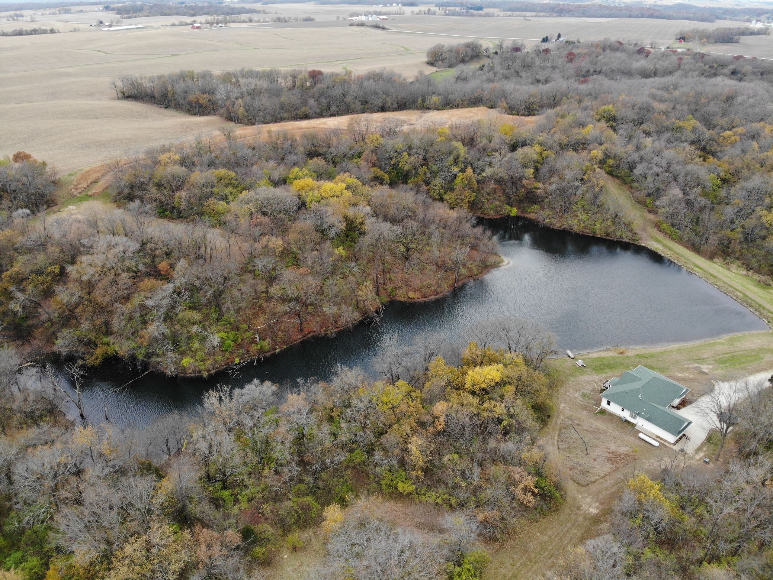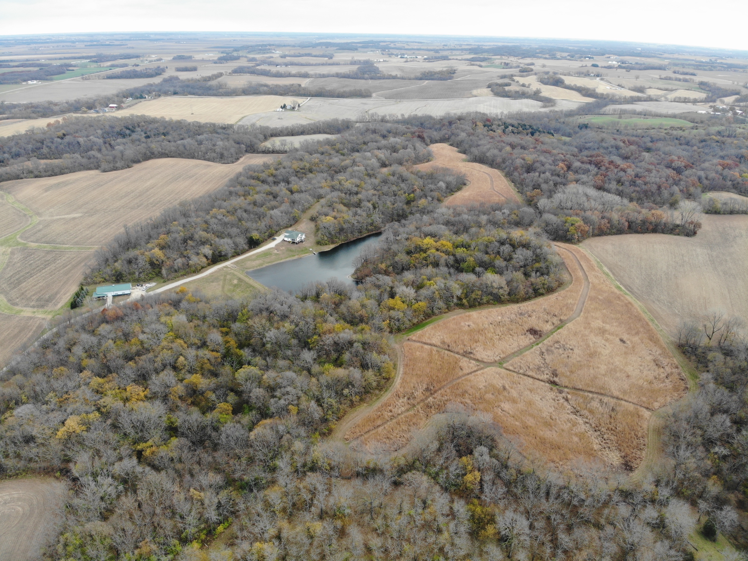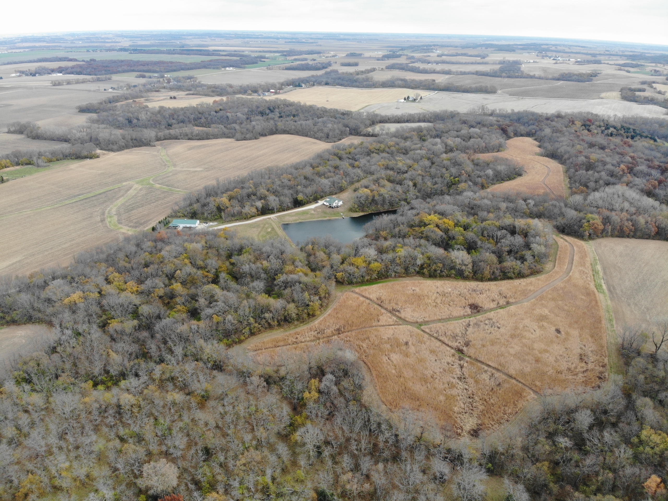 If you are in the market for a recreational property with a custom-built home in an extremely secluded location, this property will be at the top of your list to see, as it offers way more than your traditional property! The 1,890 sq ft home was constructed in 2013 by renowned builder Hazelwood Homes and features a full basement and a 2-car attached garage. The main level of the home features the master suite, with an exceptional master bathroom, living area, beautiful kitchen, formal dining room, laundry room and two additional bedrooms. The living area and master bedroom also have access to the attached deck that offers one of the most beautiful views overlooking the 3-acre pond. The basement is mostly unfinished, but does offer several options for storage, additional living space, bedrooms, man cave and more! There is a concrete room in the basement where you can store your important keepsakes, and there is also a large storage room that houses the furnace and water softener. There is plumbing roughed in the floor to accommodate an additional bathroom, a bar, and has access outside below the deck overlooking the pond. The pond is extremely clear, and is fully stocked with largemouth bass, bluegill, redear sunfish, and catfish. The pond offers excellent fishing and is also a key water source for the local deer herd and the waterfowl enjoy flocking to it as well. Just down the driveway from the home is the ultimate shop building! This 42’ X 82’ building was built by Morton Buildings in 2008 and has everything a homeowner needs from full concrete, wrap-around porch, large overhead doors, dual zone in-floor heat, hot and cold water, septic, and acoustic ceilings to keep the noise to a minimum. It also features additional space that could be used as guest quarters. The remainder of the property is made up of timber and approximately 18 acres of open fields that create prime habitat to hunt mature deer in the fall, and strutting turkeys in the spring. 8.71 acres are enrolled in a CRP program through September 2030 and pays $1,300 annually. The remaining field could be used as wildlife habitat, livestock, hay, food plots, or a mixture of all. The property also has numerous trails within making access easy by ATV or side by side. If you’re in the market for an absolutely beautiful, move-in-ready property with many appealing features. Give the listing agent a call today for your private showing or for additional information.