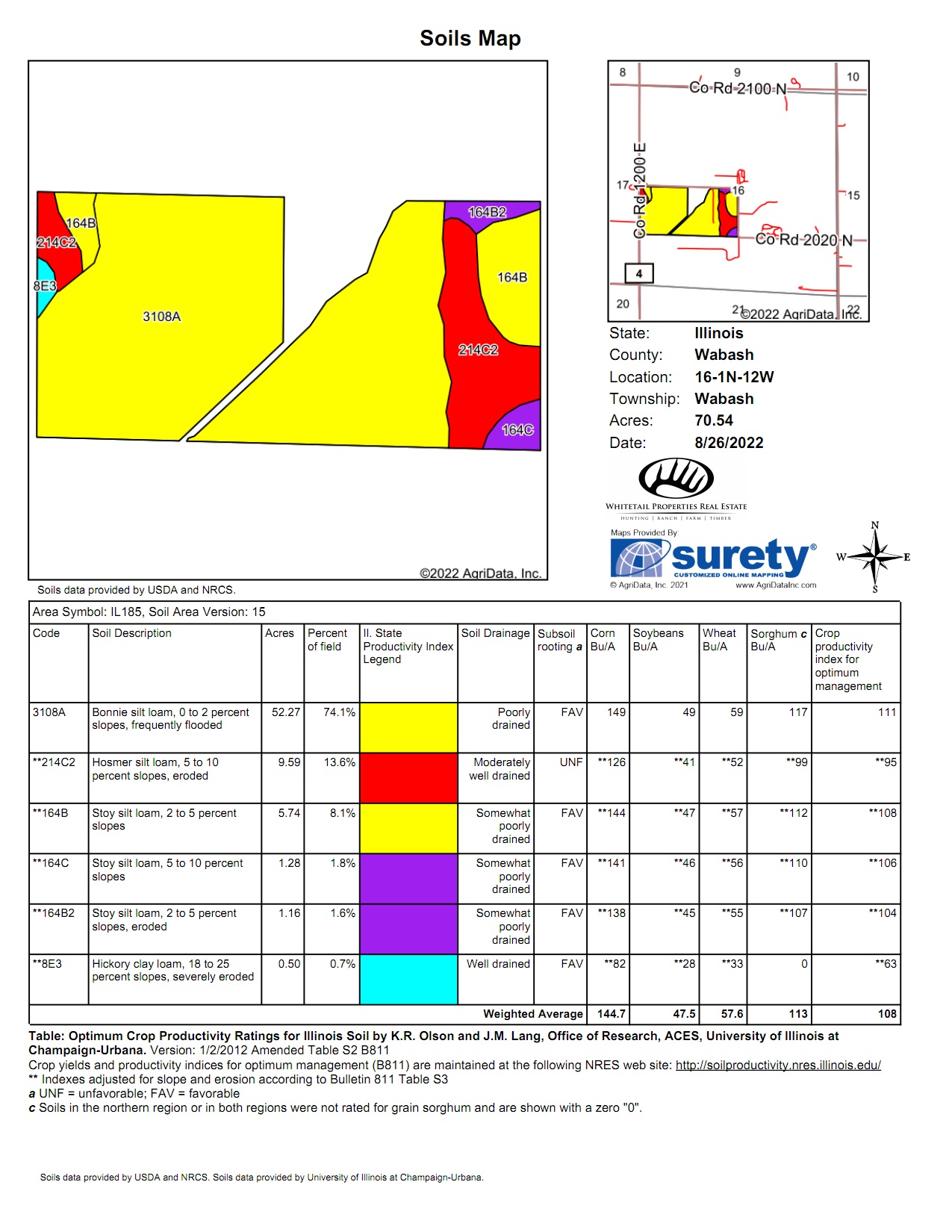 This mostly tillable tract is located southwest of Allendale, at the intersection of CR 2050 N and CR 1200 E. The average PI is 108 with the majority of the soil being Bonnie silt loam and Hosmer silt loam. The farm is under a farming contract for the 2023 farming season. Contact Listing Agents and Land Specialists Josh Malong and Adam Crumrin for more information or to schedule a showing.