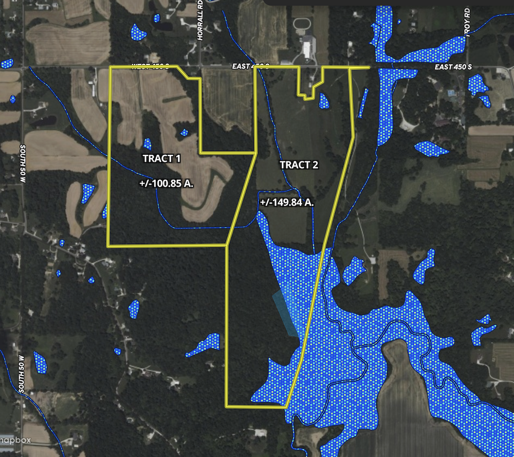 Tract 1: This 100.85± acre offering presents a balanced mix of productive farmland and bottomland timber, located just minutes from Washington, Indiana. The property consists of approximately 52.1 acres of FSA tillable ground and 48.75± acres of wooded bottomland, making it well-suited for agriculture, recreation, investment, or a future rural homesite. Nearly 1,000 feet of paved road frontage provides excellent access, with water, electric, fiber, and gas available along the road. The tillable acreage features productive soils currently in crop production, offering immediate income potential. The remaining acreage transitions into wooded edges and bottomland timber, creating natural habitat diversity and visual separation from the road. A pond situated near the timberline enhances both recreational and aesthetic value, while the wooded acreage supports a variety of wildlife, including deer and turkey. The mix of open ground, water, and timber creates an ideal setup for hunting, recreation, or long-term land stewardship. The size and layout of the property allow for multiple potential build sites, whether near the road frontage or tucked back near the woods for added privacy. Investors may also recognize the future potential for subdivision or continued agricultural use. The location offers a rare blend of privacy and convenience. Washington is only minutes away from shopping, schools, and services. Vincennes lies approximately 30 miles west, Jasper about 40 miles east, and Interstate 69 provides efficient access to Evansville and Bloomington. This tract is part of a larger 250.6± acre offering, but is available for purchase individually. A new survey will be provided. Seller-owned mineral rights convey. Possession will be delivered at closing, subject to the existing tenant's rights for the 2025 crop year, with an open tenancy beginning in 2026.