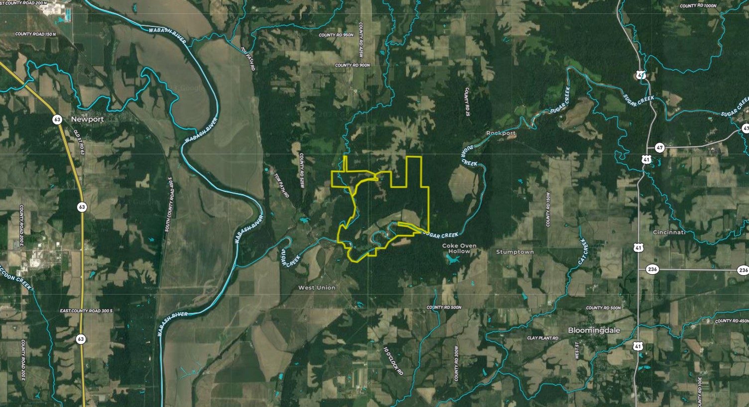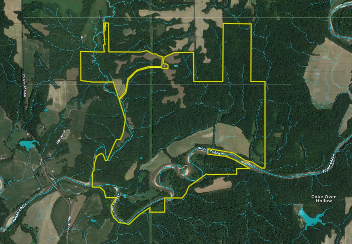 Wow! Properties of this size rarely ever come on the market. This is a legacy property, a once-in-a-lifetime opportunity to own over a thousand acres in beautiful Parke County. This property has it all, from seclusion to rolling mature hardwoods, a creek, scattered food plots, lots of edge and diversity, not to mention over 2.5 miles of beautiful Sugar Creek frontage. Talk about being in the right neighborhood, this is a big buck-producing property, and it's large enough that one could manage their own deer herd. An internal road leads all the way back to a small cabin/hunting lodge that has water, electric and septic. The lodge is small but perfect for getting out of the elements and having a place to stay on weekends and enjoy with family and friends. They are a couple of small barns perfect for storing equipment and ATVs/4 wheelers. An established trail system allows for accessing most areas of the property. There are numerous handmade wooden blinds overlooking established food plots and wooden ladder stands in place at proven pinch points, funnels and travel corridors. The clear Rush Creek flows through the property, providing a year-round water source for all types of wildlife as well as spectacular views, sounds and rock outcroppings along its course. Several scattered fields would make dynamite food plot locations and bedding zones along with the numerous thick ridgetops/hillsides for bedding areas; this allows the resident deer many options to move from feeding to bedding security and allows the deer to spend the vast majority of their time on this one farm. This gives a hunter many options on stand locations and allows areas to remain fresh and lightly hunted. This property provides great hunting for turkey and morels. There is no shortage of gobbling toms and morels on this property every spring. One of the most spectacular things about this property is how much Sugar Creek flows through and borders the property. A little over 2.5 miles of beautiful Sugar Creek frontage not only provides great fishing, especially smallmouth bass but also opportunities for kayaking, canoeing, water-fowl hunting and just simply enjoying the beauty of mother nature at its finest. A property like this may never come on the market again in one's lifetime; call to schedule your own private showing.