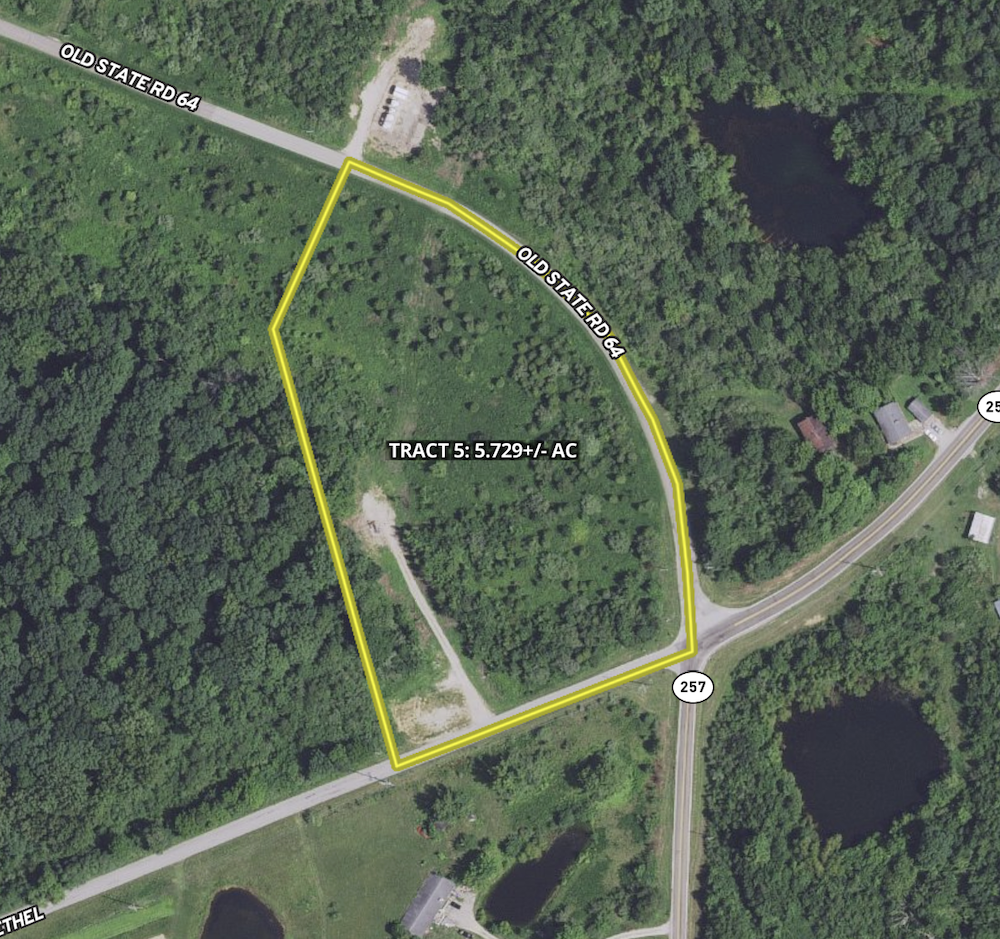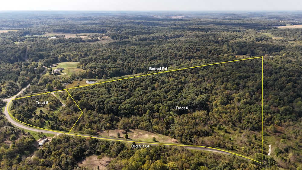 Welcome to Tract 5, an exceptional property with 800 feet of frontage along Old State Road 64 and 380 feet along Bethel Road (County Road 900 S). This tract features a stunning ridge top cabin site, ideal for a weekend retreat, camping spot, or primary home. With ample space for additional structures, including barns and pasture, it’s perfect for a range of uses.
