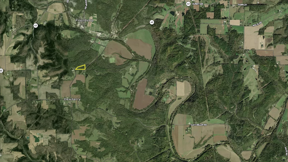 This tract offers a unique opportunity in southeastern Indiana just outside the unincorporated village of Friendship, Indiana, home of the National Muzzle Loading Rifle Association and one of the region’s largest flea markets. The property is fully wooded and features road frontage on two sides, totaling approximately 1,800 feet of frontage, providing accessible entry and multiple potential site locations.