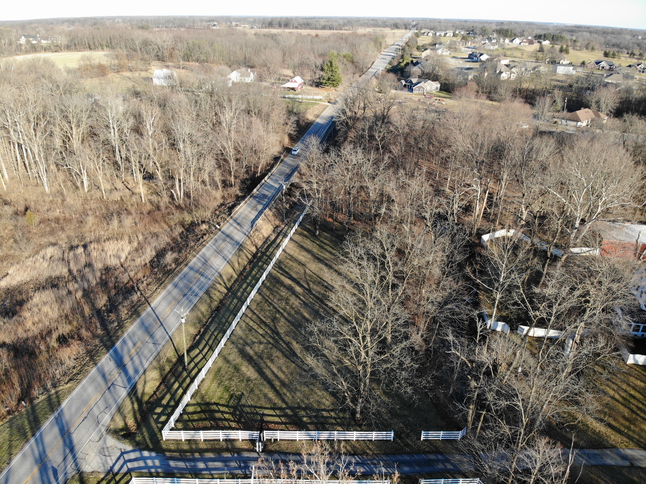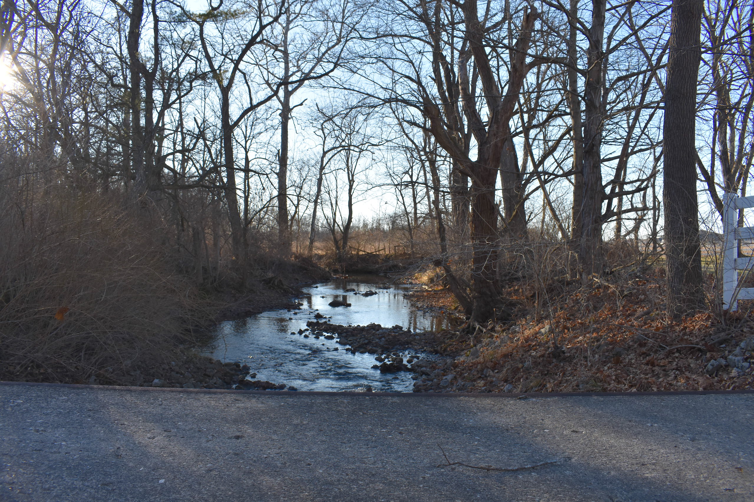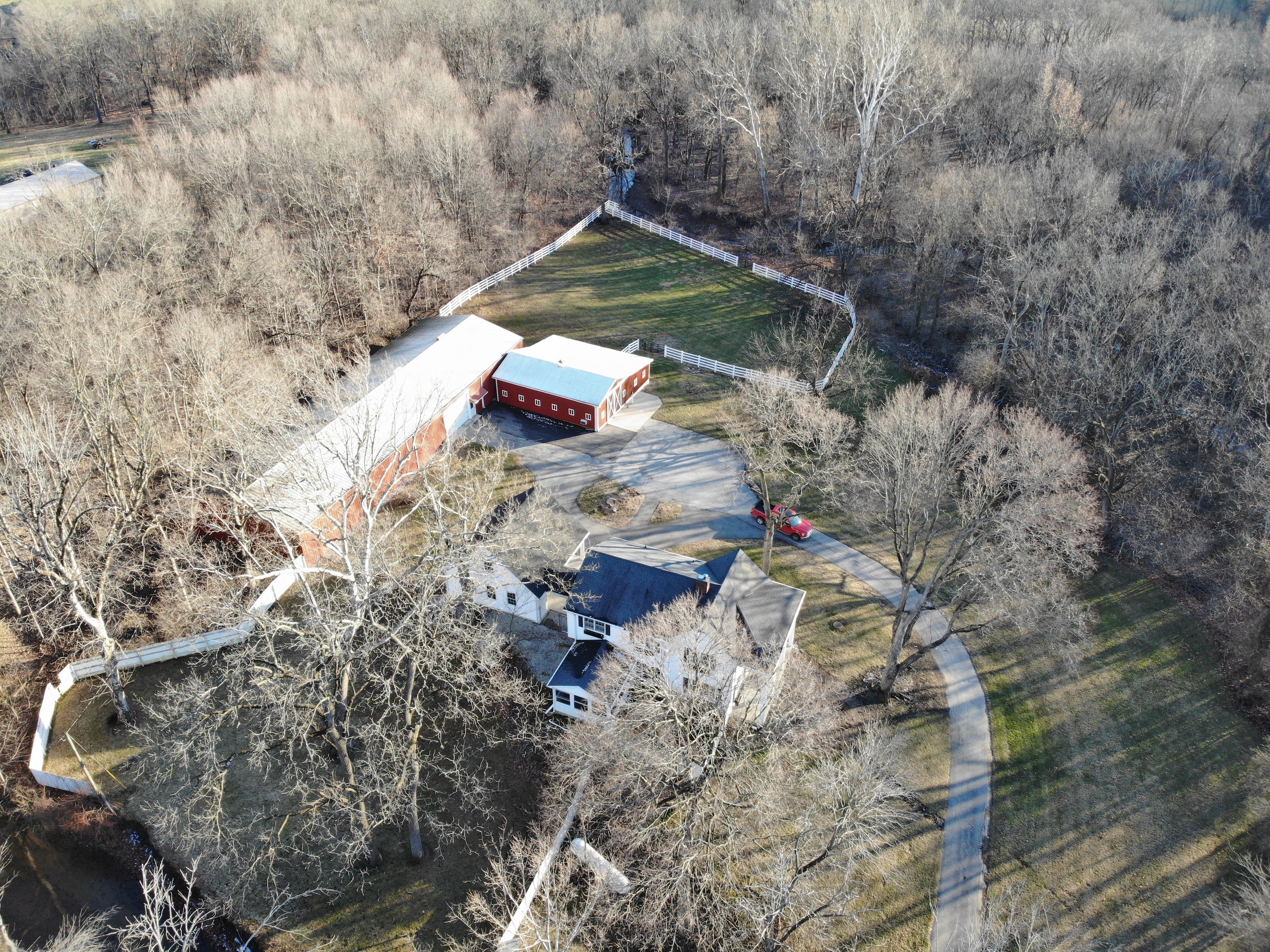 - Charming driveway lined with fence and a bridge crossing over a small creek