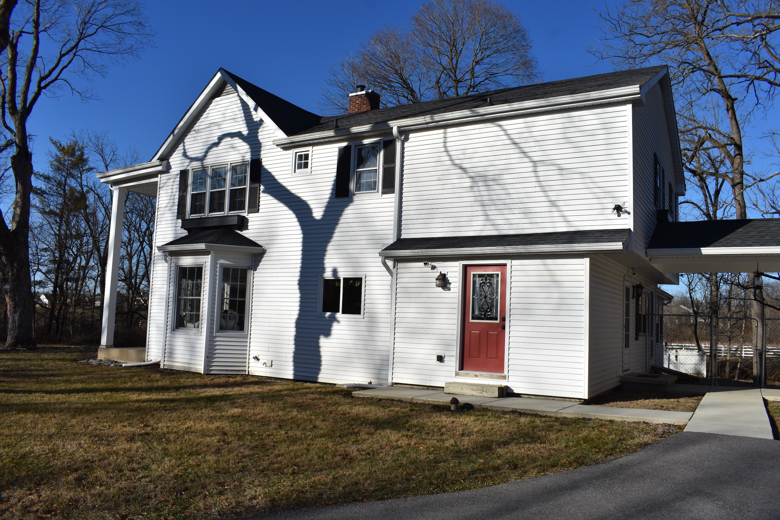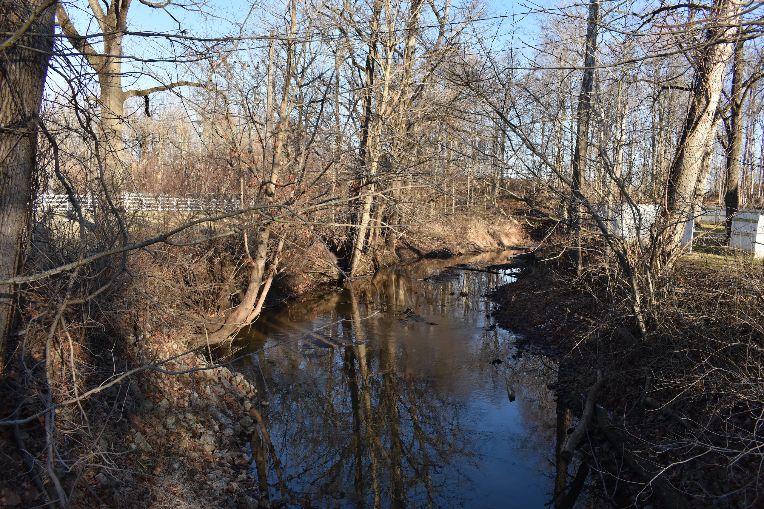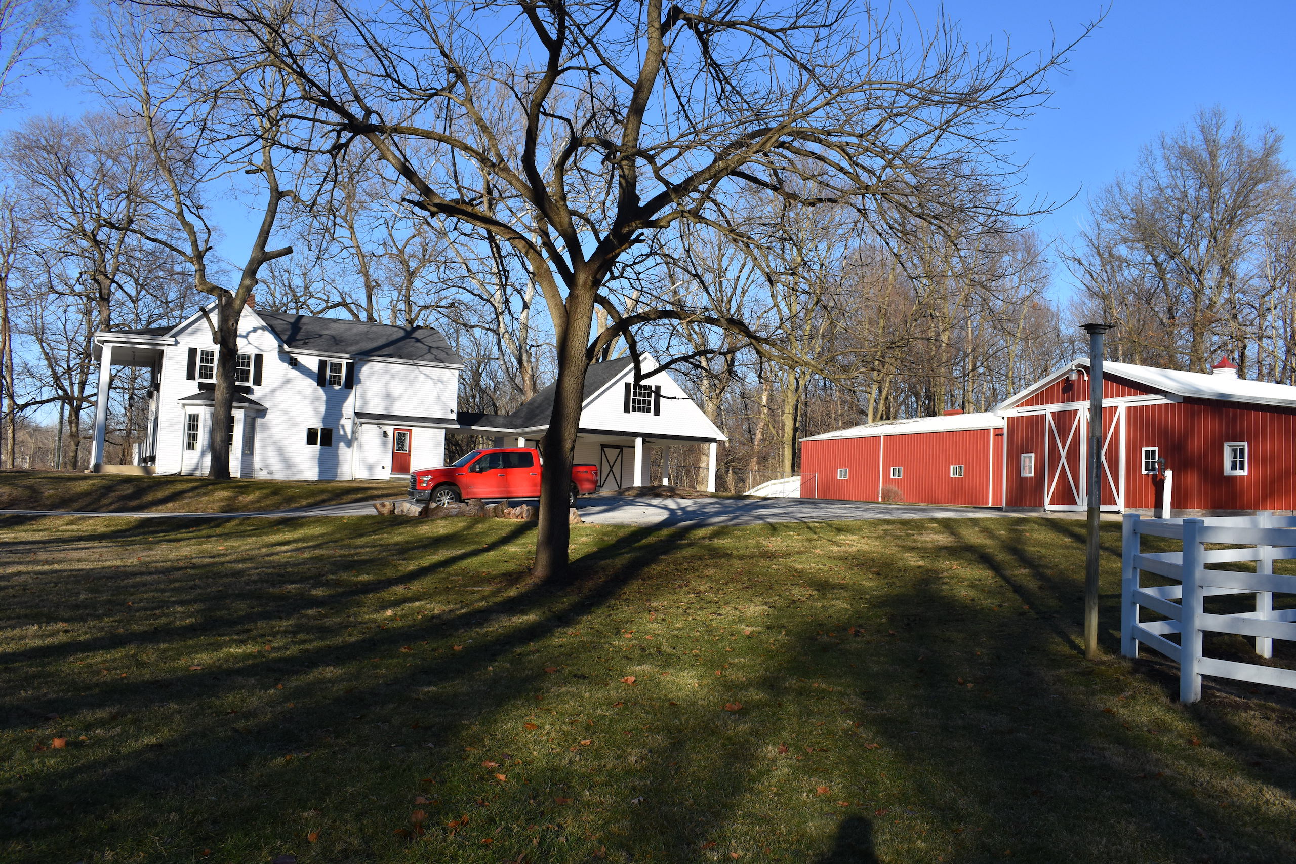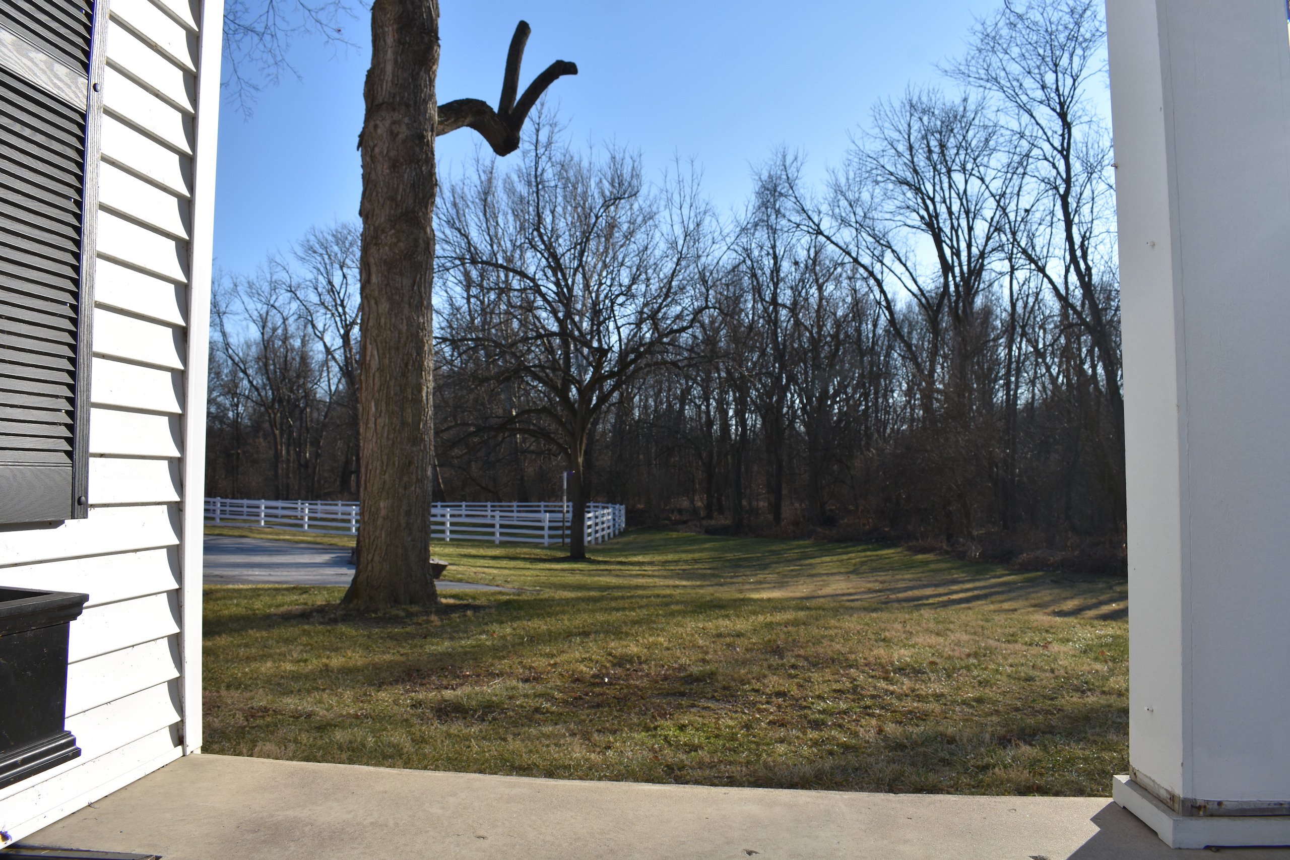 - Charming driveway lined with fence and a bridge crossing over a small creek