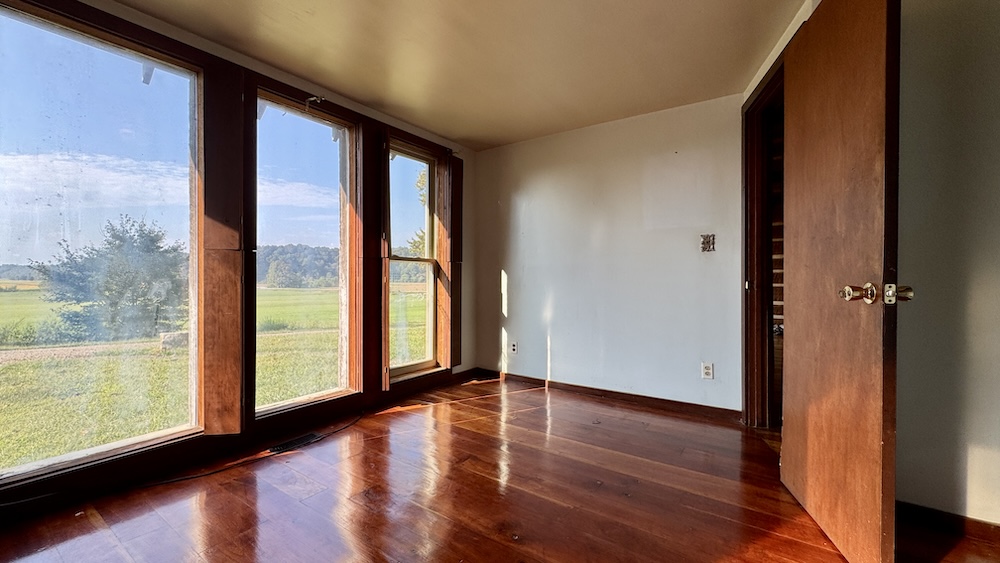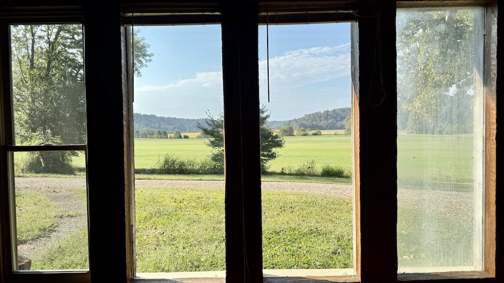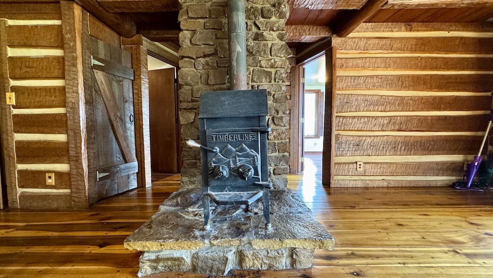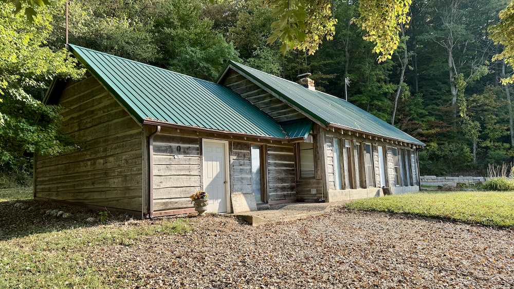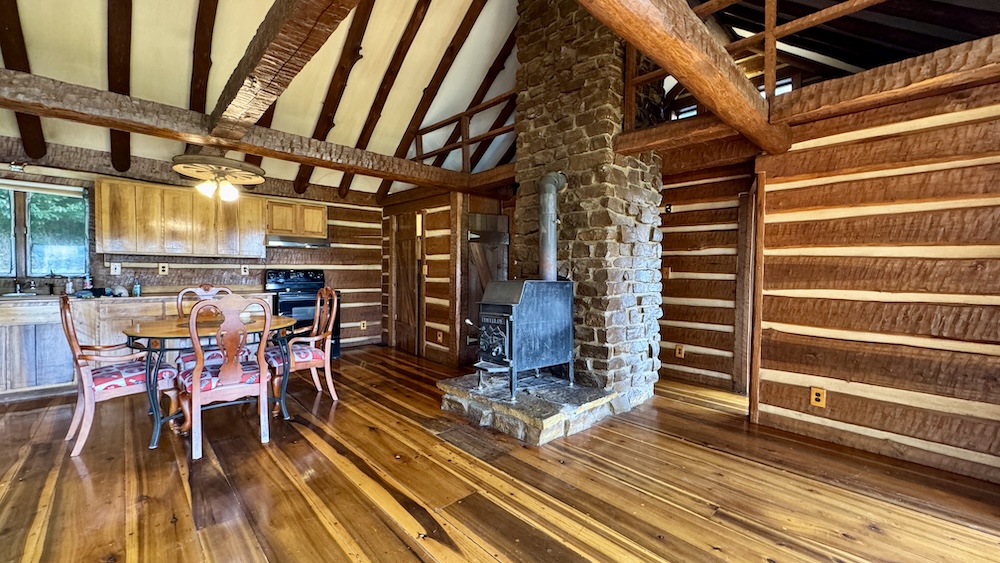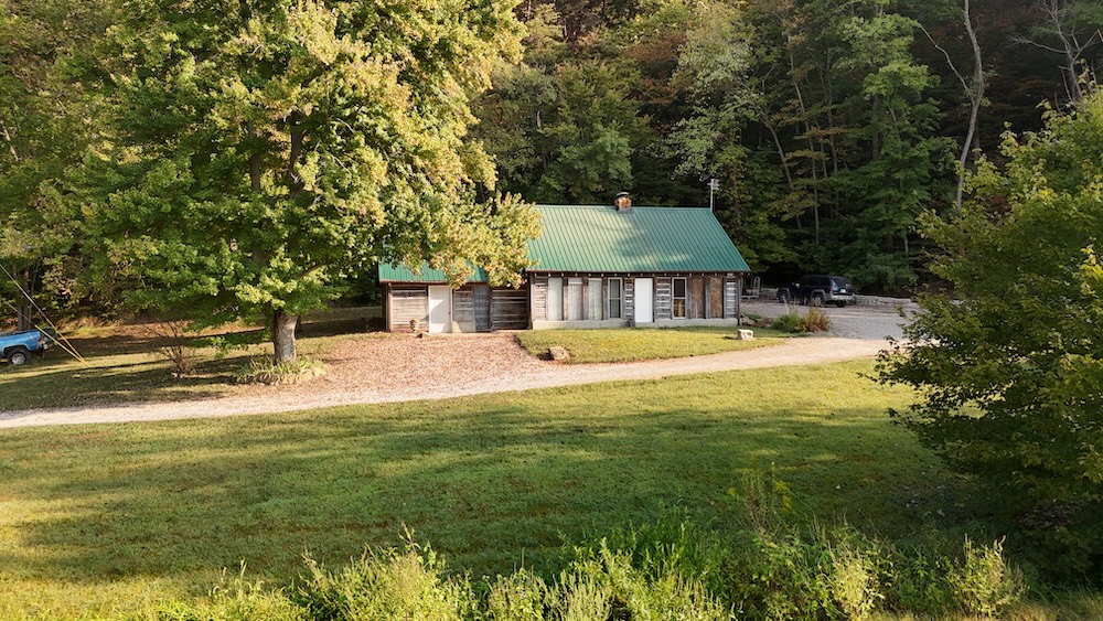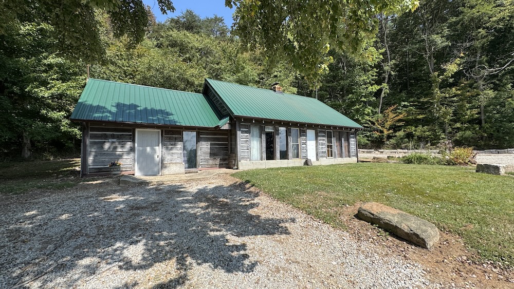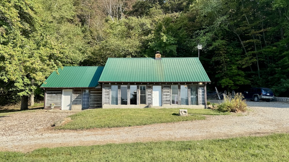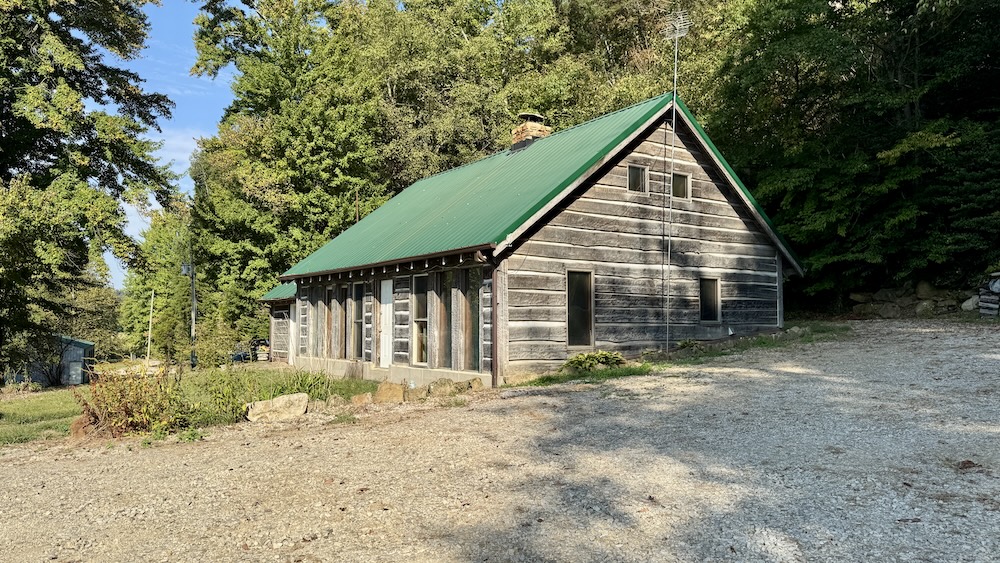 Located in the Buffalo Bottoms region of Washington County, Indiana, this 3-bedroom, 1-bath cabin-style home offers a mix of history, utility, and recreational opportunity. The home was constructed in 1989 to resemble the pioneer cabin that once occupied the same site, combining a traditional aesthetic with modern amenities. The 1,248 sq ft residence has a southern exposure, overlooking a wide valley. Its location provides open views of sunrises, seasonal weather, and the surrounding wildlife habitat. A large window wall in the home brings the outdoors inside, allowing residents to enjoy the changing scenery throughout the year. A central stone fireplace anchors the interior, providing a supplemental heat source during colder months. An electric furnace and central air conditioning provide additional comfort. A private well and septic system serves the property and benefits from Jackson REMC fiber internet service, ensuring reliable connectivity. The property includes a 2,100 sq ft pole barn with spray foam insulation and conditioning. Much of the interior has been finished with barn wood siding and tin ceiling accents. This building offers flexible space that could be adapted for use as a workshop, storage, hunters' lodge, recreational gathering space, or potential short-term rental. Its scale and finish provide both utility and character, complementing the cabin residence.