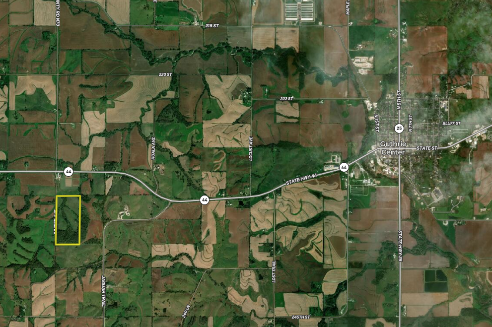- Located ¼ mile south of Hwy 44 on Juniper Avenue (Class B road) and less than 4 miles west of Guthrie Center. Only 56 miles from West Des Moines, 44 miles from Carroll, 92 miles from Council Bluffs and 72 miles from Ames, IA