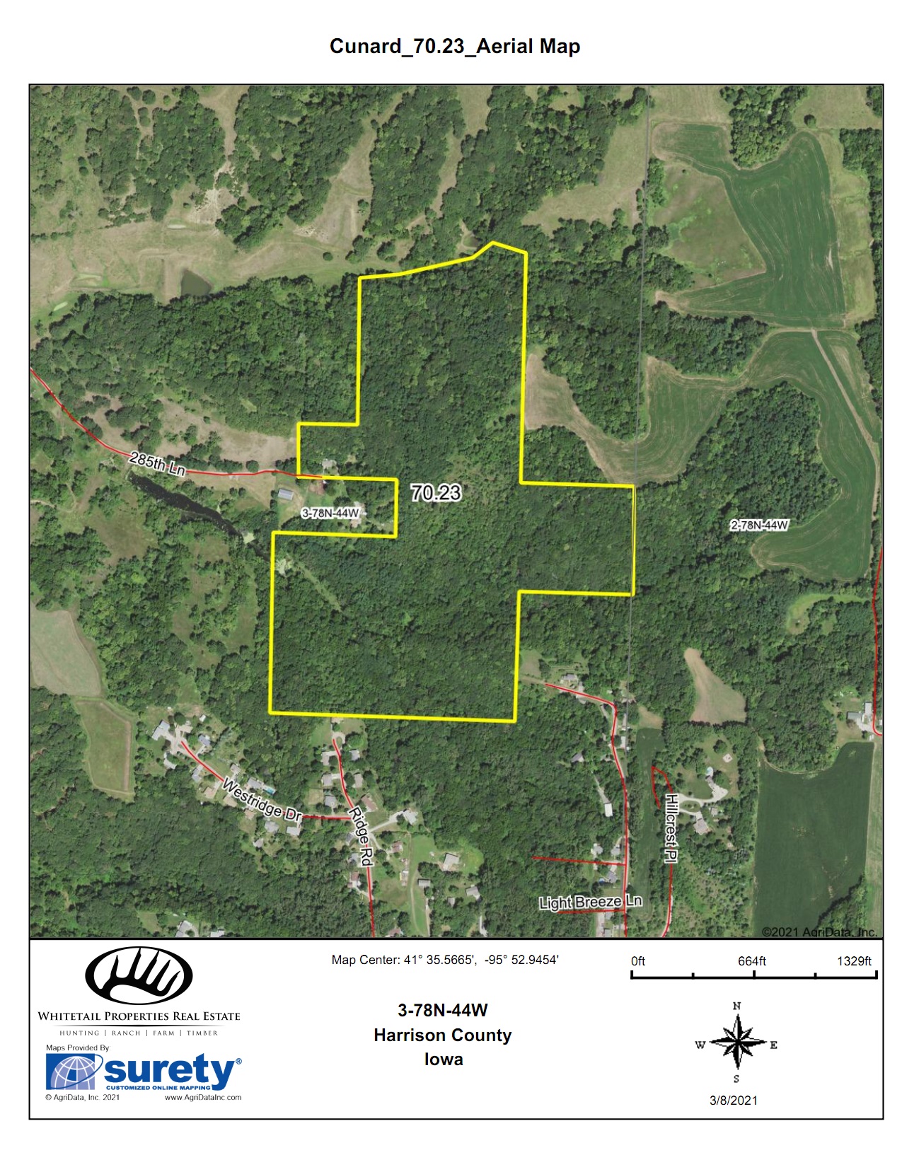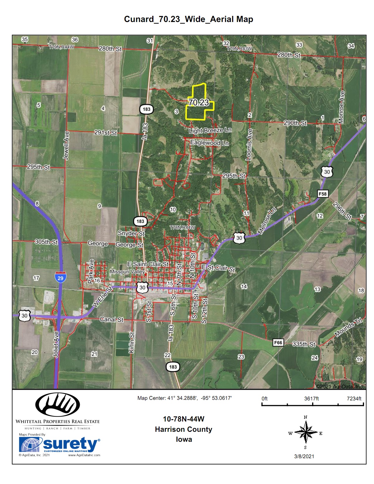 Enjoy the quiet country life at the end of a private drive in this comfortable ranch home. Located only minutes from downtown Missouri Valley, this +70-acre timbered property offers an incredible investment opportunity. Land values have been rapidly increasing, and with this property’s proximity to town, it is sure to be a solid investment. There is a second access point on the southeast end of this property from Light Breeze Lane, which provides the potential to sell a buildable lot or to build your own home in the future.